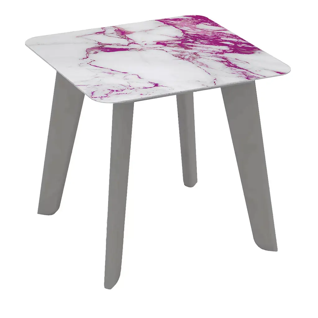 A modern and captivating piece of functional design, this side table boasts a unique top decoration obtained with the use of Vetrite, a Sicis-patented material composed of glass slabs made of special polymer, creating a marble-like veining. Marked by a vivid pink hue, the top rests on wooden legs lacquered in a satin white metal finish. Also available in a polished version upon request, please contact the Concierge for details.