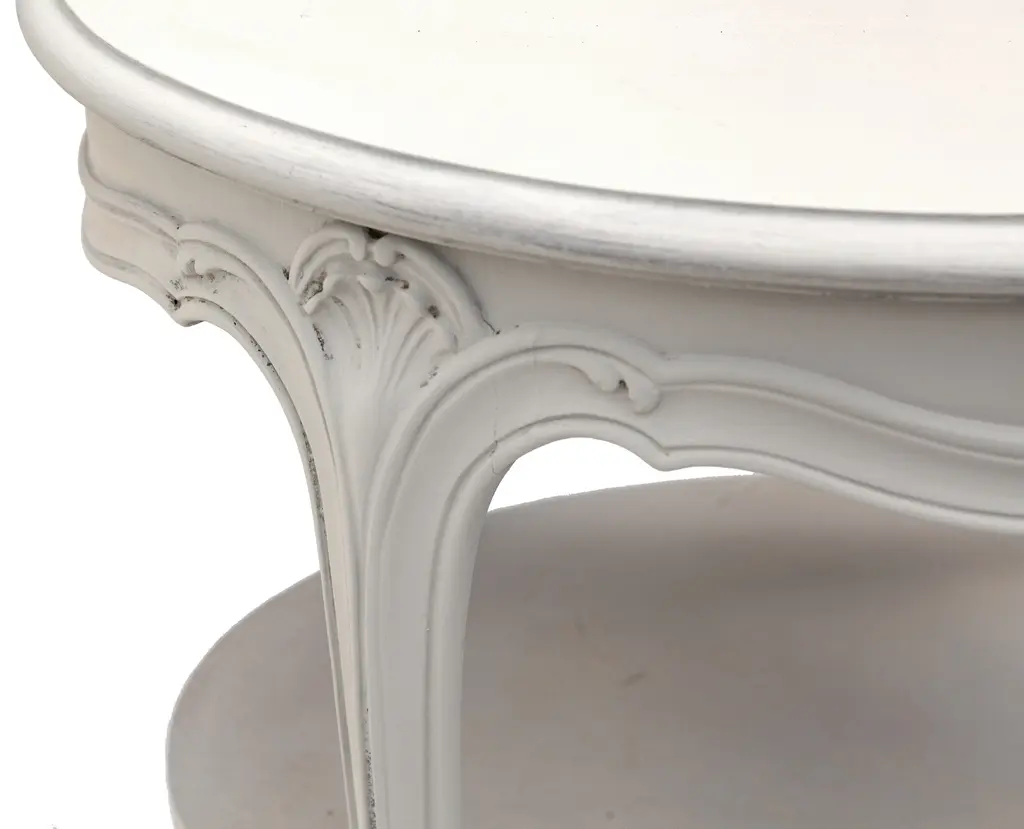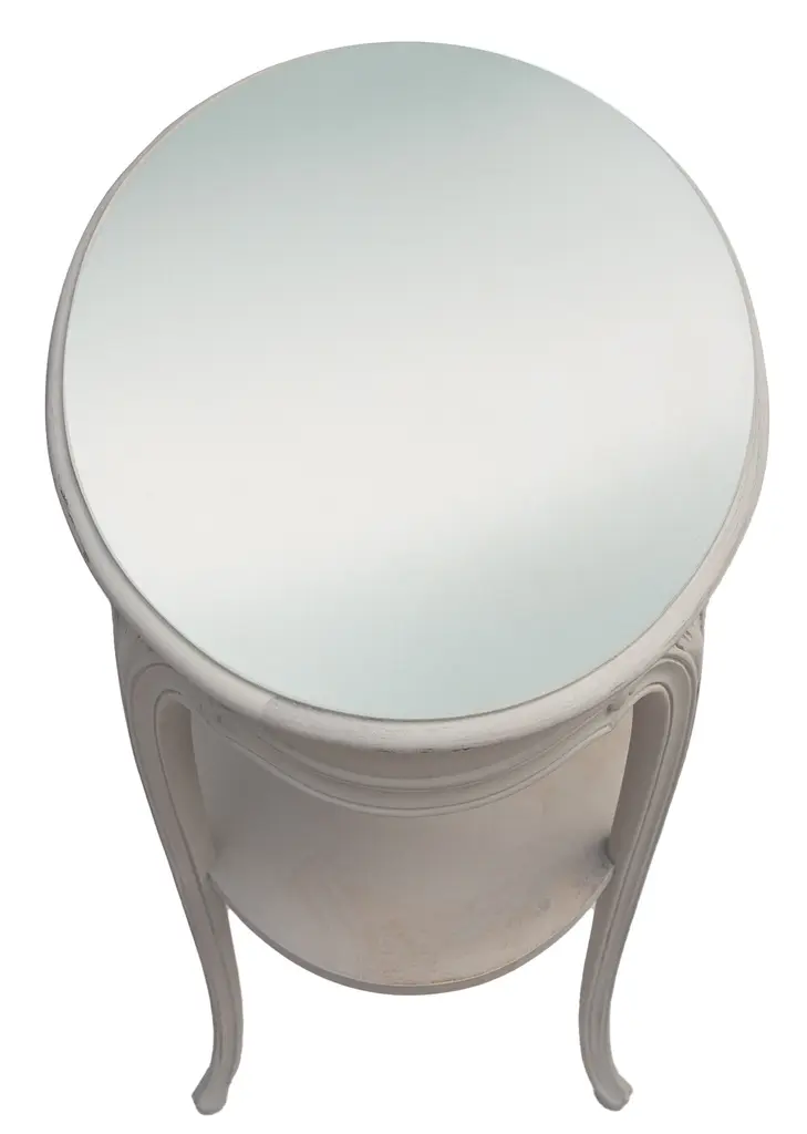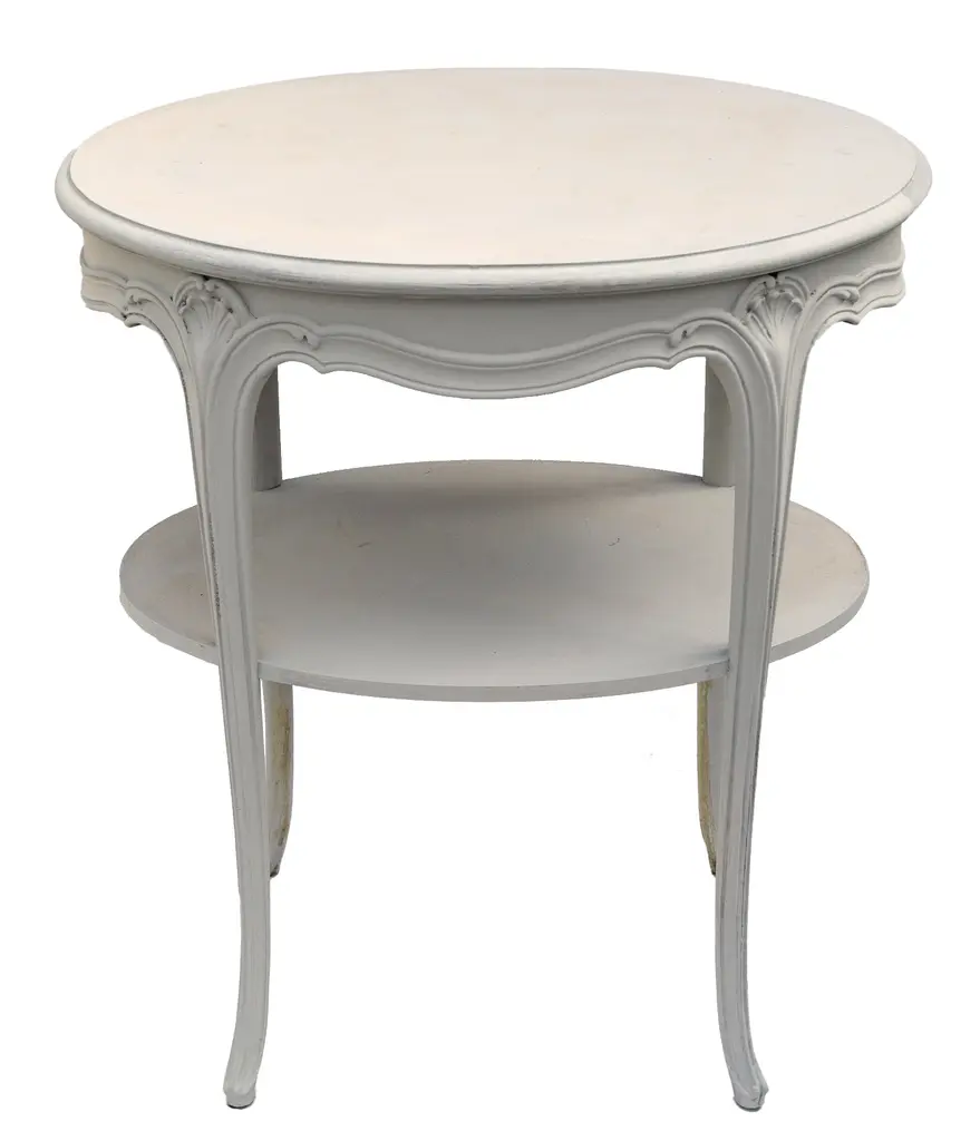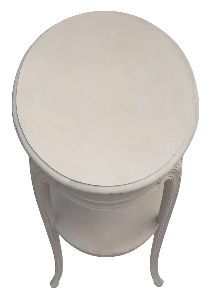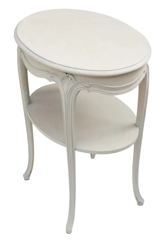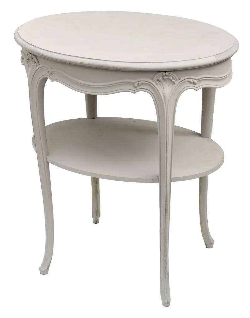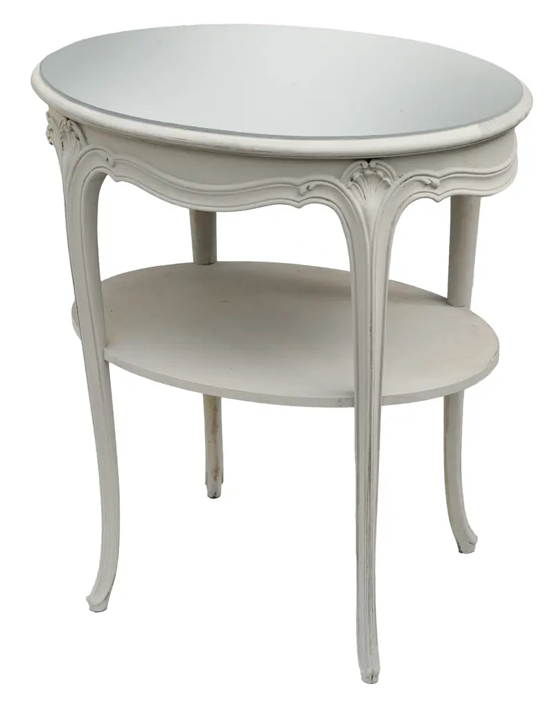 This oval side table with custom glass top is simply charming! Features soft round edges & decorative carved details. The table sits on slender cabriole legs.