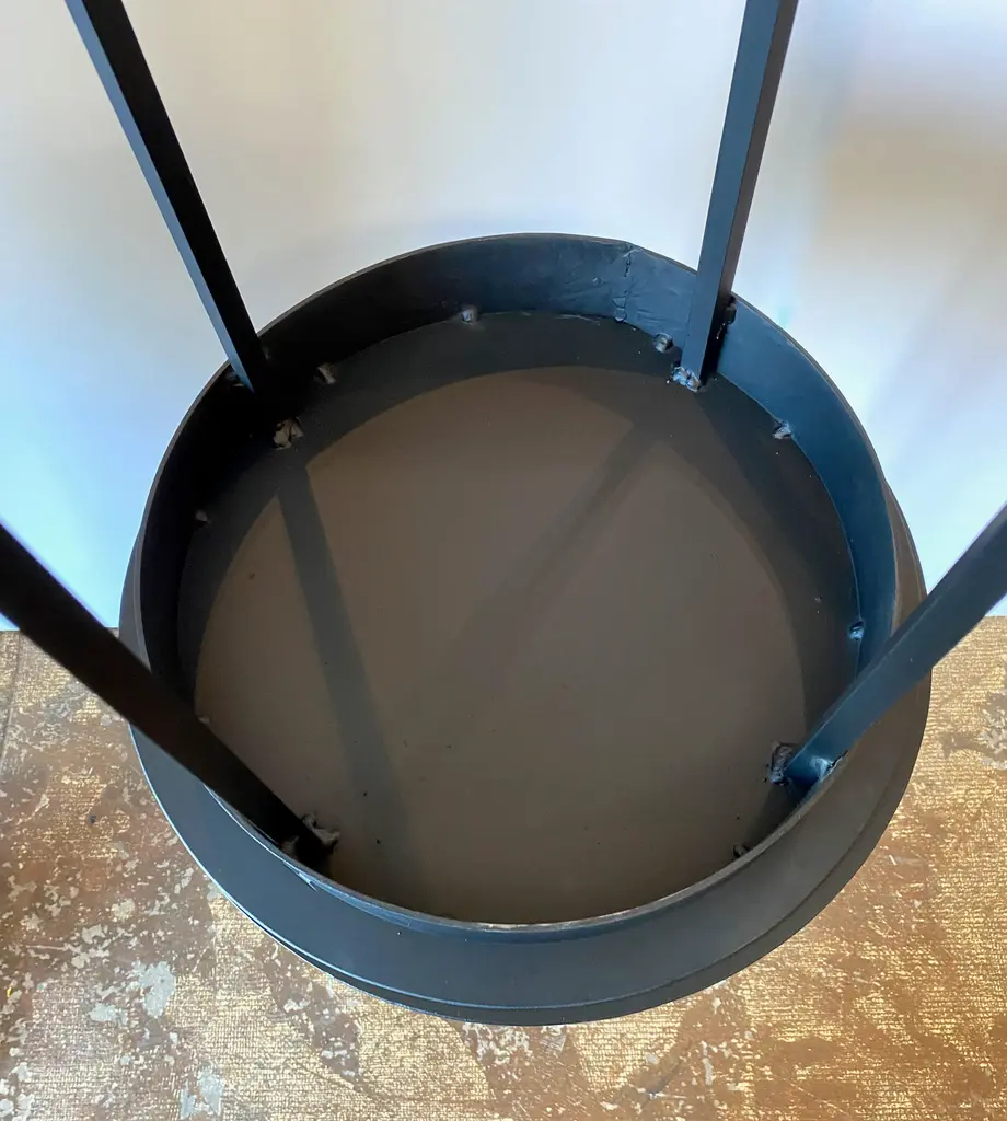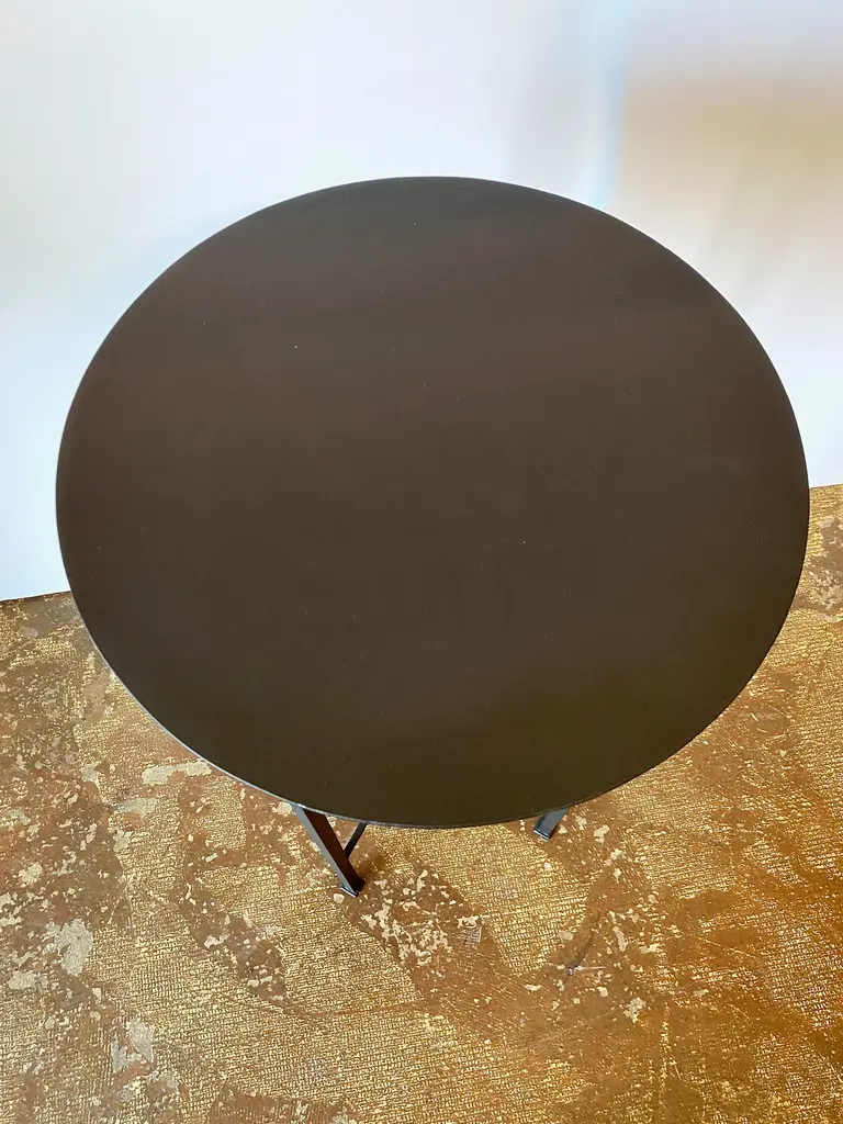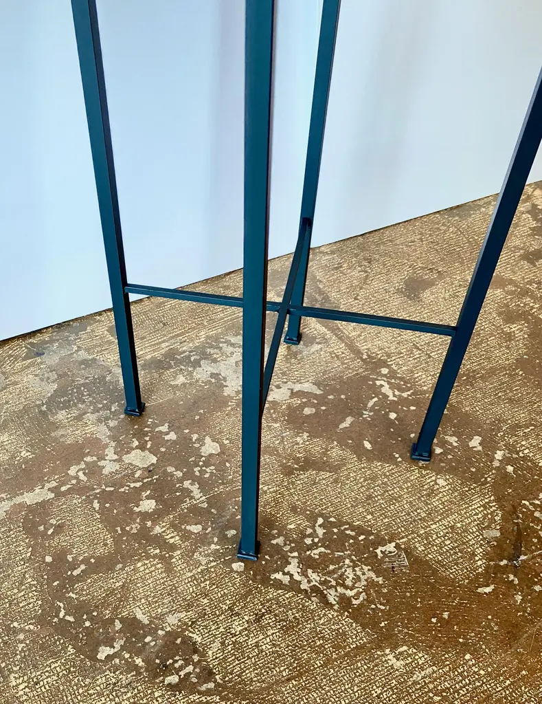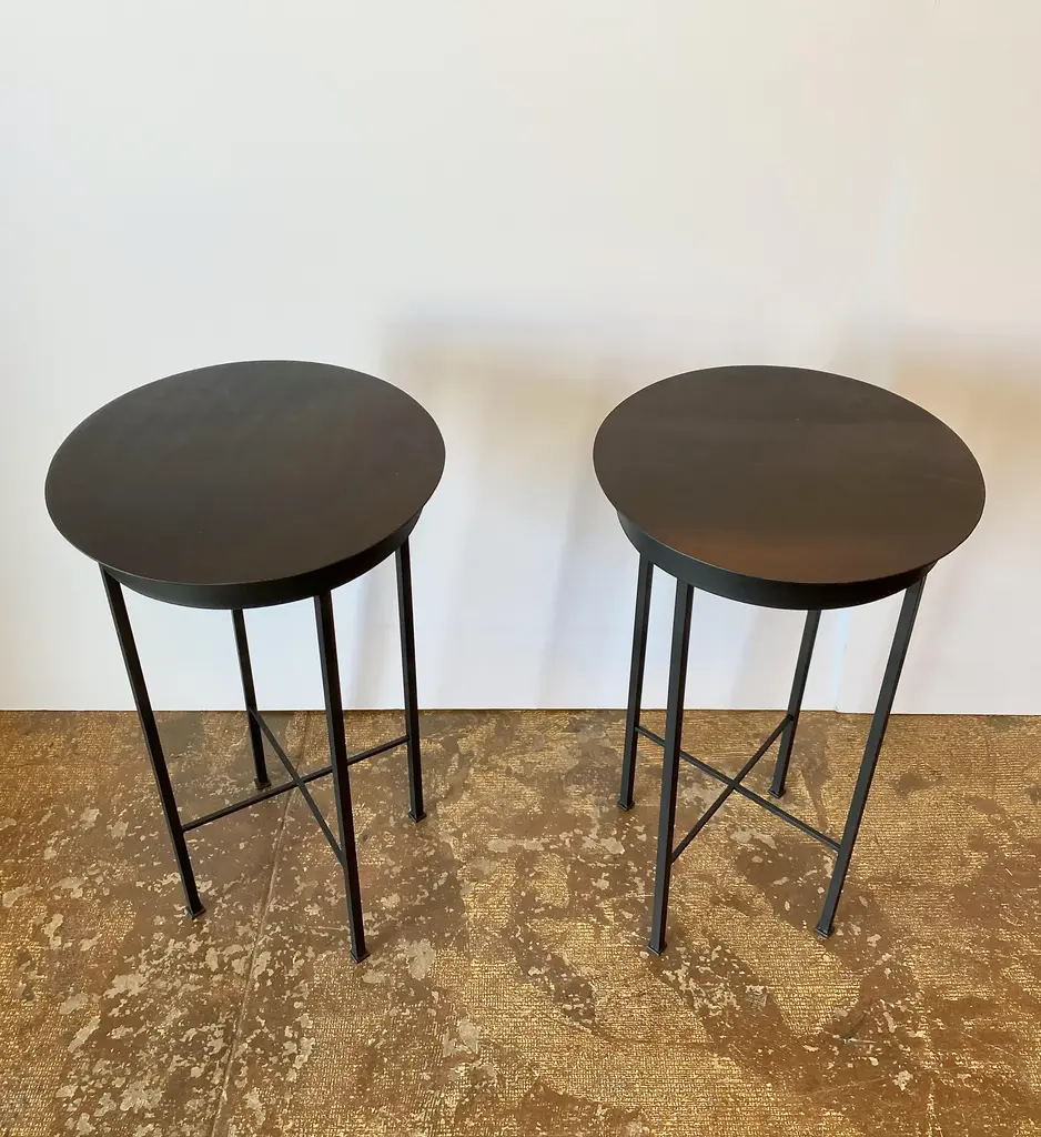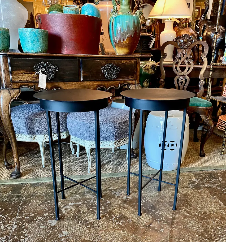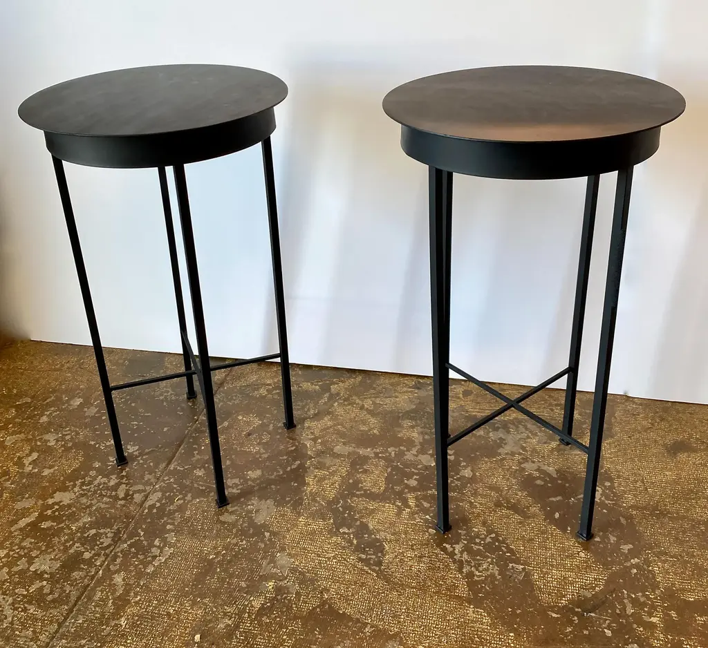This is a chic pair of iron side tables or stands that were inspired by a pair of French tables. These charming tables are suitable for indoor, as well as outdoor use. We acquired a pair of similar vintage French tables a few months ago; they sold almost the minute that they were posted them to Chairish. We had several requests for more of these little charmers; so here is the MJH rendition of a French Moderne Petit Gueridon. These tables are sold as a pair; we will custom create a single table. We have listed separately a slightly lower pair of 24" high tables. Please contact us regarding additional photos and information.