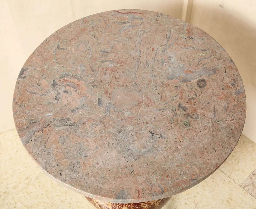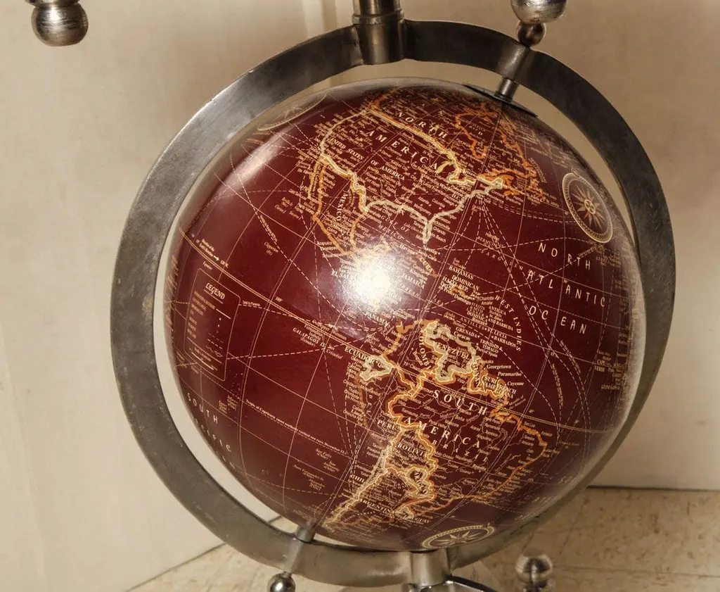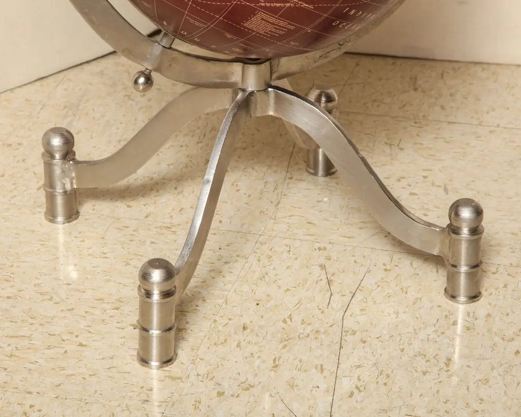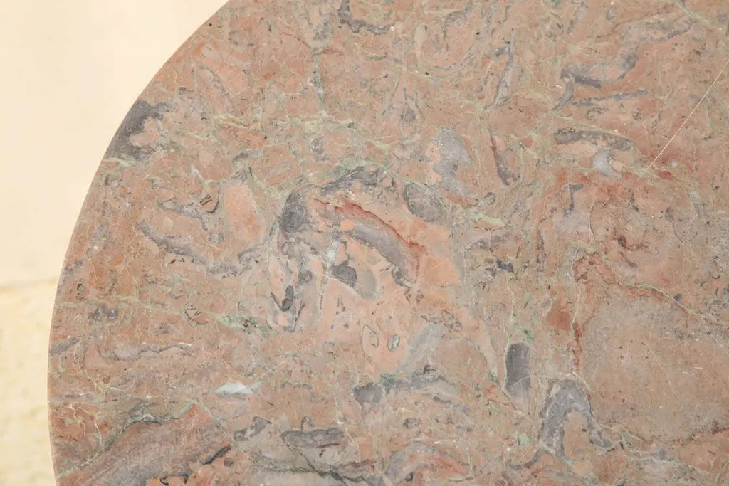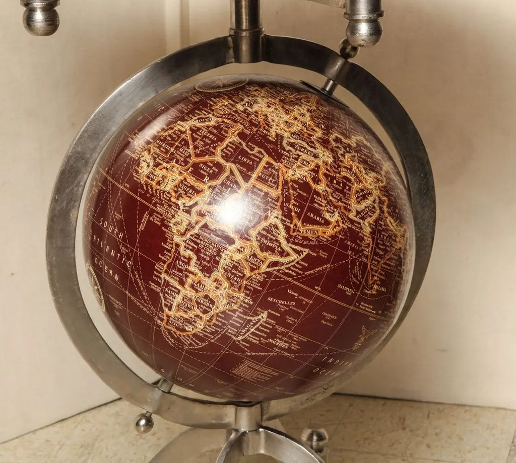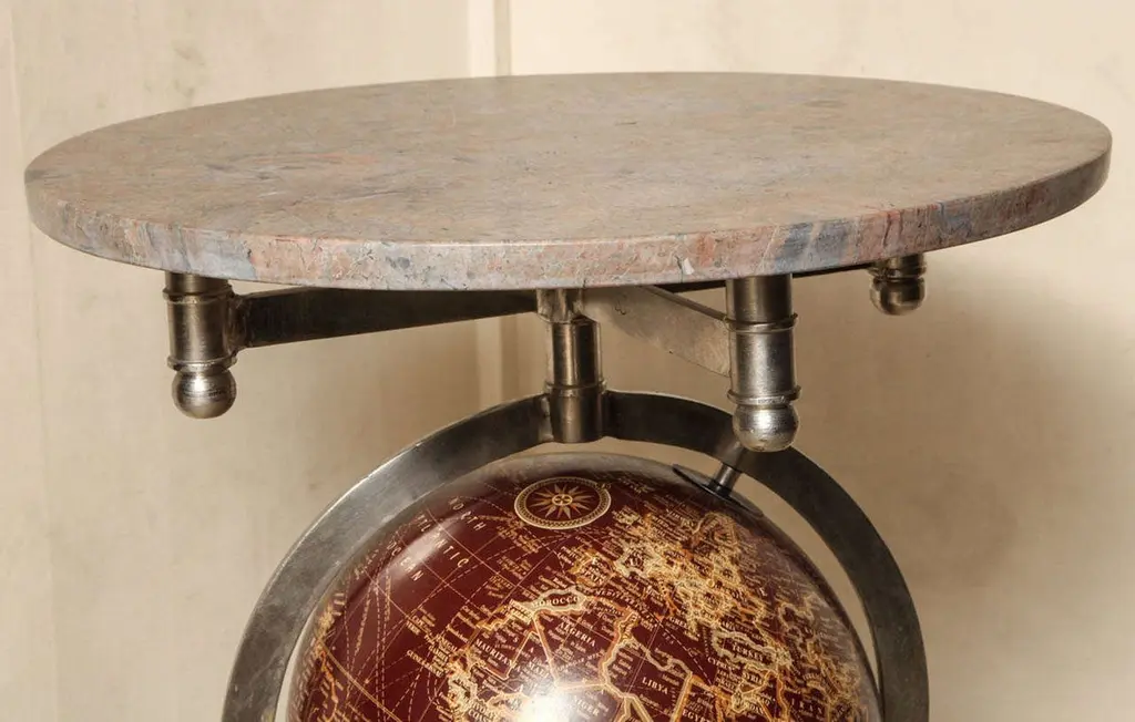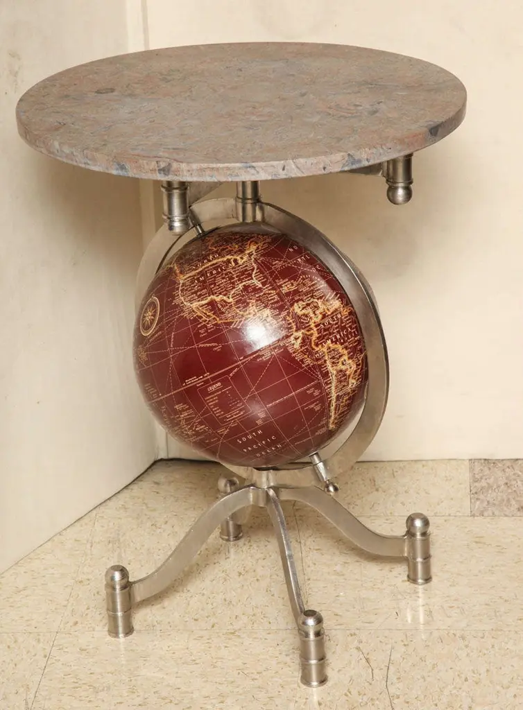 Pair of modern globe form side or end tables with circular (round) marble tops.