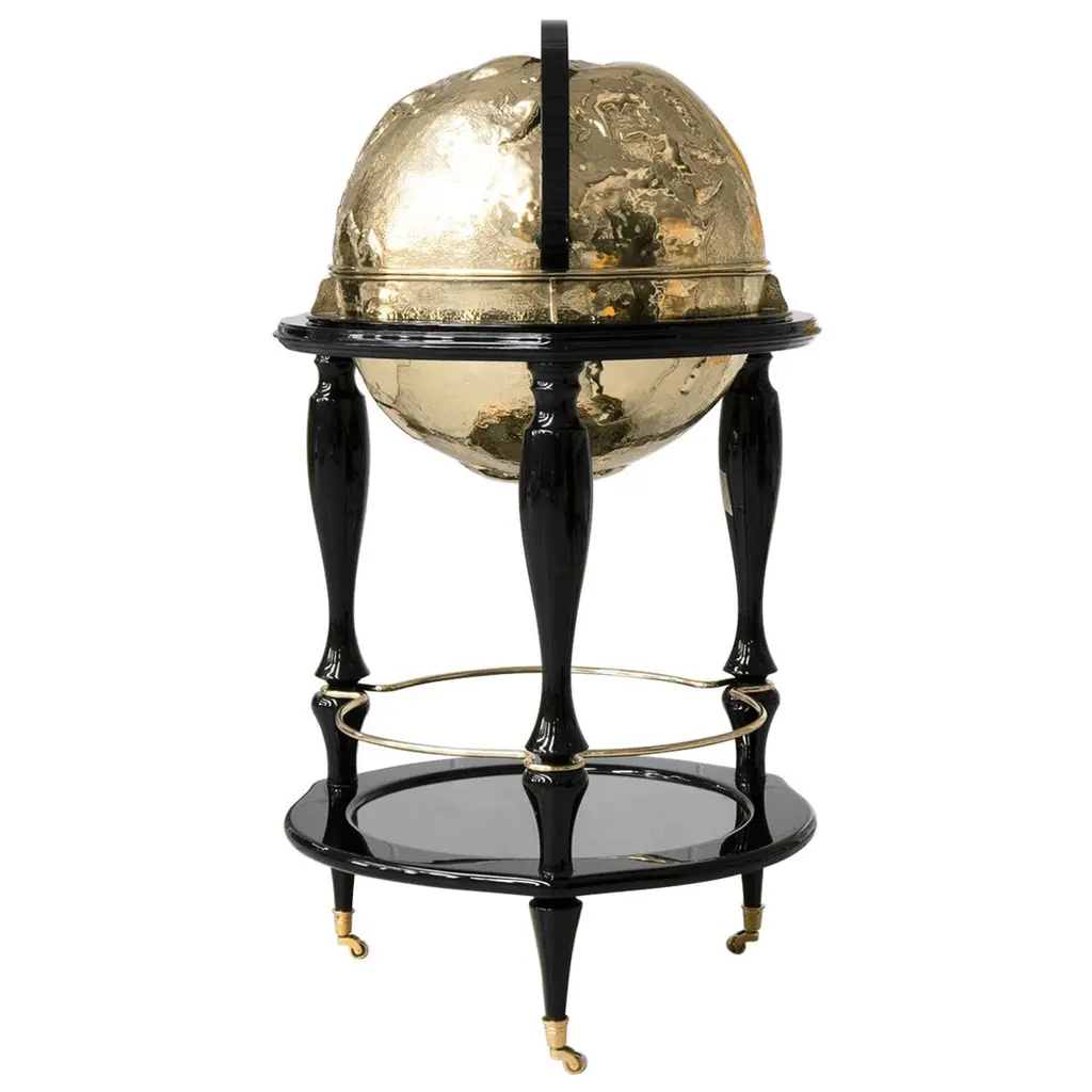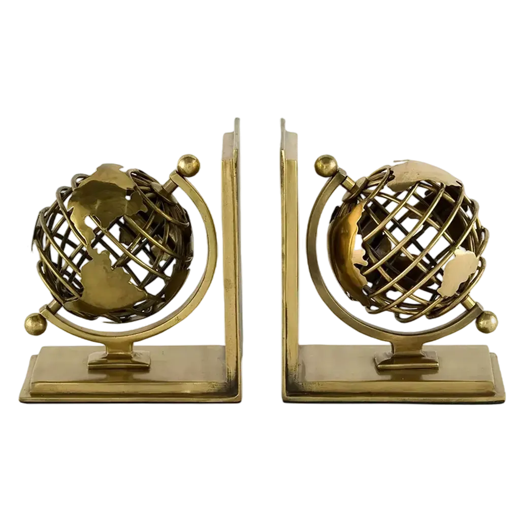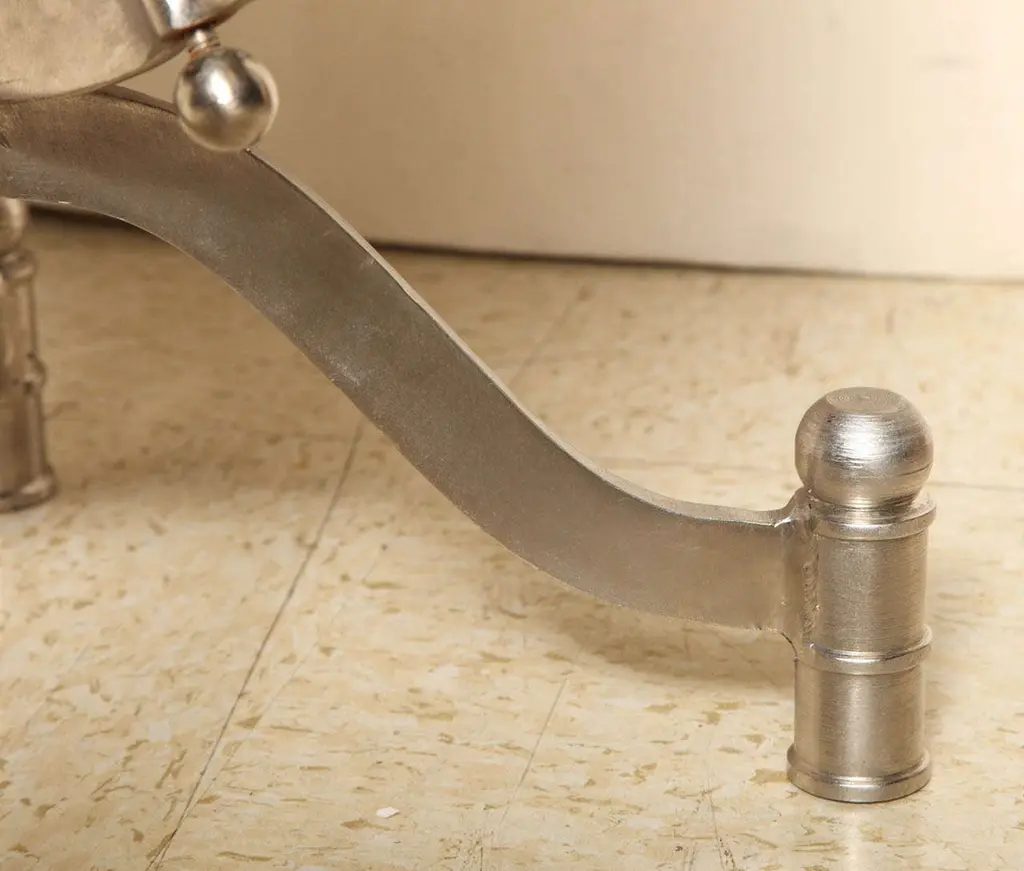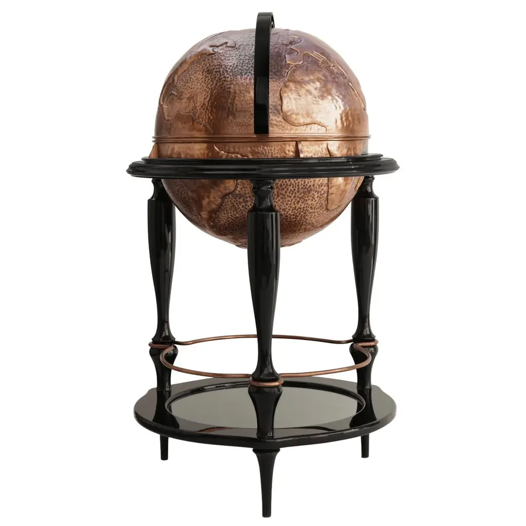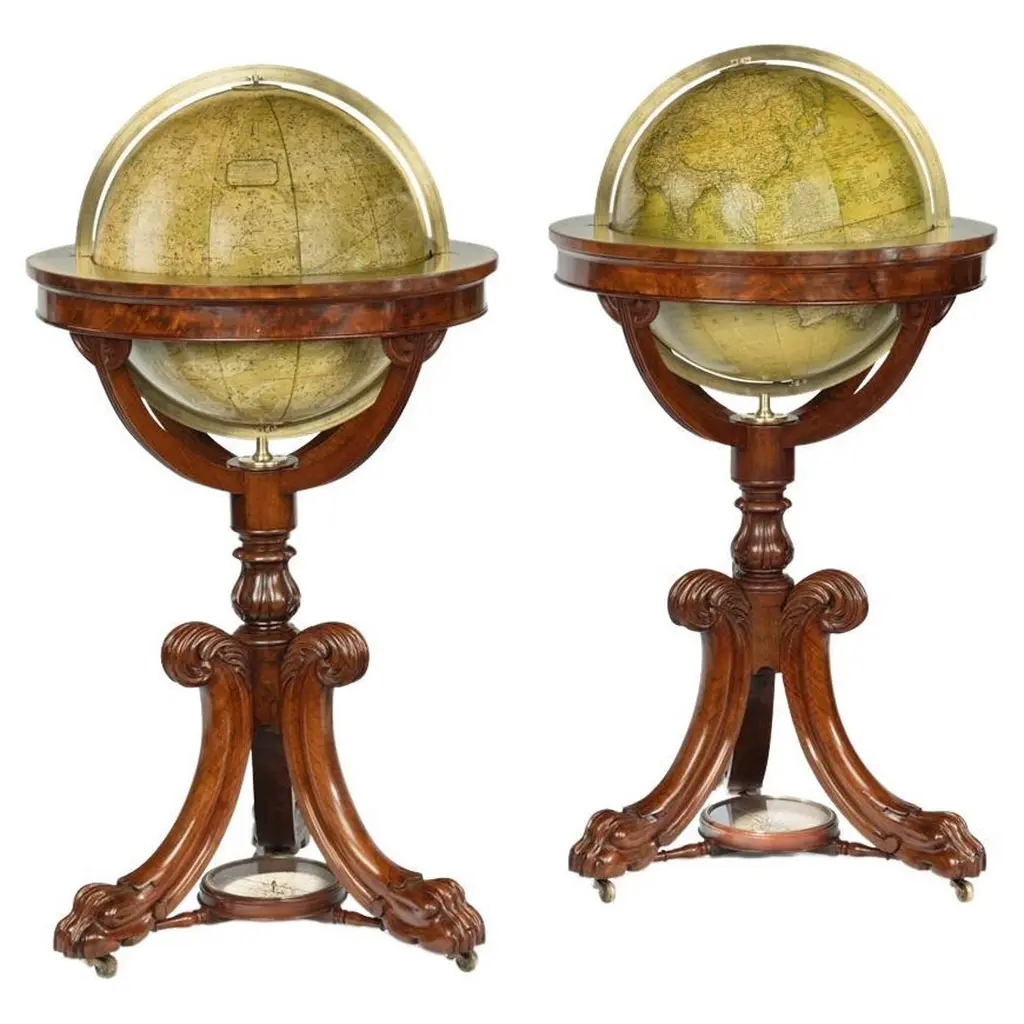 Pair of modern globe form side or end tables with circular (round) marble tops.