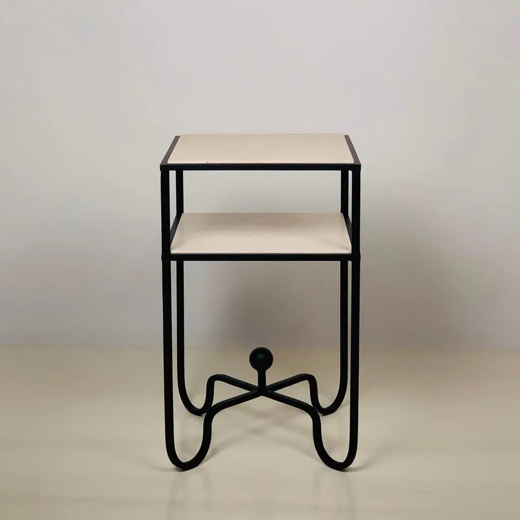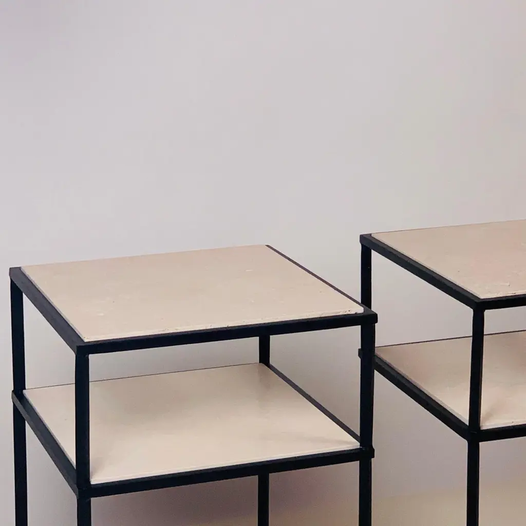 Pair of 2-tier 'Entretoise' side tables by Design Frères. Wrought iron base with 2 thin travertine shelves. Also great as small nightstands. Shelves are removable for secure shipping and cleaning.