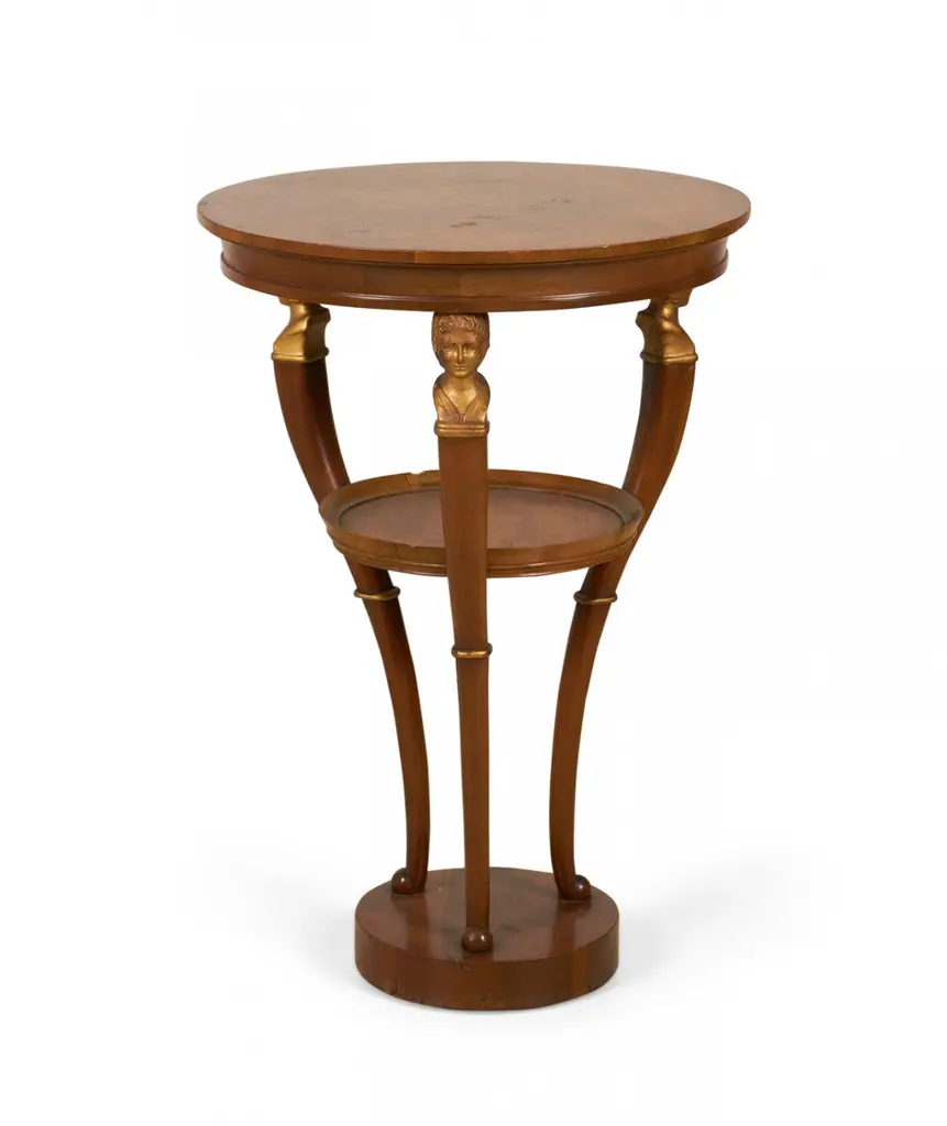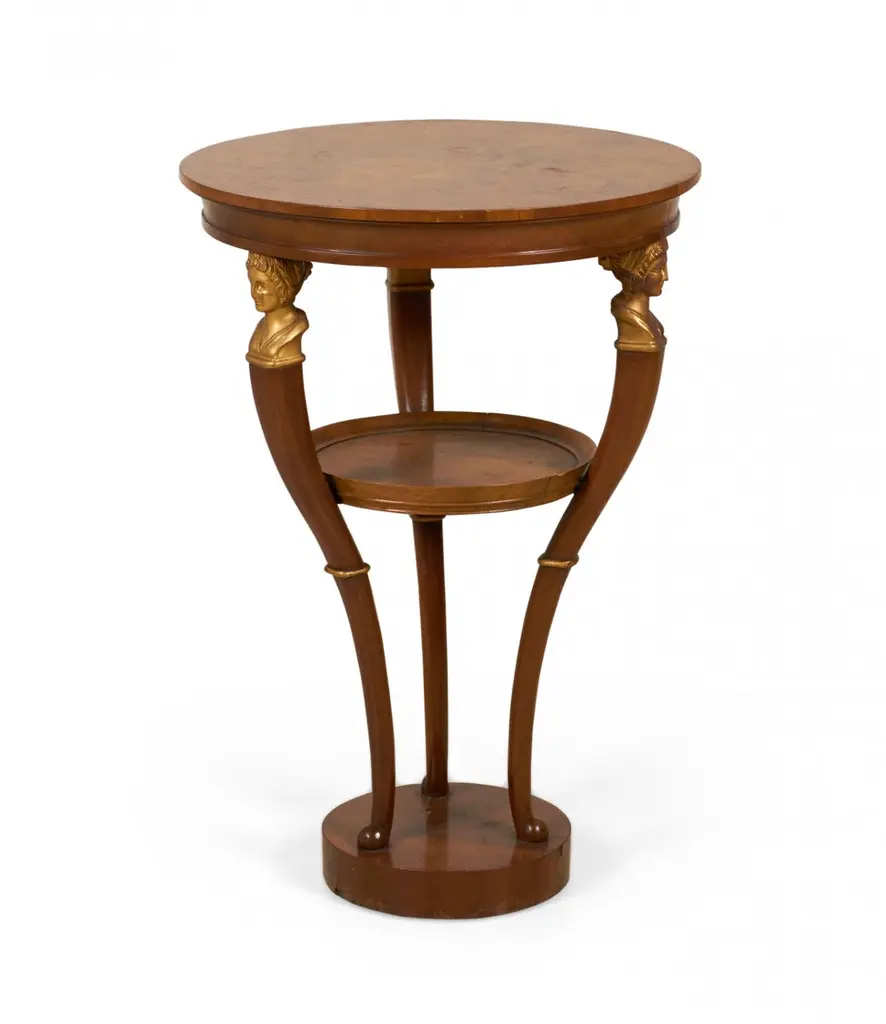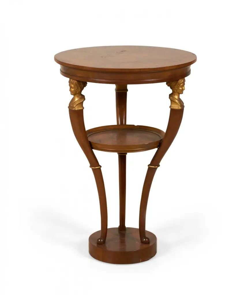 Pair of Mid-Century Neoclassical-style mahogany end / side tables with circular tops and a stretcher shelves supported by three curved legs topped with brass embellishment busts atop a circular base. (BAKER FURNITURE COMPANY)(PRICED AS Pair) Cracks and damage to finish.