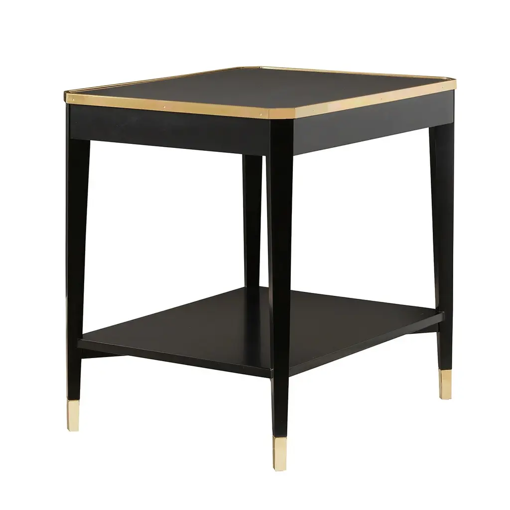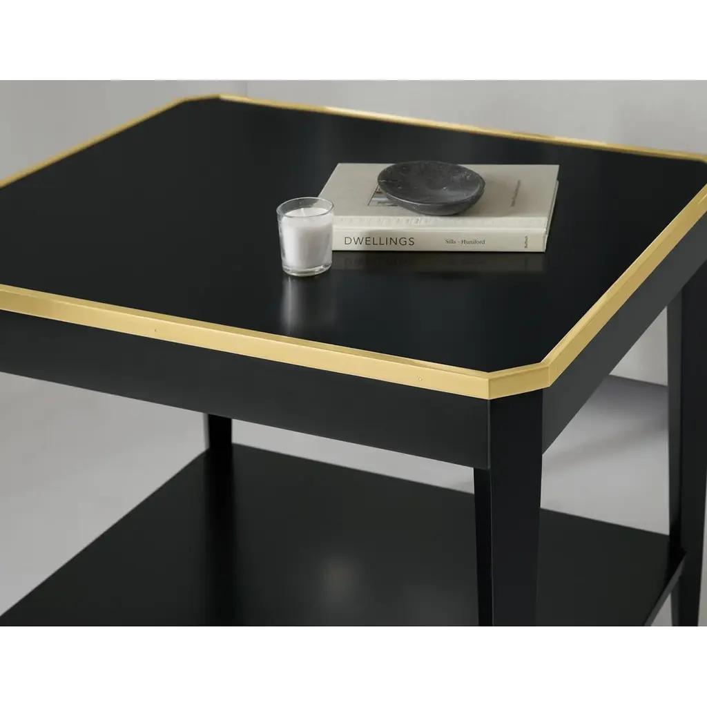 The clean-lined silhouette is beautifully accented with polished brass details, including a refined frame along the tabletop and sleek brass feet, creating a perfect harmony between the deep ebony finish and warm metallic elements. The design epitomizes mid-century modern style while offering contemporary functionality. With a practical lower shelf that provides both storage and visual balance, maintaining an open, airy aesthetic that works beautifully in any room. Whether placed beside a sofa, between chairs, or as a bedside table, this versatile piece brings both purpose and refinement to your space. Dimensions: 28" W x 22" D x 27" H