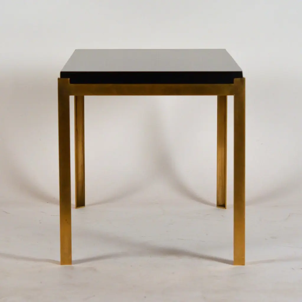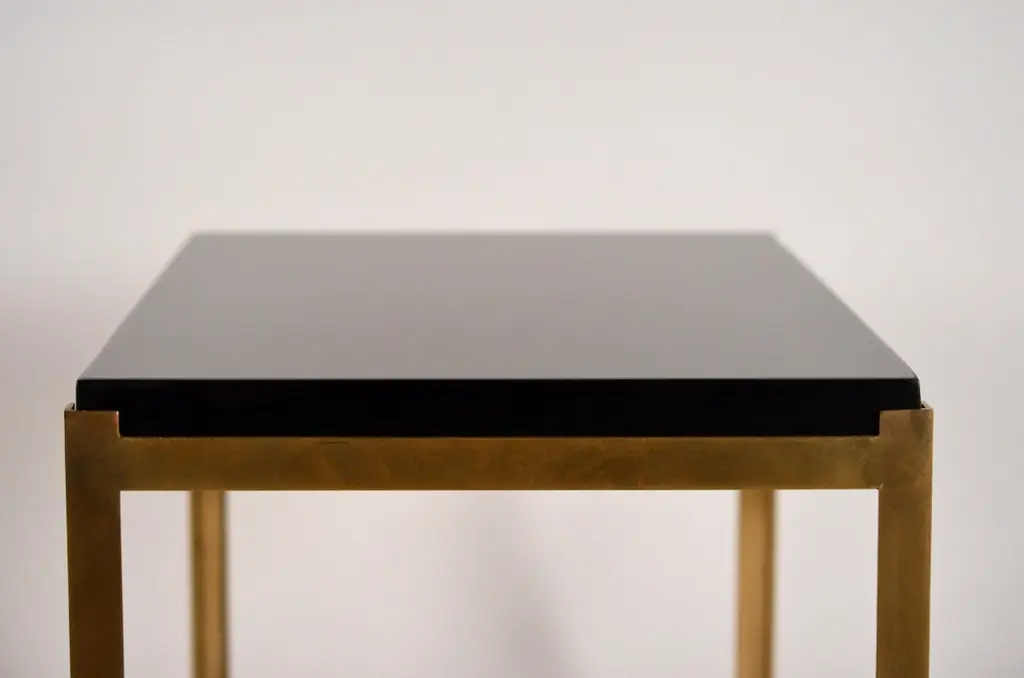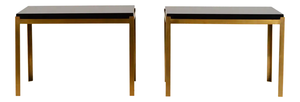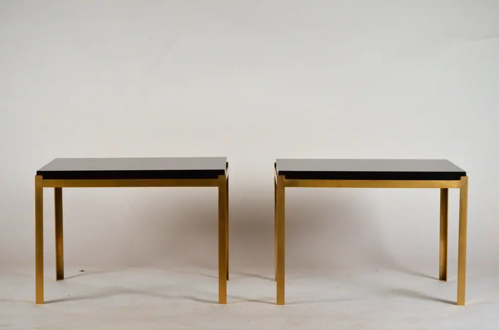 Pair of chic 'Caisson' brass and black lacquer end tables by Design Frères. Solid (not plated) brass frames pared with durable lacquer tops (coasters still recommended). Great as end tables, side tables or even a two-part coffee table.