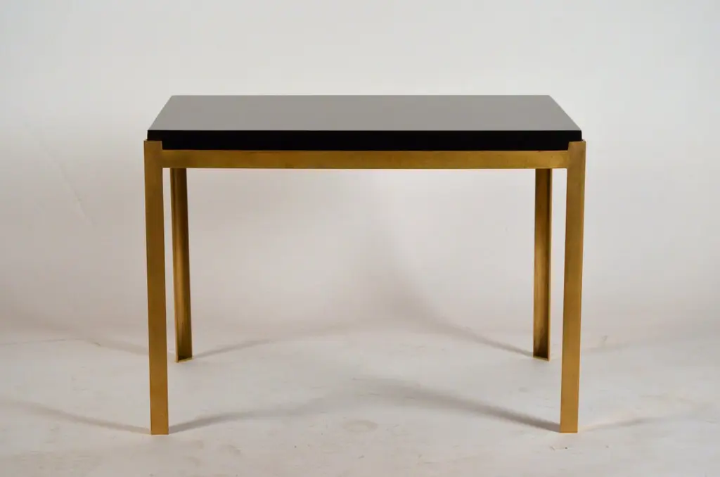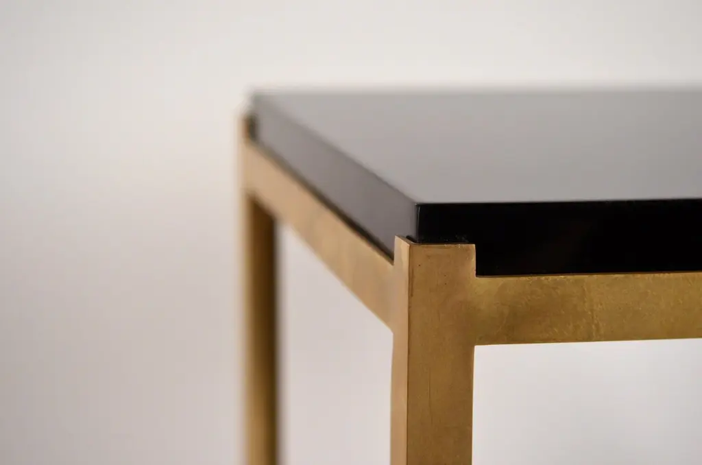 Pair of chic 'Caisson' brass and black lacquer end tables by Design Frères. Solid (not plated) brass frames pared with durable lacquer tops (coasters still recommended). Great as end tables, side tables or even a two-part coffee table.