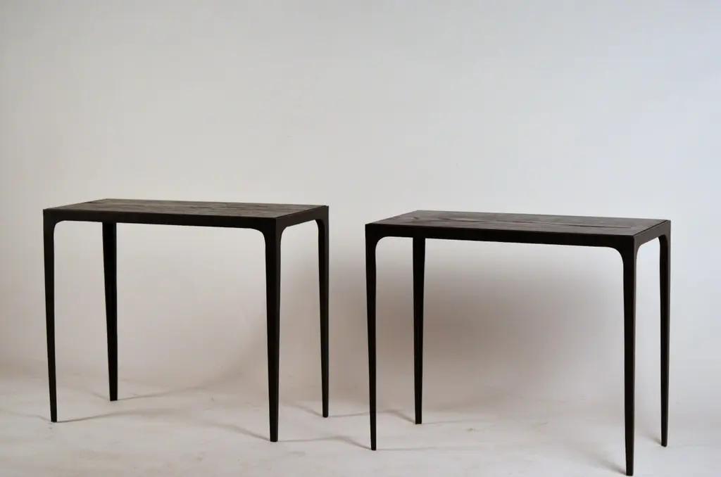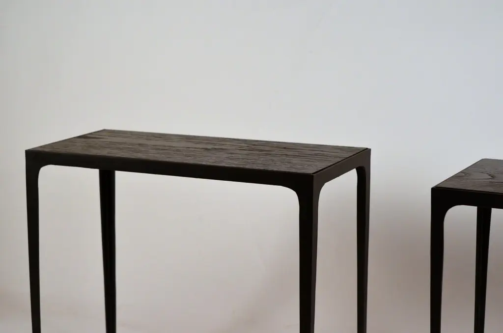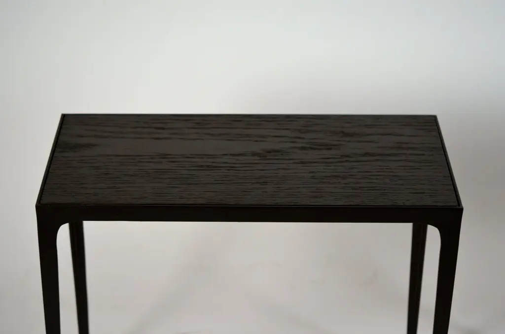 Pair of chic ebonized oak 'Esquisse' side tables by Design Frères. Grooved blackened and sealed oak tops over matte black iron frames.