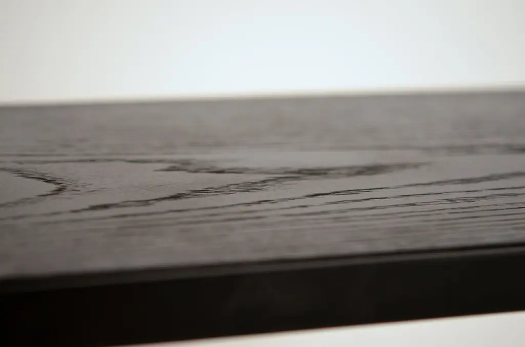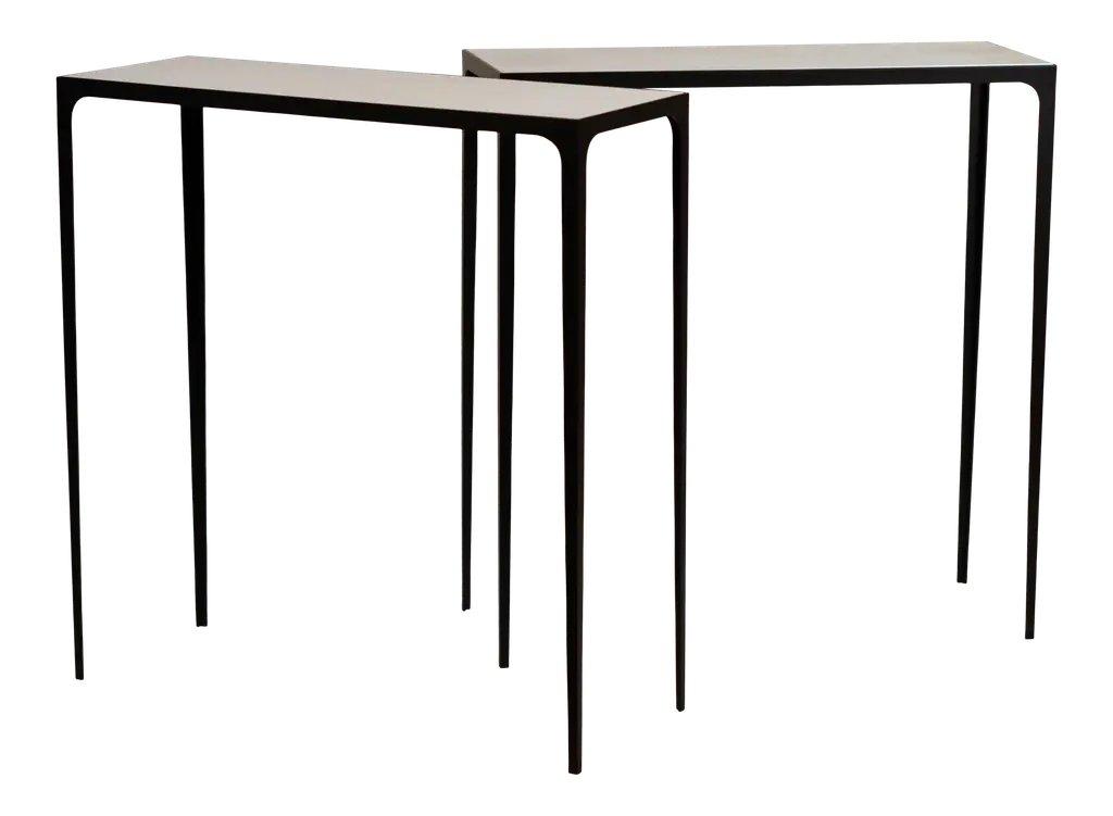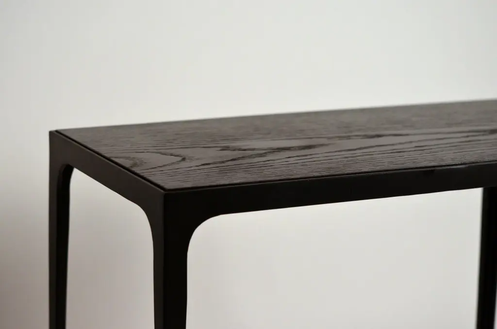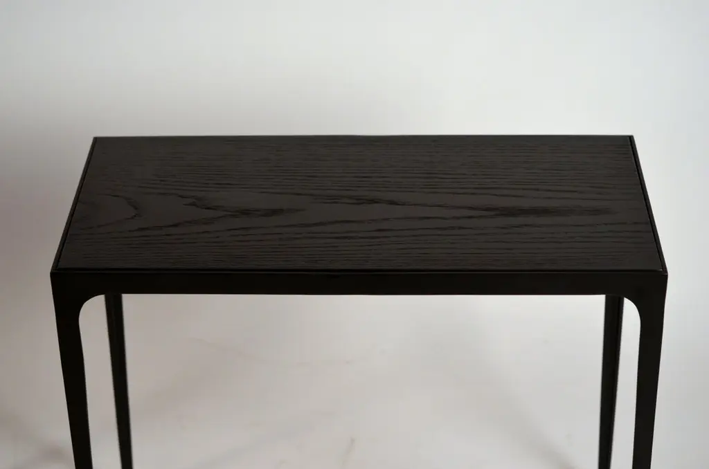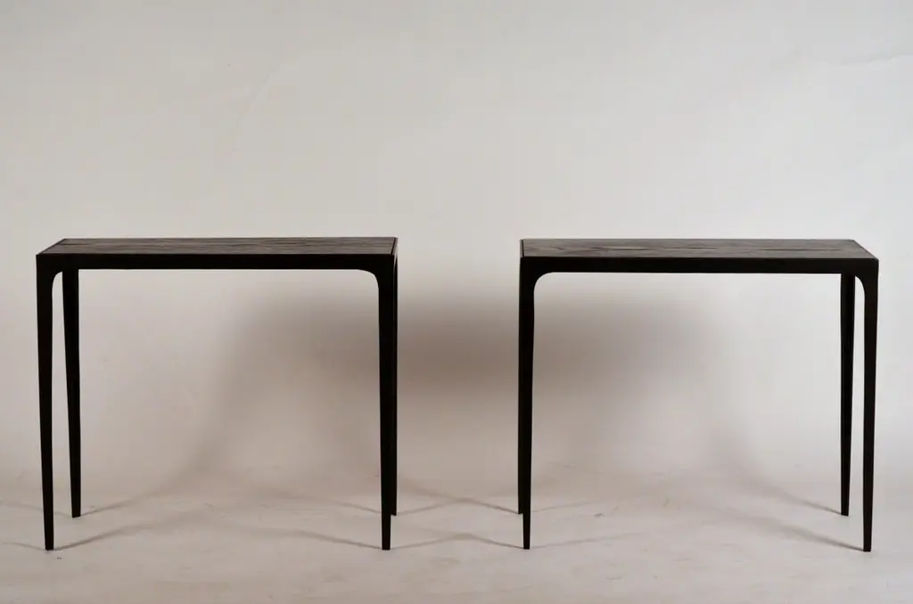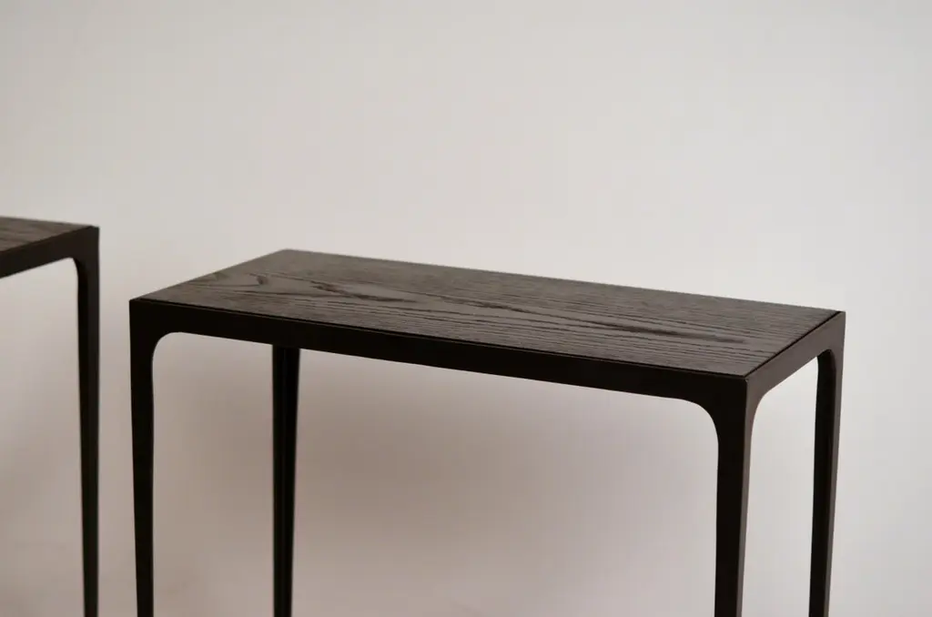Pair of chic ebonized oak 'Esquisse' side tables by Design Frères. Grooved blackened and sealed oak tops over matte black iron frames.