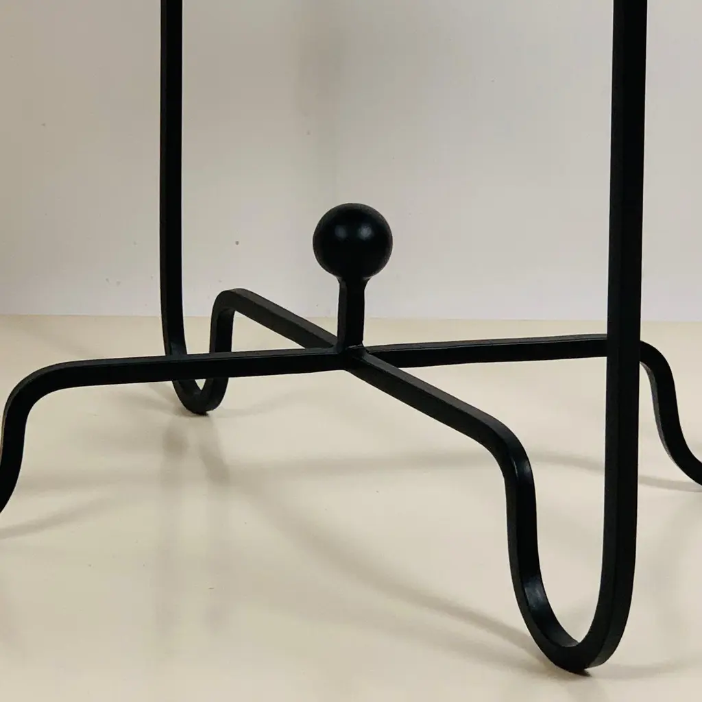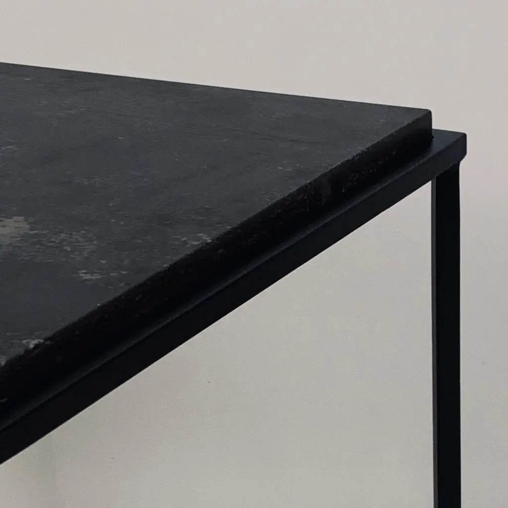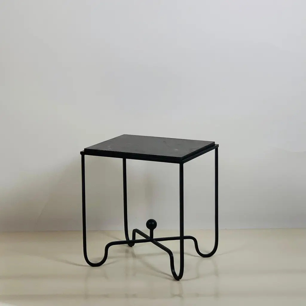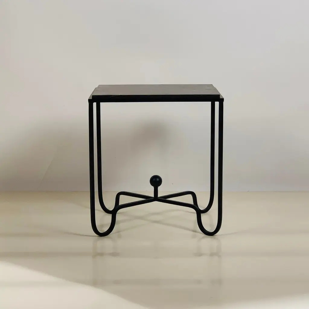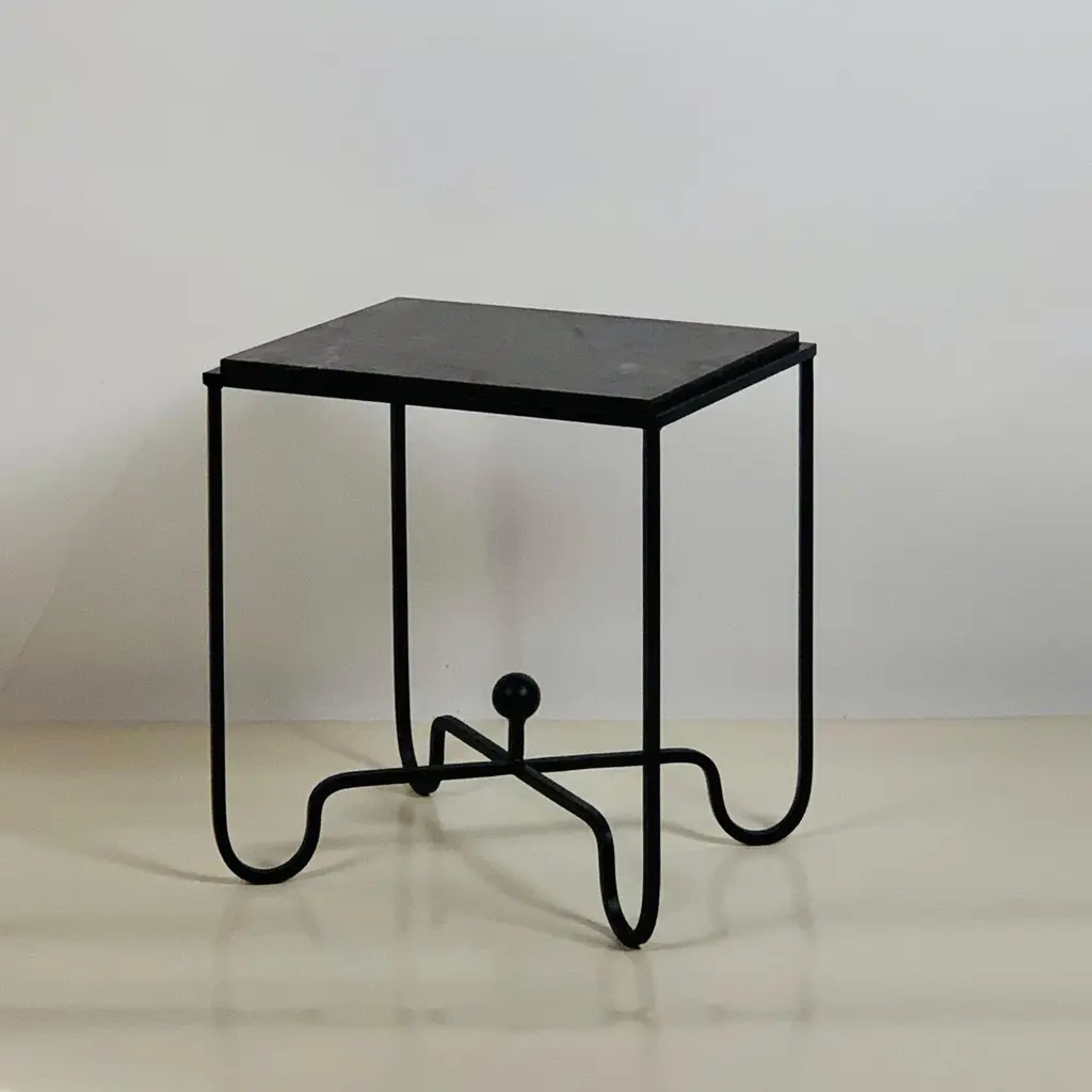 Sculptural blackened steel frames fitted with gorgeous black limestone tops. Very durable stone surface.Inspired by the timeless aesthetic of French modern design, these night stands / side tables / end tables from our exclusive Design Frères line are handmade in our Los Angeles atelier by our skilled artisans. These classic pieces will blend in, structure and enhance any space and last a lifetime.