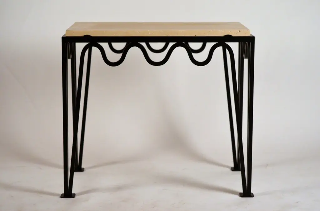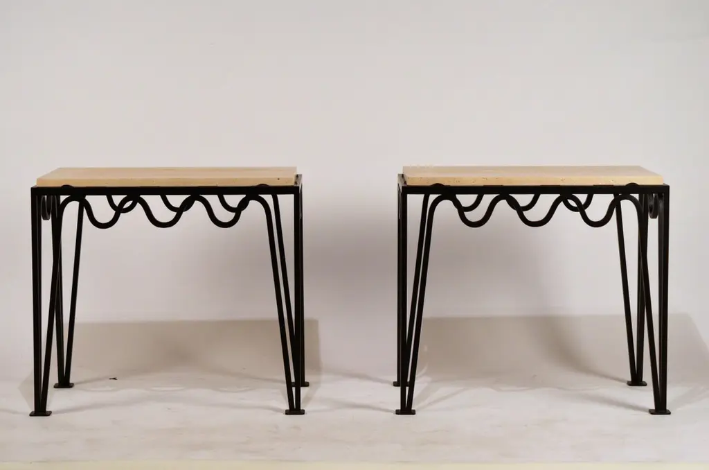 Pair of 'Méandre' black iron and travertine side tables by Design Frères.Chic and understated.