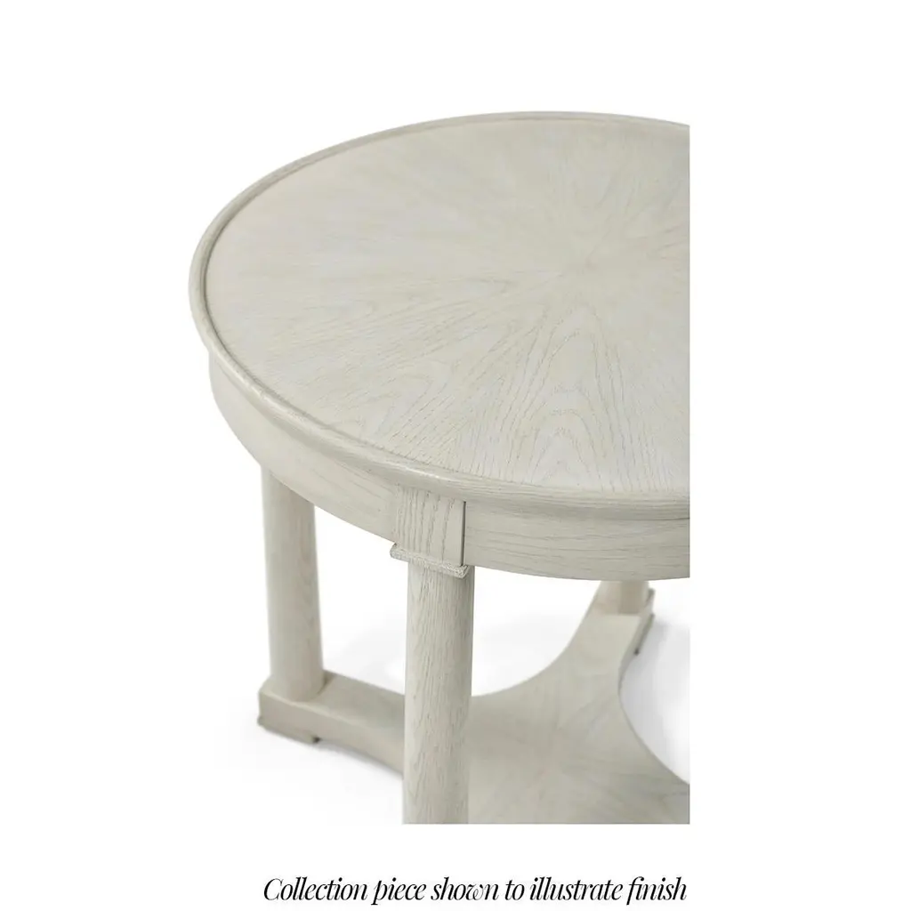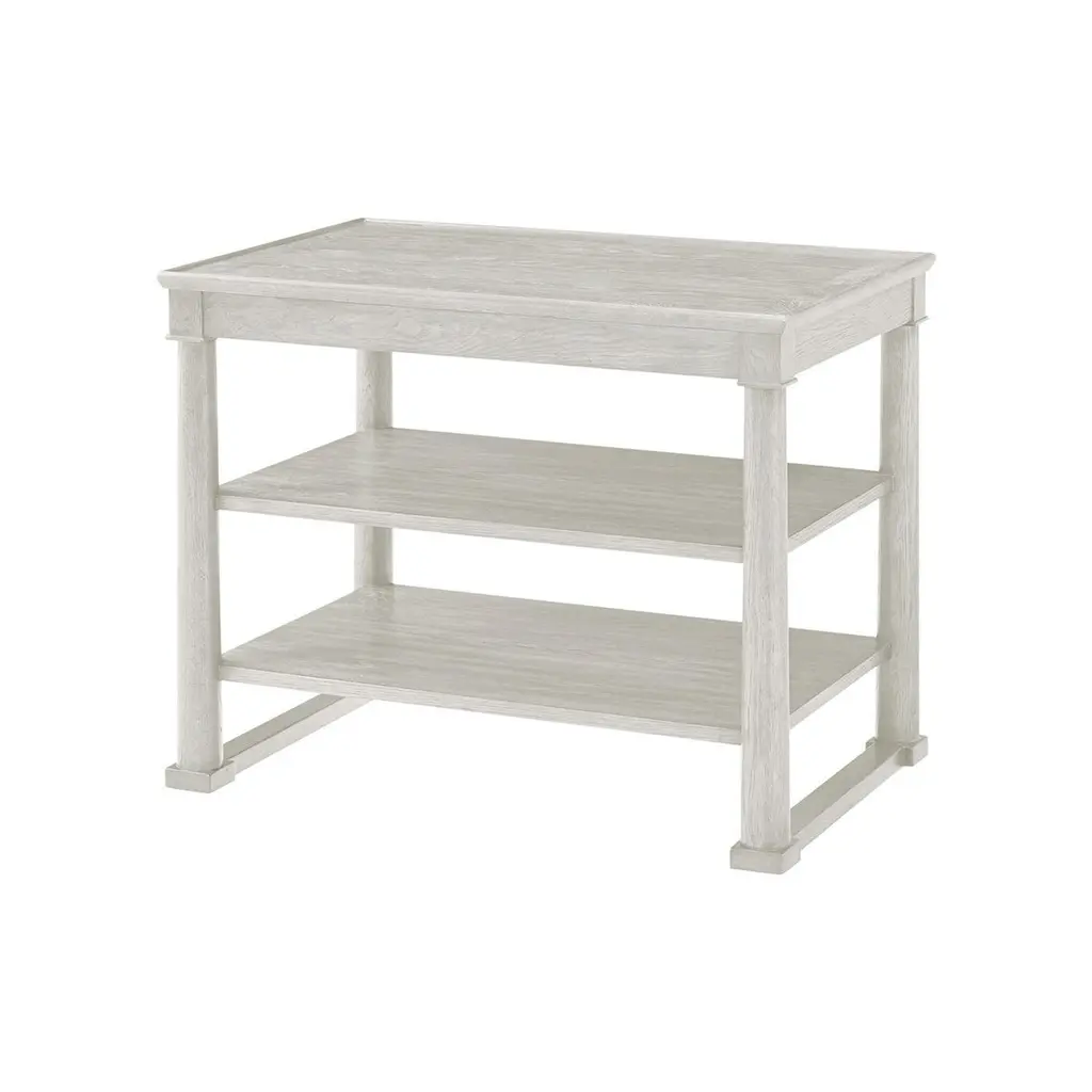 Blend timeless geometry with artisanal charm. Symmetrical lines complement the richness of the oak surface and column legs, while finely squared accents at each base add a tailored detail. A gently recessed dishtop adds a touch of elegance to the table’s surface. The two lower shelves create a sense of lightness and layered functionality, making this piece ideal for both storage and display.Handcrafted in oak and shown in our elegant white Dover finish. Whether styled beside a sofa or as a nightstand, it offers an elegant balance of form and function.Dimensions: 30" W x 20" D x 24" H