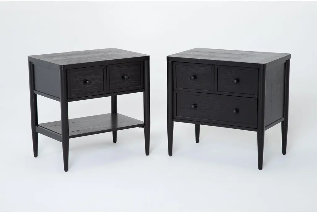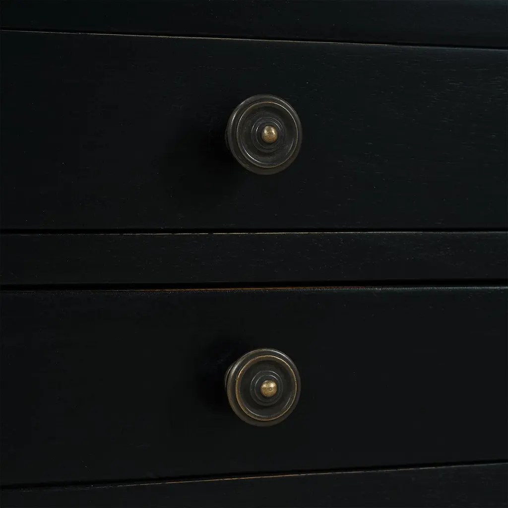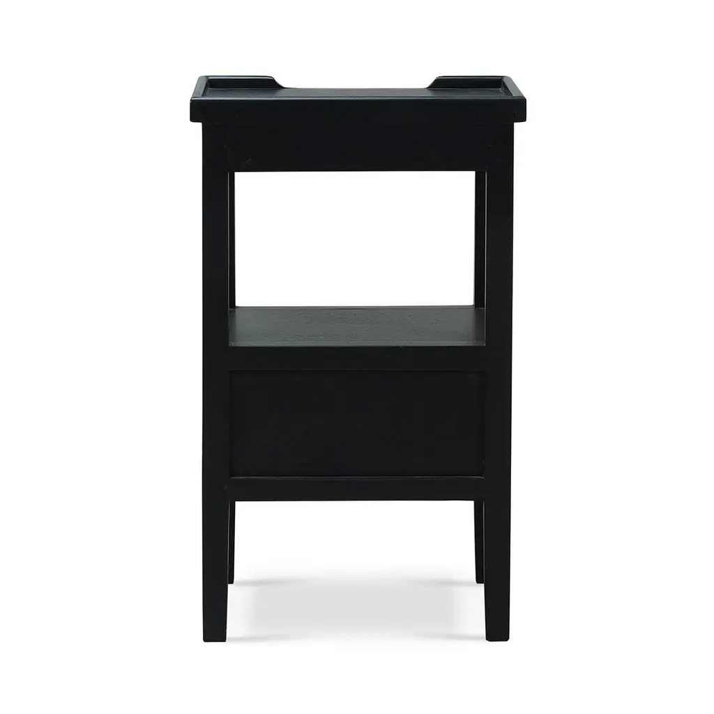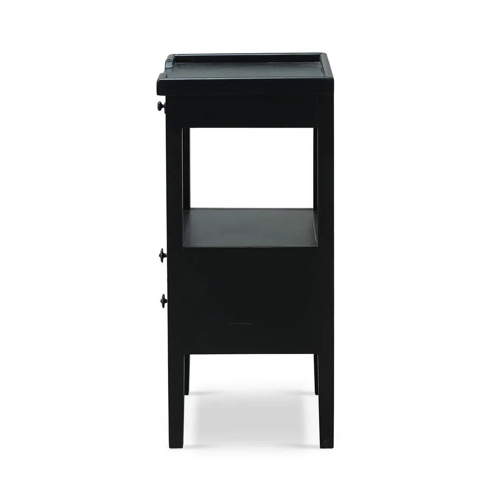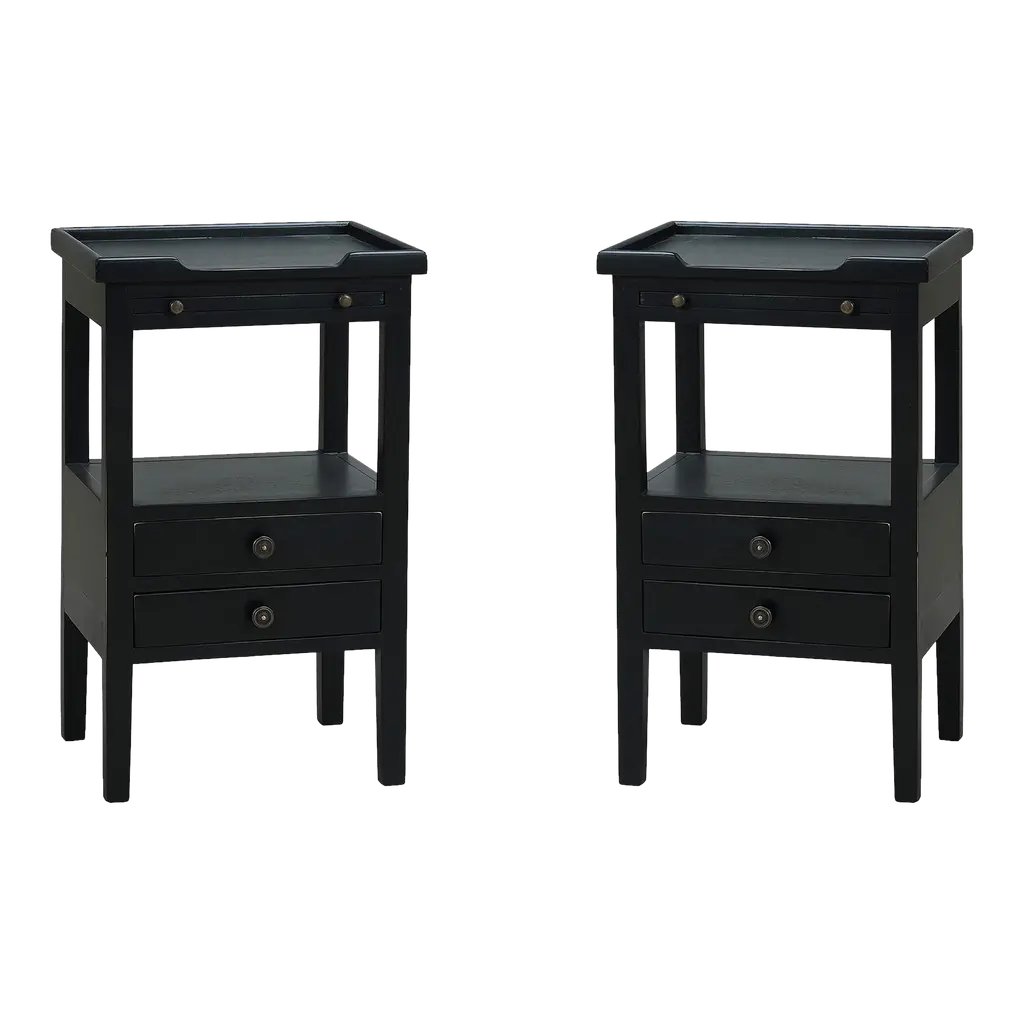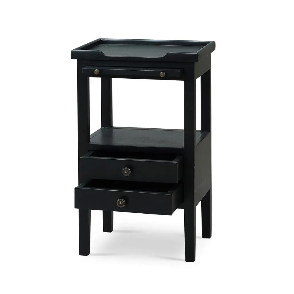 This classic piece combines timeless design with practical functionality, making it a perfect addition to your home.Crafted with meticulous attention to detail, this side table features a raised edge gallery top, perfect for keeping your items secure.A pull-out shelf adds character and functionality. Made of solid mahogany with a pair of dovetailed drawers that create a lower shelf for an elegant display. The gorgeous Batavia Black finish adds a sophisticated and serene touch that complements any decor style.Dimensions: 17" W x 13" D x 27" HCustom finish options are also available. Contact us to learn more.