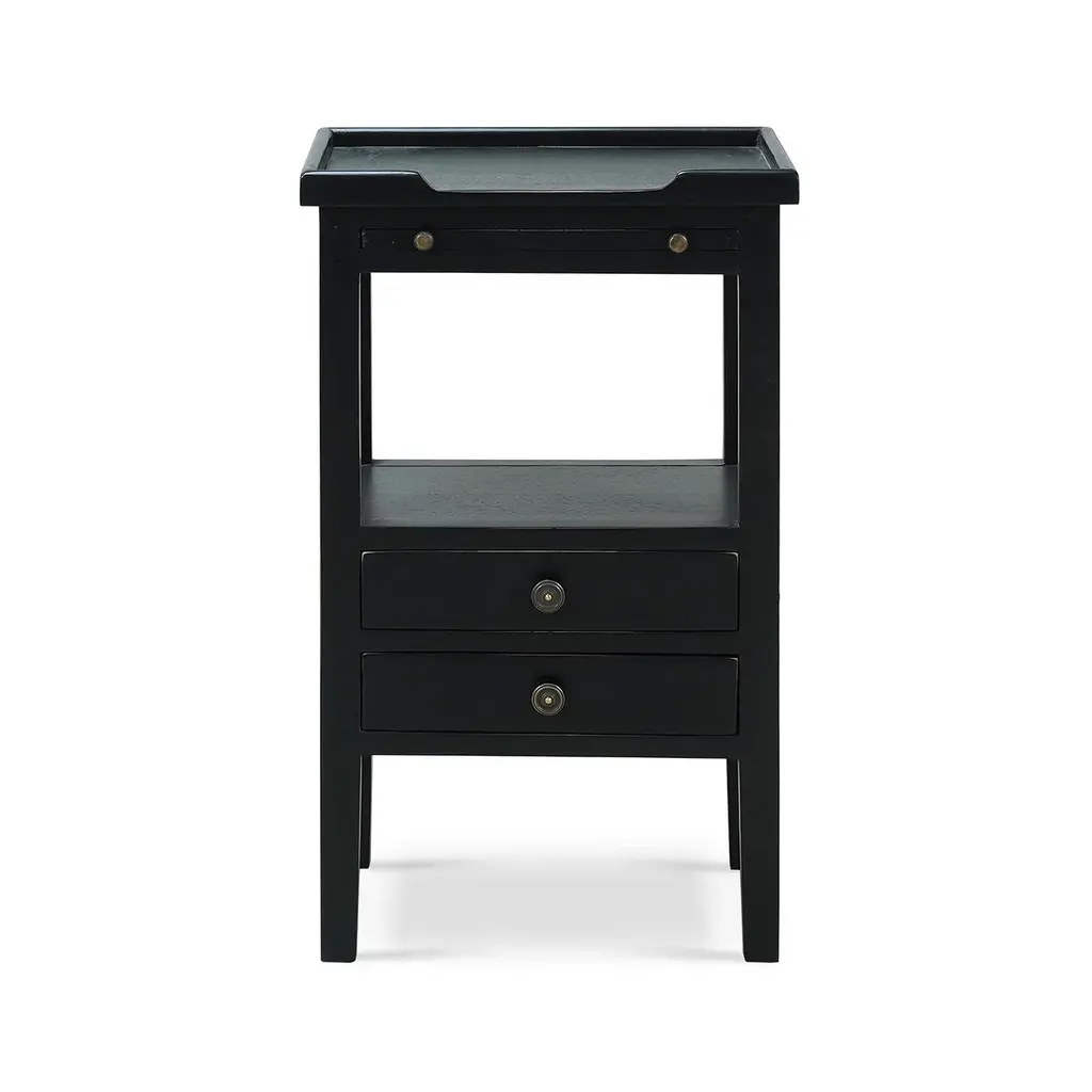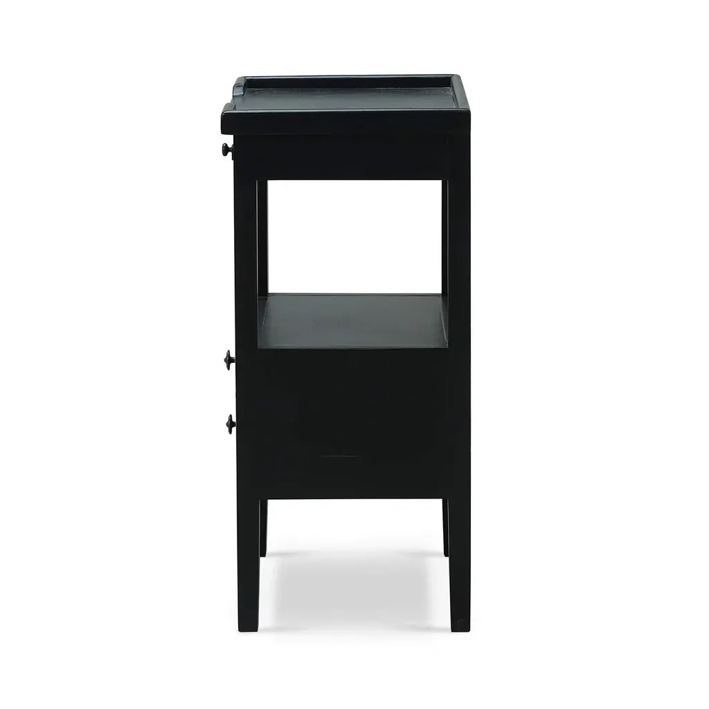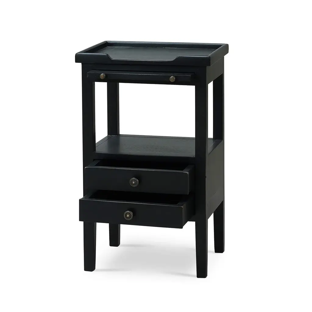 This classic piece combines timeless design with practical functionality, making it a perfect addition to your home. Crafted with meticulous attention to detail, this side table features a raised edge gallery top, perfect for keeping your items secure. A pull-out shelf adds character and functionality. Made of solid mahogany with a pair of dovetailed drawers that create a lower shelf for an elegant display. The gorgeous Batavia Black finish adds a sophisticated and serene touch that complements any decor style. Dimensions: 17" W x 13" D x 27" H