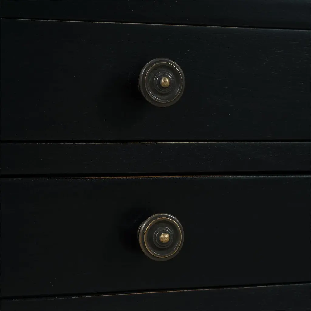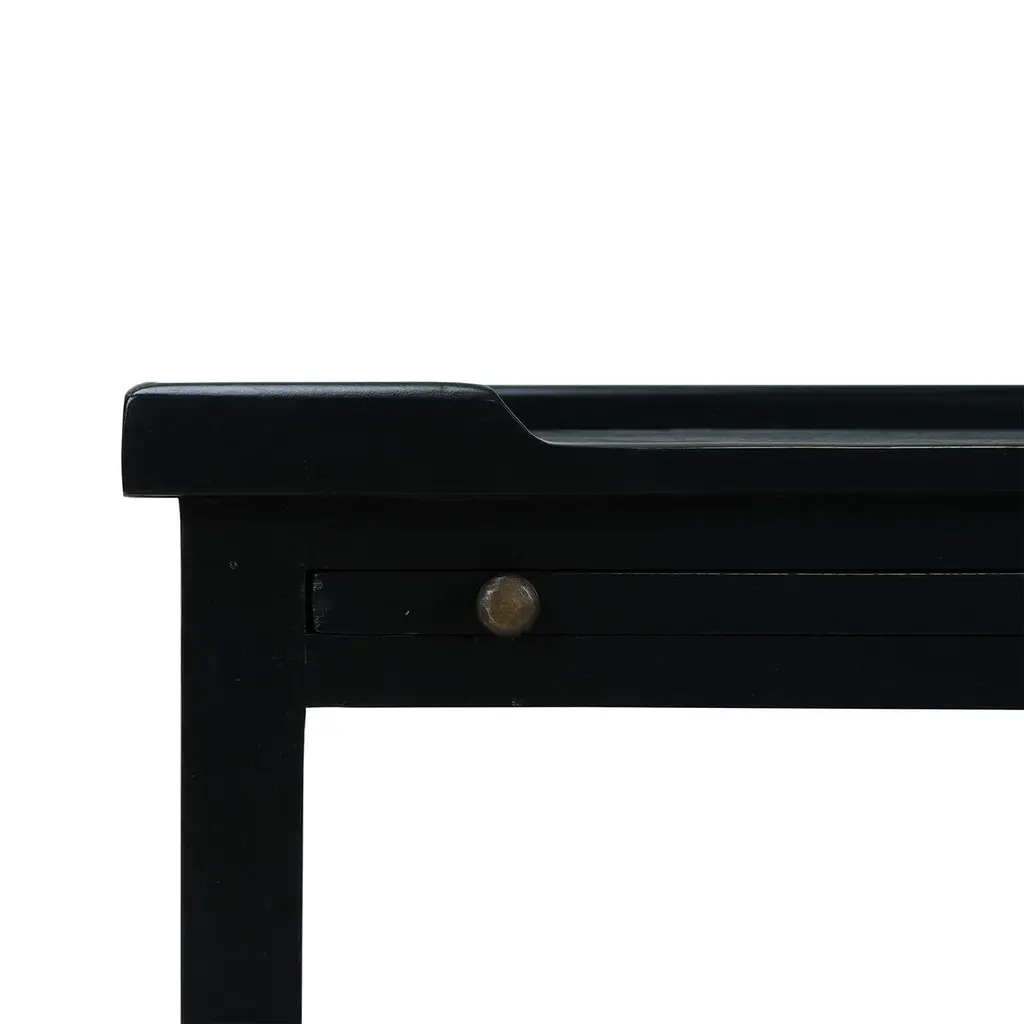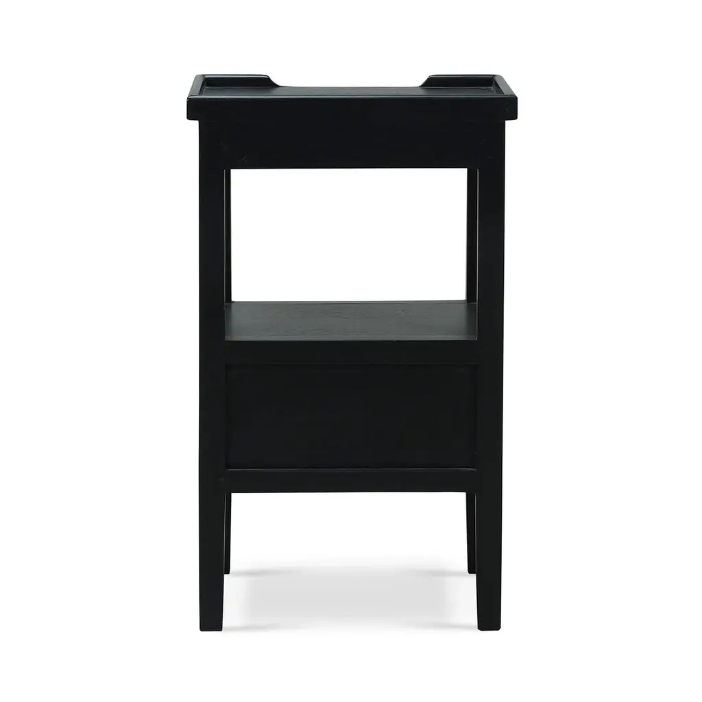 This classic piece combines timeless design with practical functionality, making it a perfect addition to your home. Crafted with meticulous attention to detail, this side table features a raised edge gallery top, perfect for keeping your items secure. A pull-out shelf adds character and functionality. Made of solid mahogany with a pair of dovetailed drawers that create a lower shelf for an elegant display. The gorgeous Batavia Black finish adds a sophisticated and serene touch that complements any decor style. Dimensions: 17" W x 13" D x 27" H