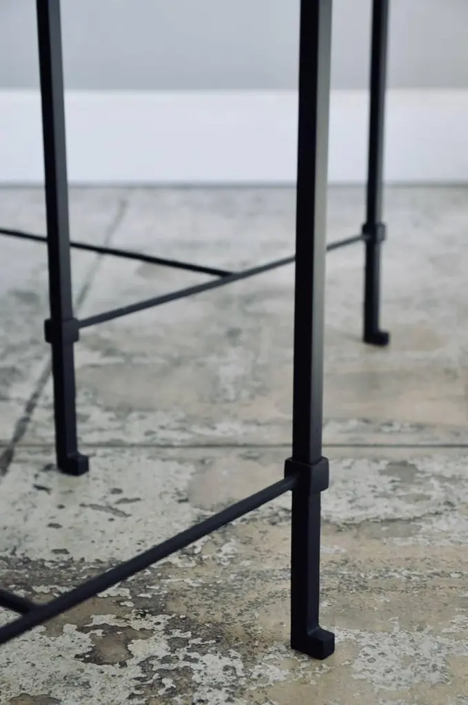 Pair of 'Diagramme' wrought iron and travertine side tTables by Design Frères.Measures: Lower bar is 4.5" inches from the floor.