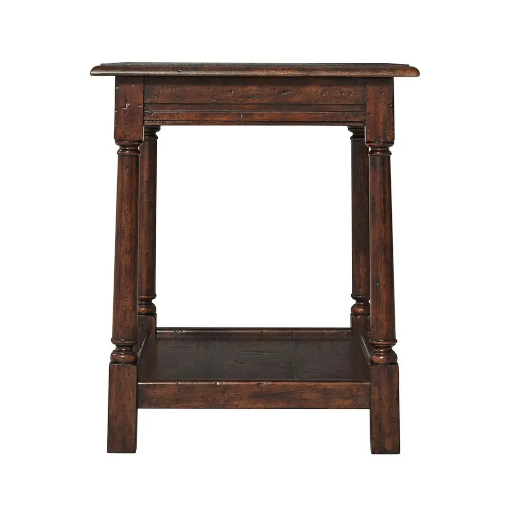 Early English mahogany and reclaimed oak occasional 'Joynt' table, the planked rectangular top with a molded edge, above a paneled frieze with gently splayed turned legs terminating in block feet joined by a planked tray under tier. Inspired by a 17th century 'Joynt' stool.Dimensions: 28" W x 20" D x 24" H.