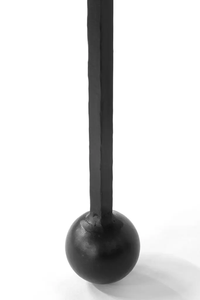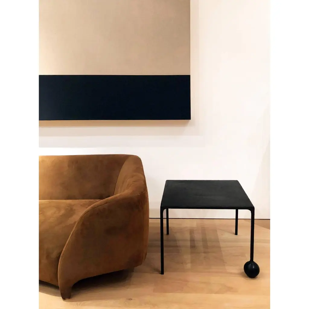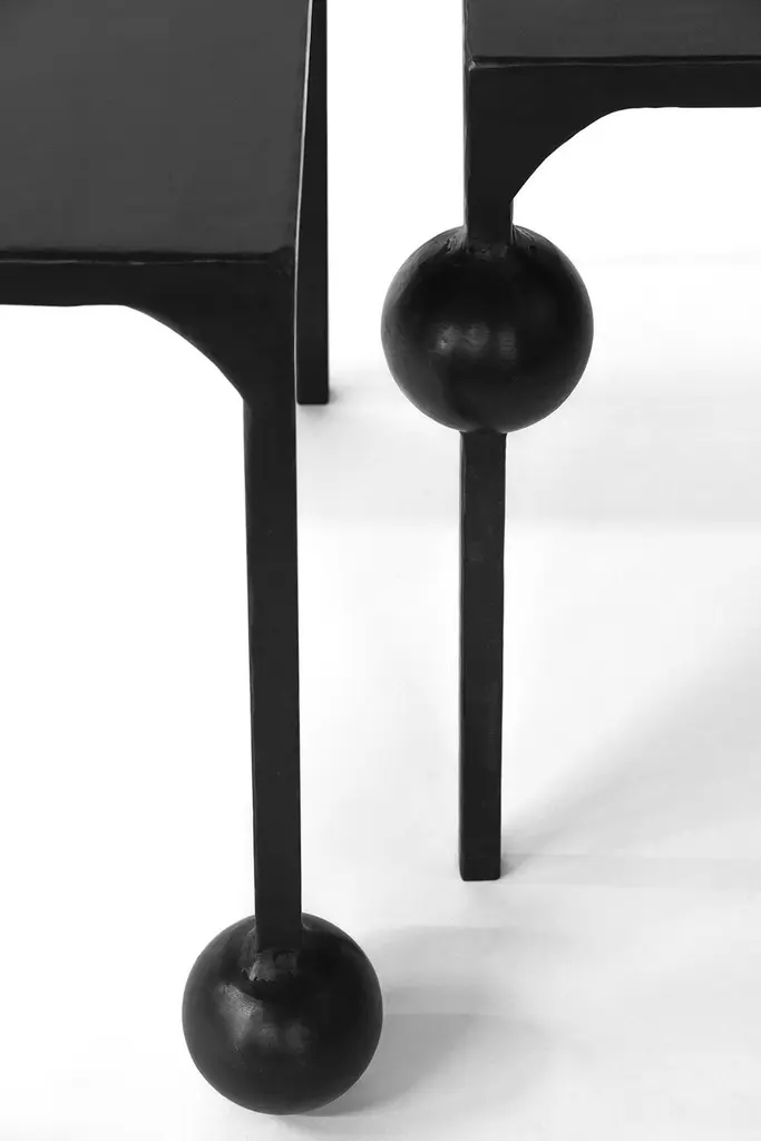 TABLE NO. 2 - SETJ.M. Szymanskid. 2017This geometric, solid, steel structure is supported by a cast-sphere base. The refined simplicity of this design speaks volumes, and adds depth and elegance to any space. Custom sizes available. Made in the Bronx, New York, USA.Our products are fabricated and finished by hand, so variations in size, shape, and patina color are a natural result of this process. Tooling marks and surface scratches are part of the character of many finished pieces. All products are sealed with oil and wax, which, over time, are not impervious to moisture. Our blackened steel pieces installed outside or in areas exposed to moisture indoors, especially in marine environments, will rust. Condensation from hot and cold drinks will leave rings on blackened steel table tops. Coasters or placemats can protect the finish. Periodic maintenance of blackened steel items may be required.