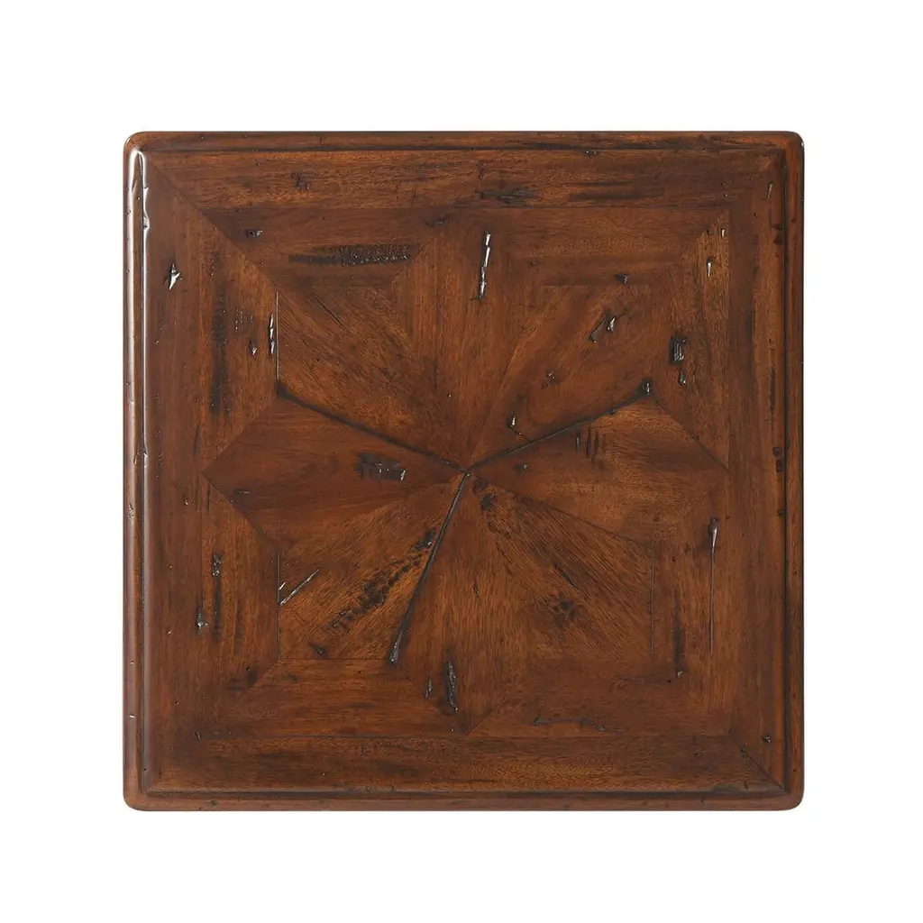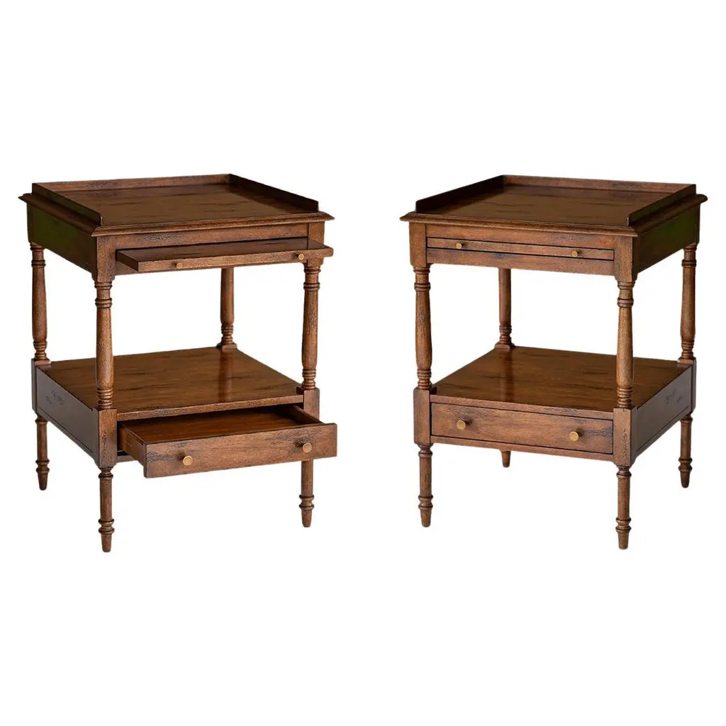 An English Country Rustic style antiqued wood side table, with a frieze drawer, on turned legs joined by a planked under tier.Dimensions: 18" W x 18" D x 26" H.