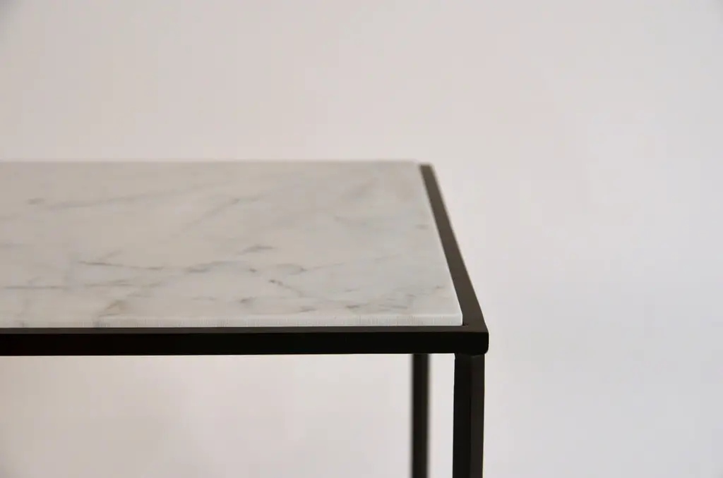 Chic pair of wrought iron and marble 'Entretoise' side tables by Design Frères. Matte black wrought iron bases with honed white veined marble tops.