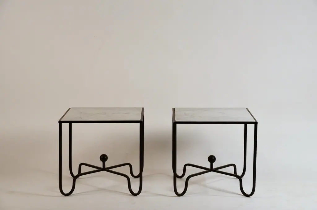 Pair Of 'Entretoise' Wrought Iron And Honed Marble Side Tables By Design Frères