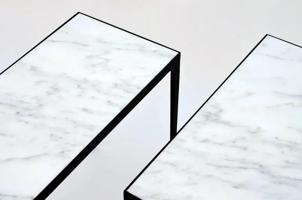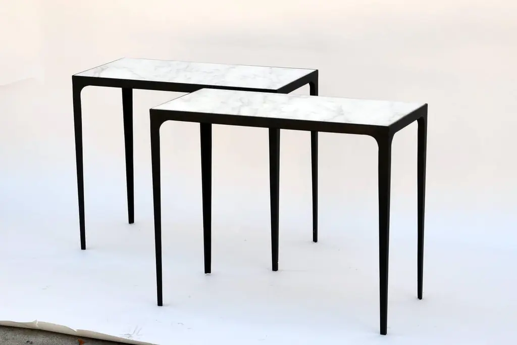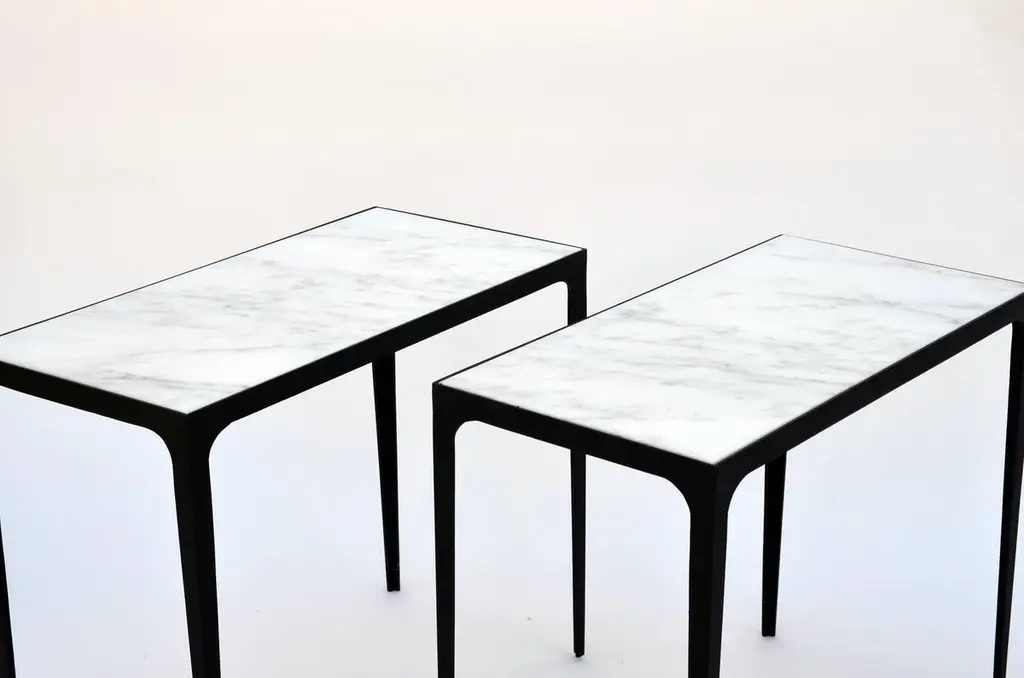Pair 'Esquisse' of wrought iron and honed marble side tables in the style of Jean-Michel Frank.