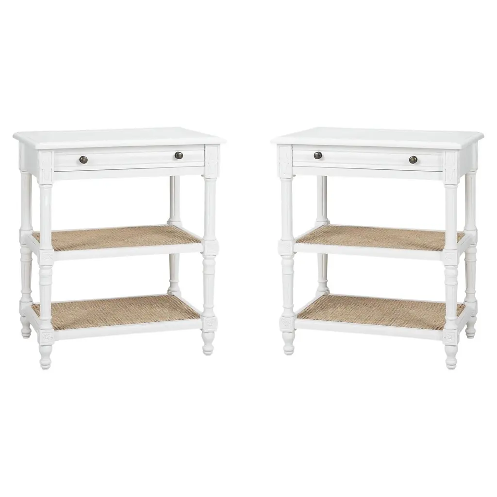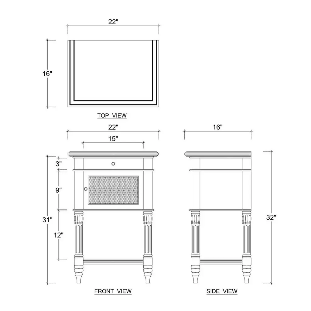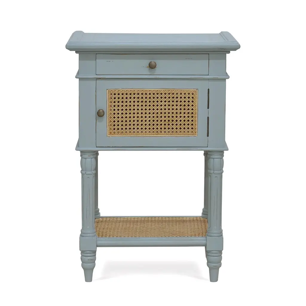 This exquisite piece combines timeless 18th-century French Provincial design with modern functionality. The lightly distressed Ocean Blue painted finish and intricate details make it a standout centerpiece that enhances any decor style.The molded dish top above a central cupboard and raised on turned and fluted legs with a natural rattan caned shelf stretcher. Crafted with solid wood, this end table ensures durability and longevity, making it a cherished addition to your home.Dimensions: 22" W x 16" D x 32" HCustom finish options are also available. Contact us to learn more.