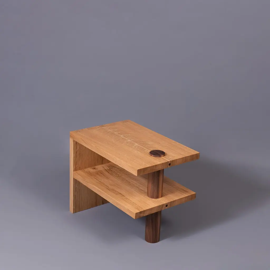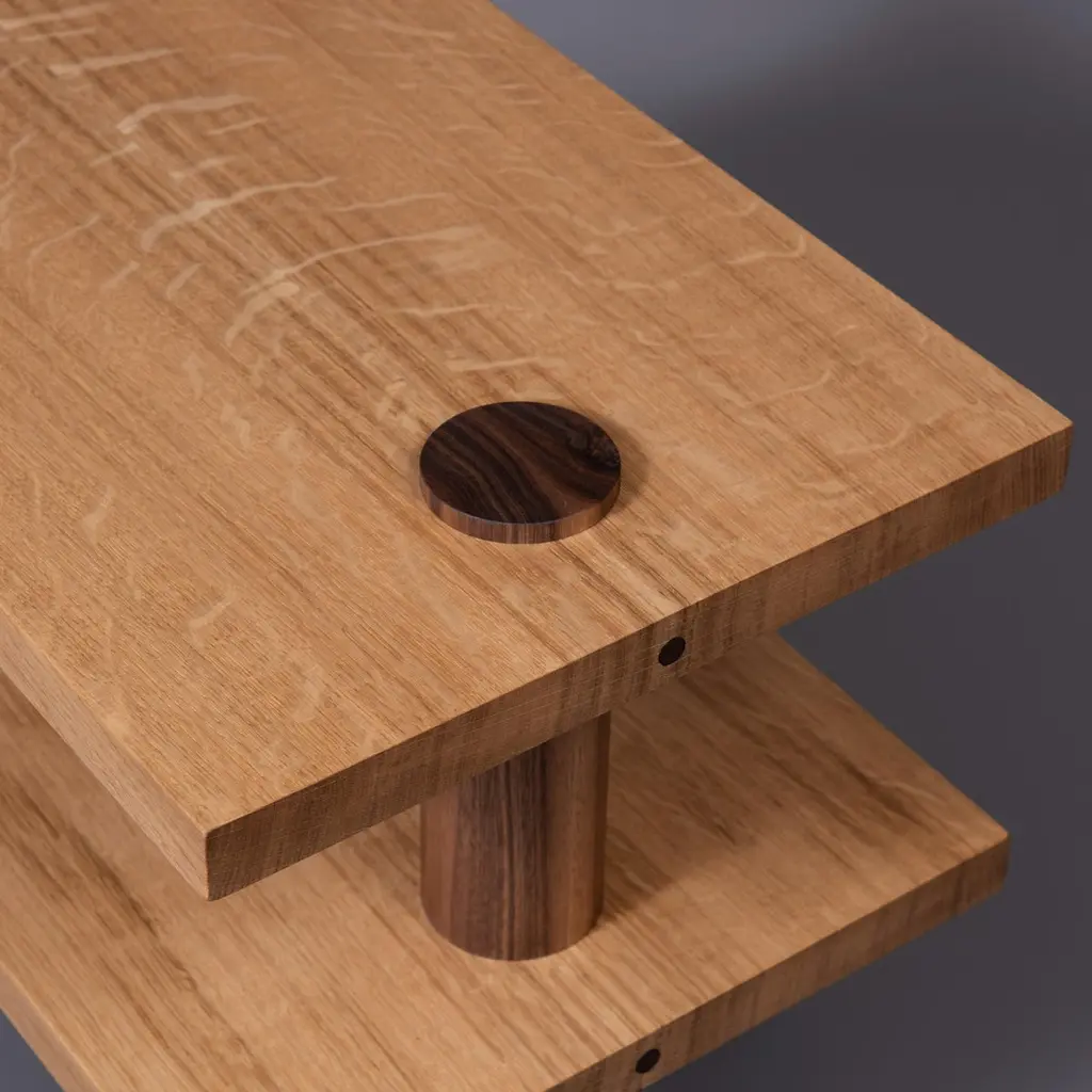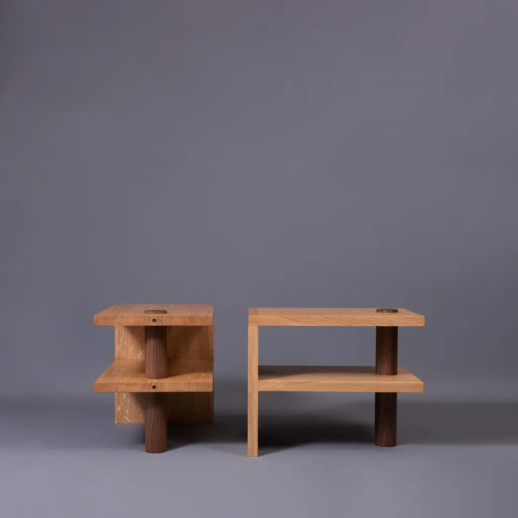 Architectural quartersawn English oak & American black walnut pillar end tables or nightstands. Designed and handcrafted in England using traditional furniture cabinetry techniques from fully quartersawn English Oak and American Black Walnut. The finest English oak displaying its magnificent medullary rays that are so prized by furniture makers the world over with a hand turned walnut upright column piercing through the sections. These are intended as multi functioning pieces of furniture. They are substantial, bold and striking pieces of completely handmade furniture, built to last. Finished in durable eco oil.We design bold and distinctive pieces of furniture – our main objective is combining the design alongside the natural beauty and properties of the raw materials.These timbers and materials are very carefully chosen for each specific design - maintaining our focus on the benefits, visual impact and strengths of what we use. Our regular use of English Quartersawn Oak is one case in point. It has been the beloved timber of fine furniture makers across the world for centuries. It is costly to produce but gives huge benefits and rewards such as its striking medullary rays and superb stability qualities. By utilising these wonderful and naturally occurring features with our contemporary designs we aim to continue creating some very distinct, tactile and idiosyncratic pieces.These are all completely handmade, in very small numbers, by our skilled craftspeople in England.