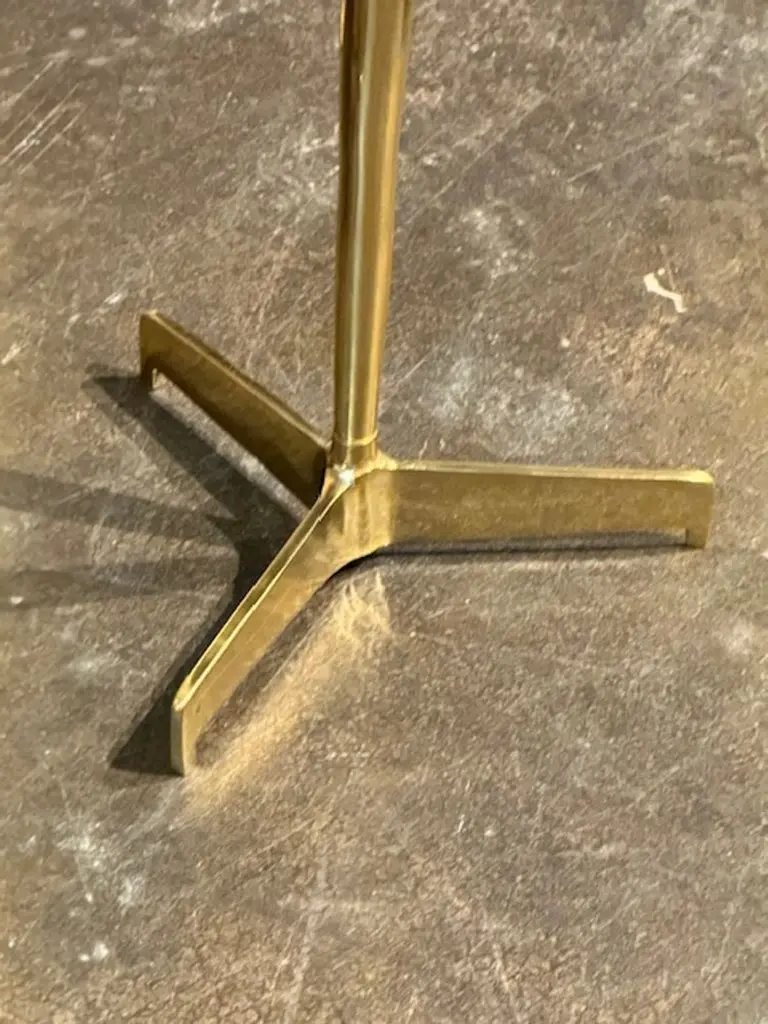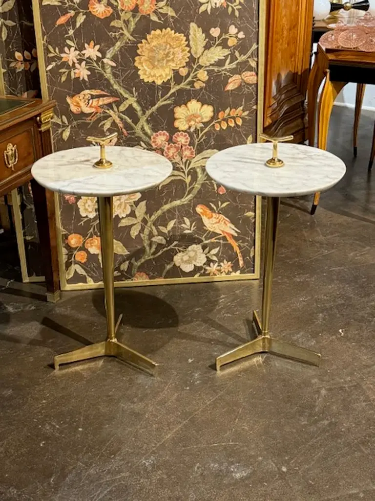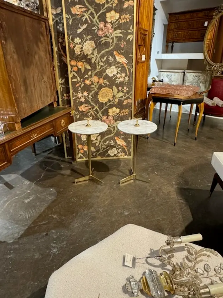 Stylish pair of modern Italian designer drink tables made of brass and Carrara marble. Creates a sleek look. Very nice!