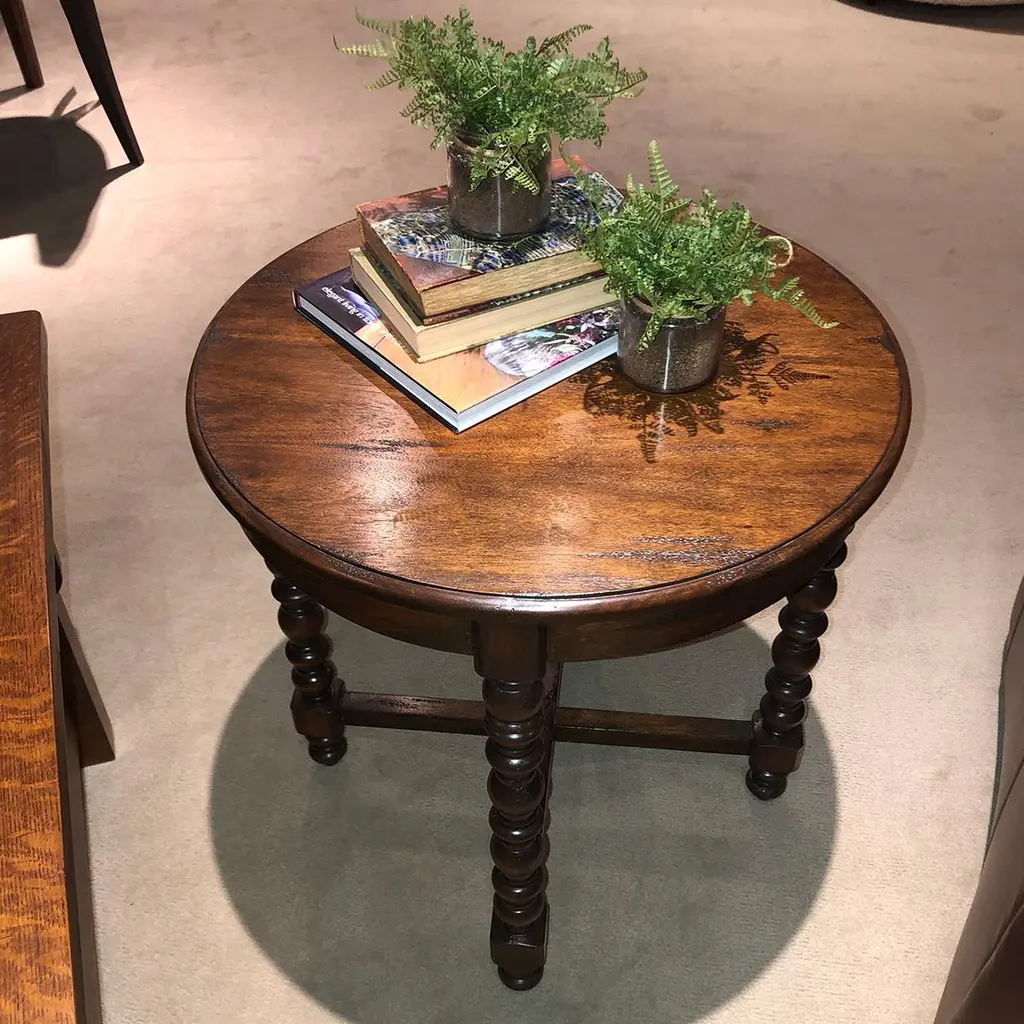 A Jacobean style round side table with an ogee top edge, in our distressed rustic country wood tone with natural highlights, with a hand rubbed satin finish.Dimensions: 24" W x 24" D x 24" H.