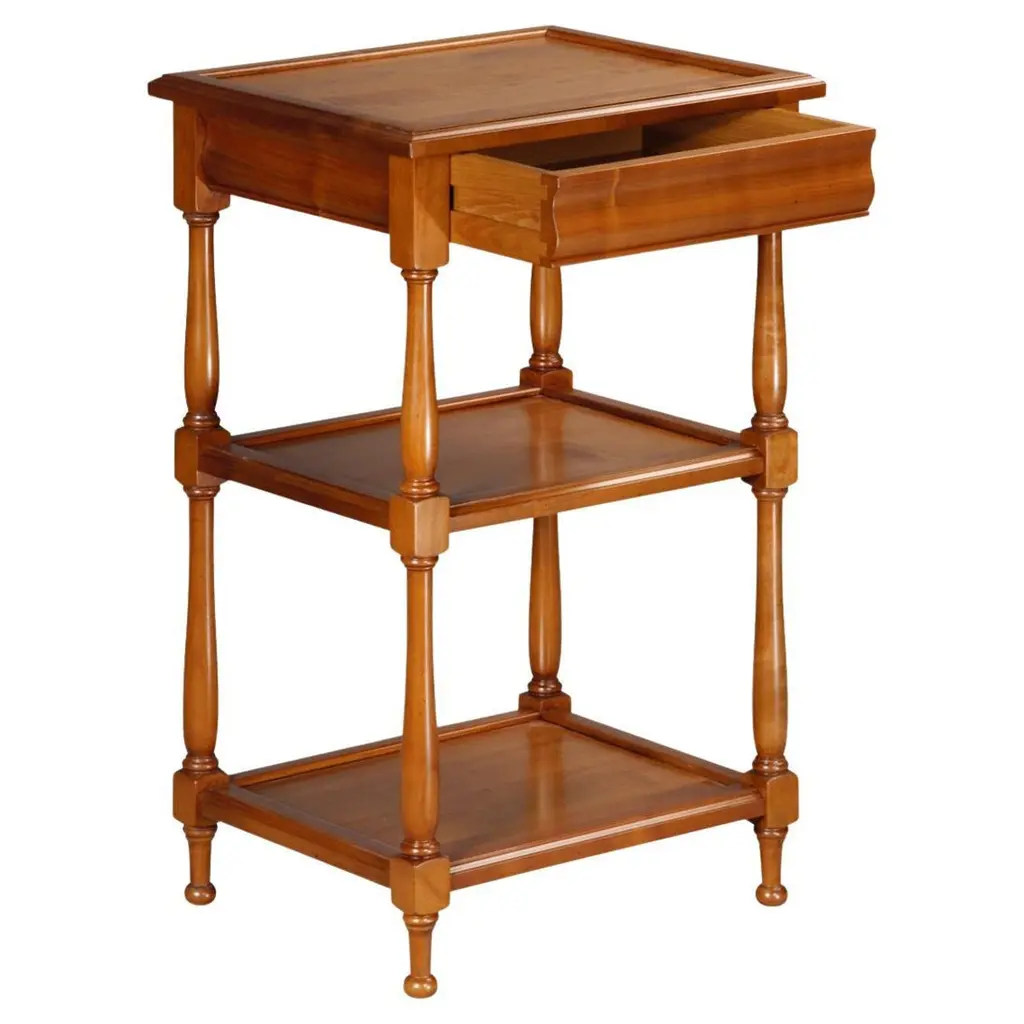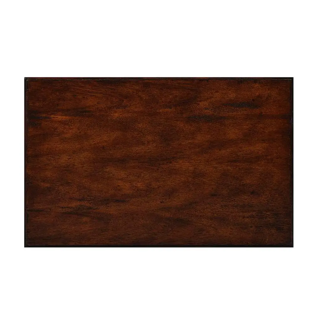 A Jacobean style rectangular one-drawer side table with an ogee top edge, in our distressed rustic country wood tone with natural highlights, with a hand-rubbed satin finish with a brass pull and lower shelf stretcher.Dimensions: 14" W x 22" D x 24" H.