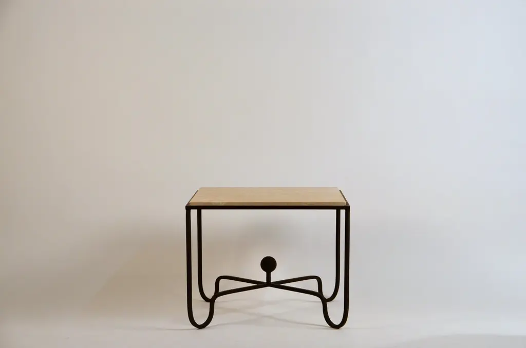 Pair of large 'Entretoise' scream travertine side tables by Design Frères.Great as sofa end tables or as a 2 part coffee table.Chic grooved cream travertine tops over matte black wrought iron bases.