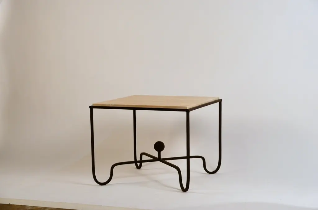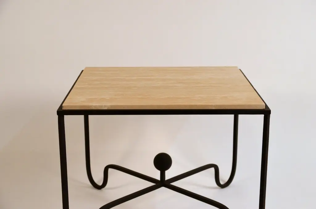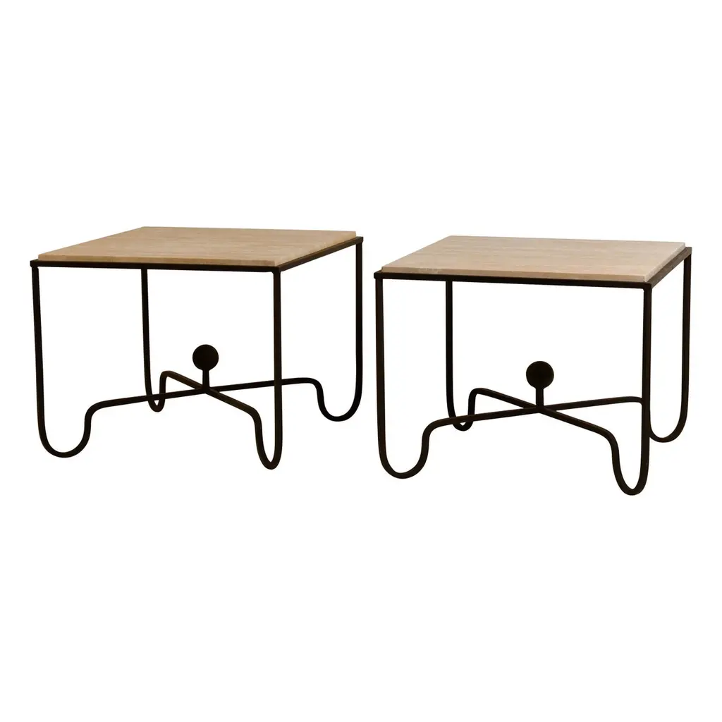 Pair of large 'Entretoise' scream travertine side tables by Design Frères.Great as sofa end tables or as a 2 part coffee table.Chic grooved cream travertine tops over matte black wrought iron bases.