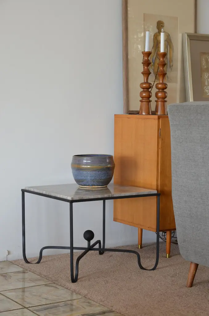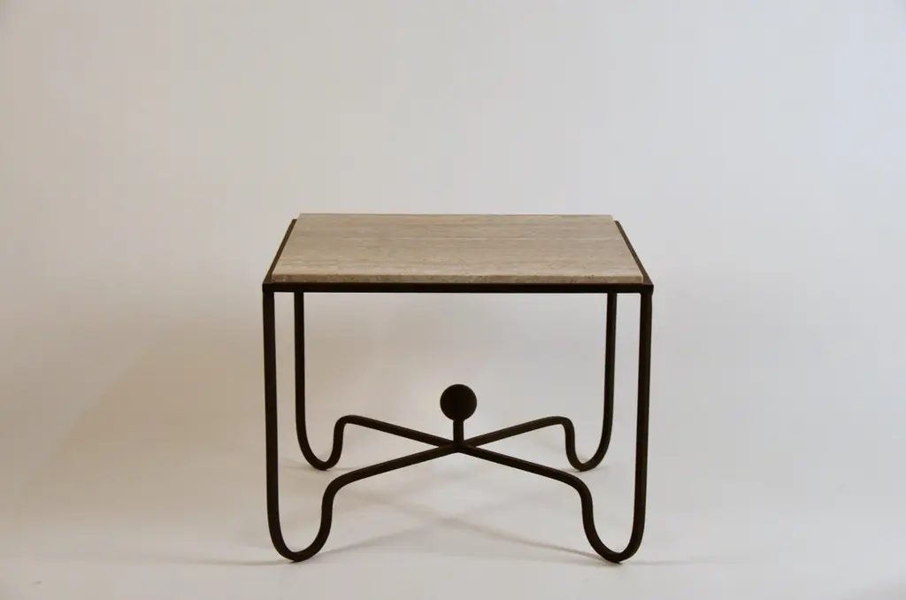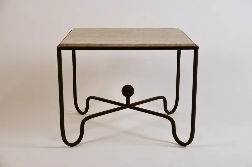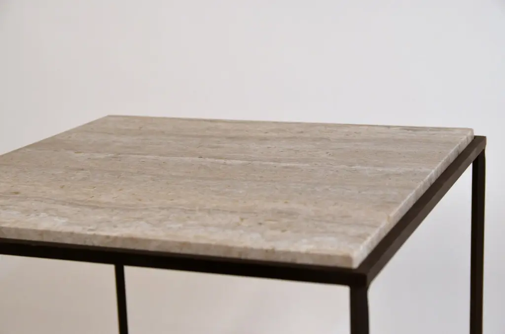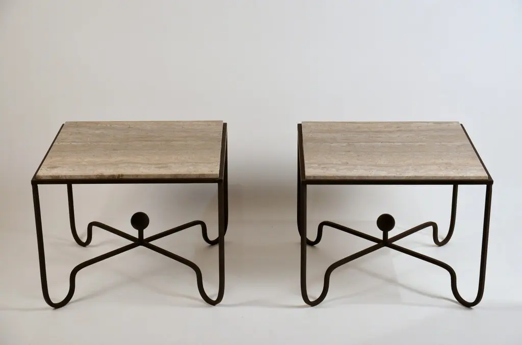 Pair of large 'Entretoise' silver travertine side tables by Design Frères.Great as sofa end tables or as a 2 part coffee table.Chic linear veined silver travertine tops over matte black wrought iron bases.