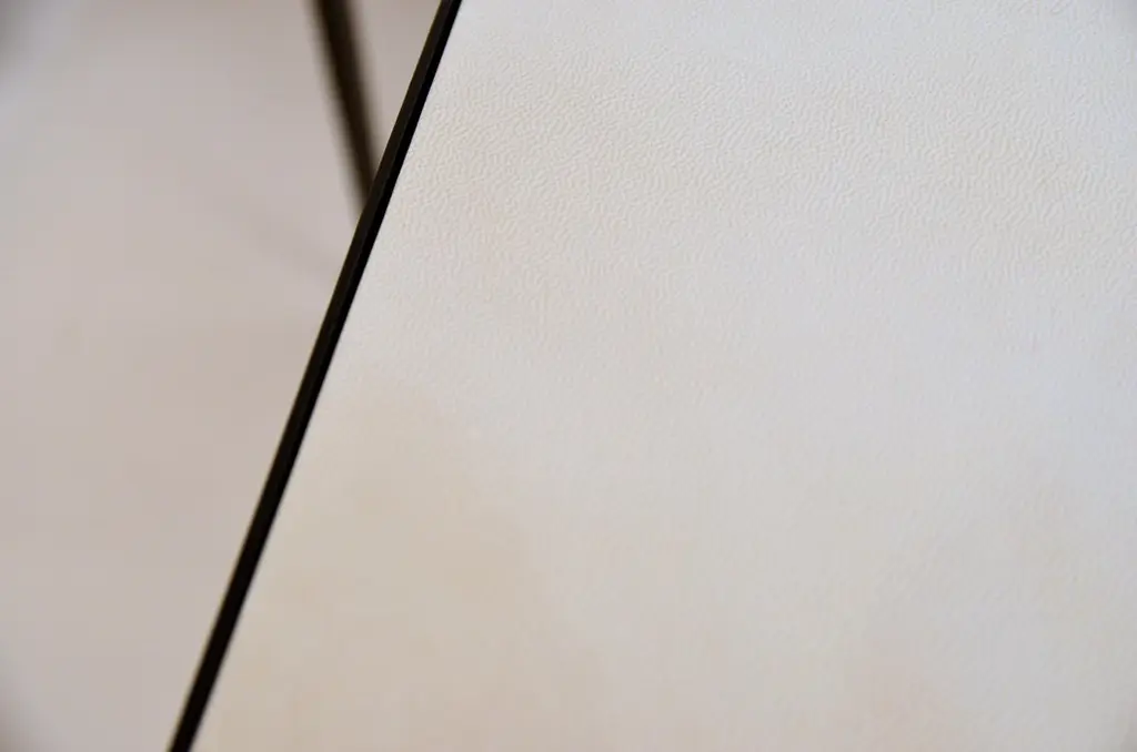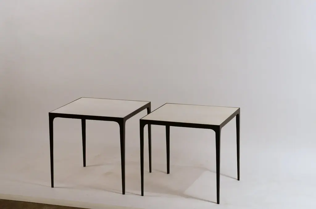 Pair of large 'Esquisse' wrought iron and parchment side tables by Design Frères. Also great as night stands.Hand made, these elegant side tables combine chic slender blackened wrought iron bases with refined real parchment tops, adding an air of understated luxury to the living room or the bedroom.