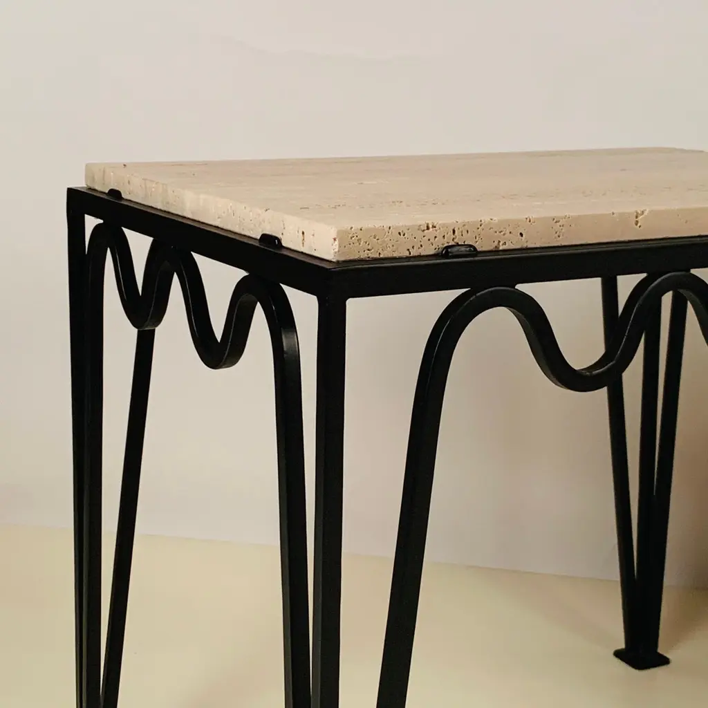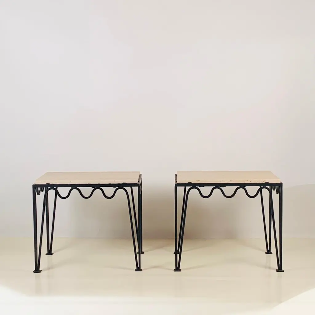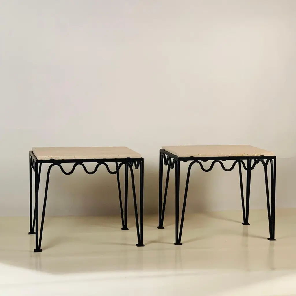 Sturdy powder coated frames fitted with Italian travertine tops. Inspired by the timeless aesthetic of French modern design, these side tables from our exclusive design Frères line are handmade in our Los Angeles atelier by our skilled artisans. These classic, understated pieces will blend in, structure and enhance any space.