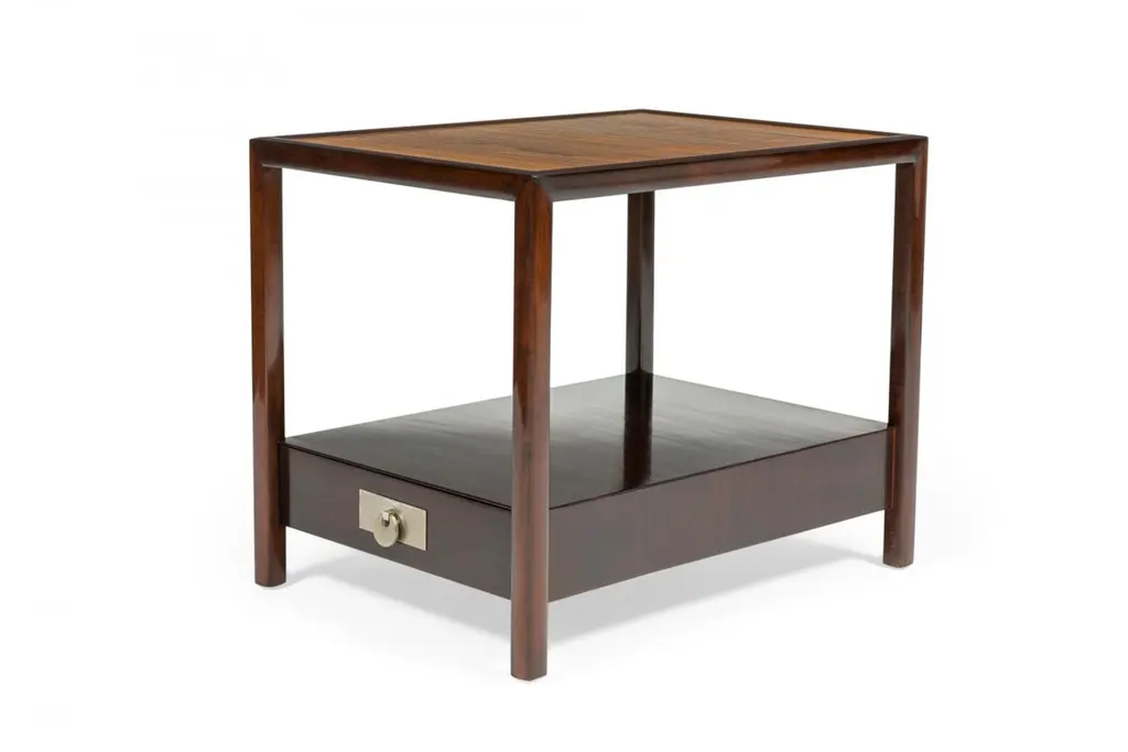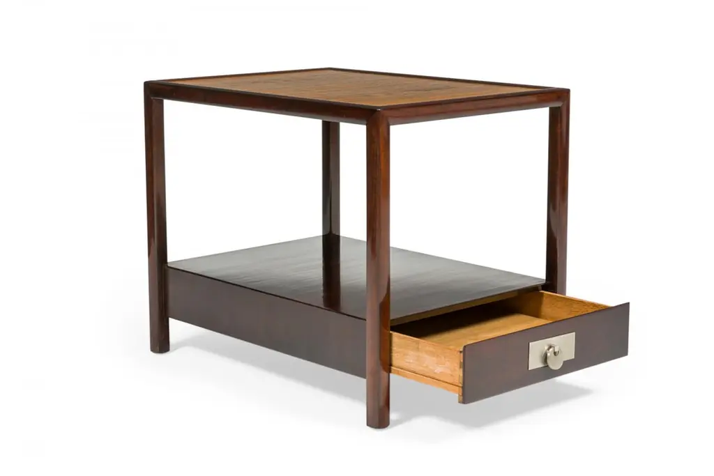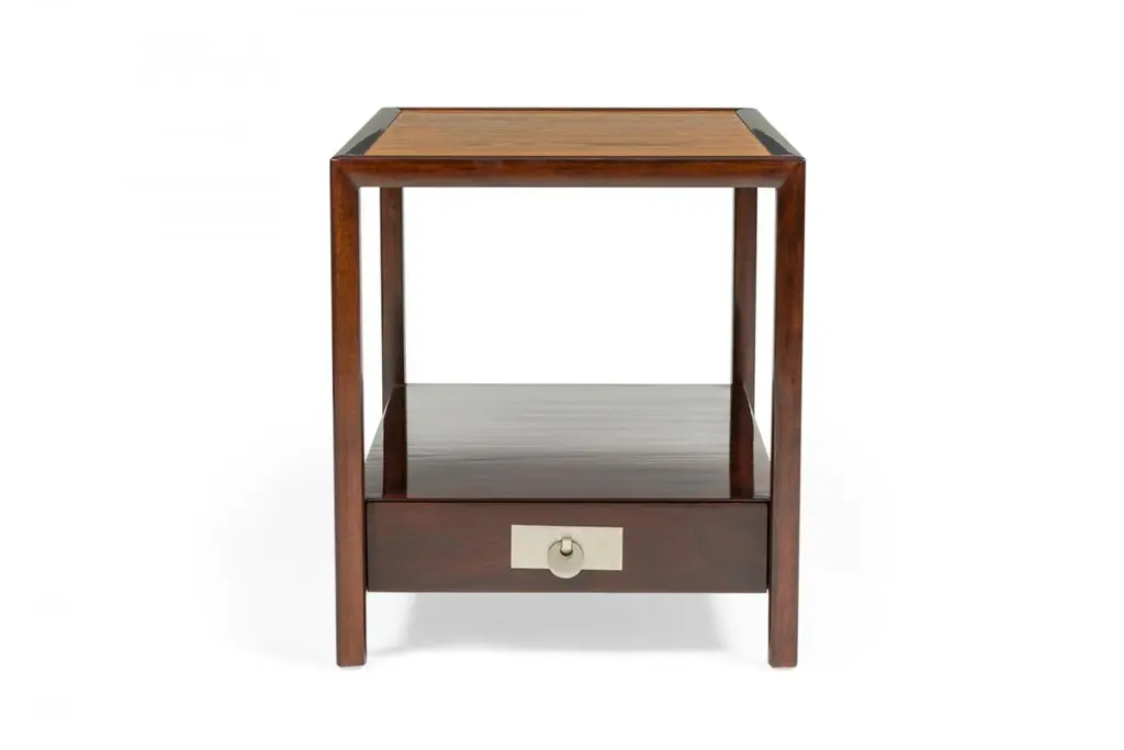 PAIR of American Mid-Century rectangular end / side tables with mahogany frames, inset teak tops, and a single lower drawer with silver metal coin drop drawer pulls. (NEW WORLD SERIES, MICHAEL TAYLOR FOR BAKER FURNITURE COMPANY)(PRICED AS PAIR).