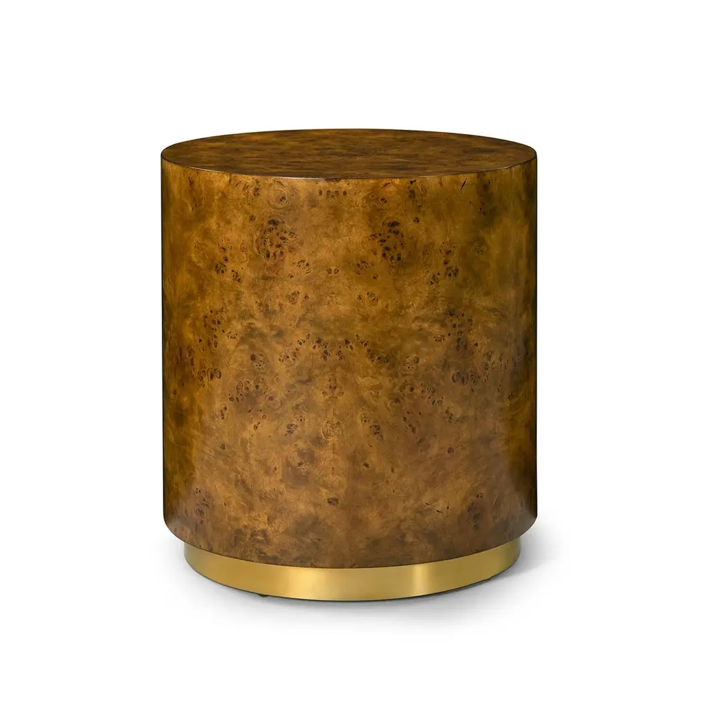 A sleek and sophisticated accent piece that blends natural textures with contemporary elegance. Featuring a richly patterned mappa burl veneer, this table showcases a warm, organic aesthetic. The cylindrical silhouette is complemented by a polished brass-finished base, adding a touch of luxury and modern contrast. Perfect as a side table, nightstand, or decorative accent, its versatile design fits seamlessly into living rooms, bedrooms, or sitting areas. Functional and stylish, this side table elevates any space with its timeless charm.Dimensions: 20" W x 20" D x 22" H