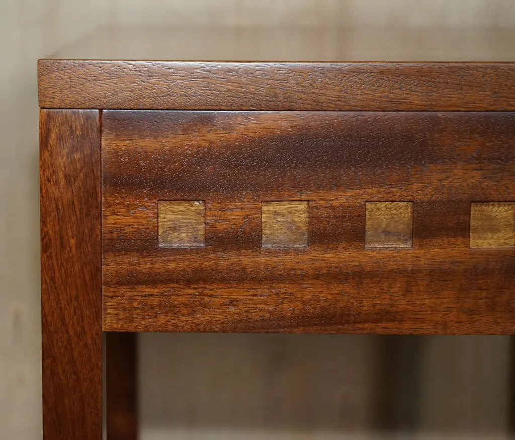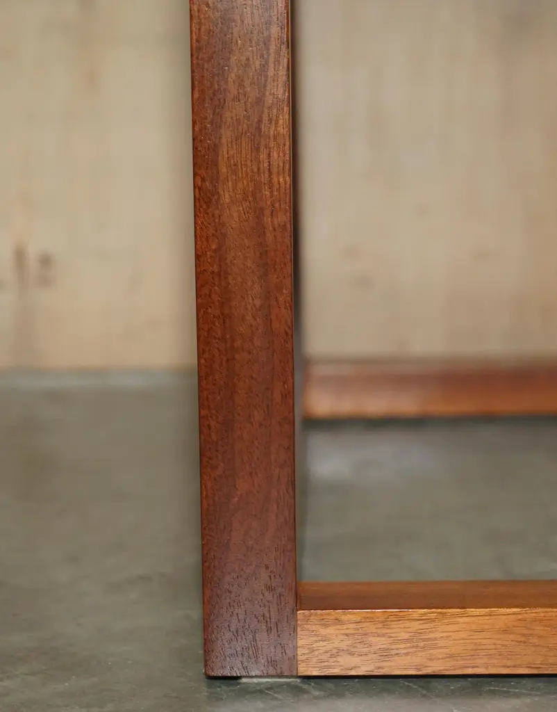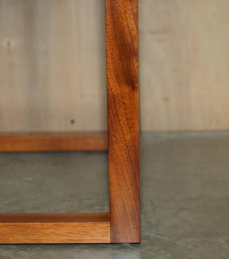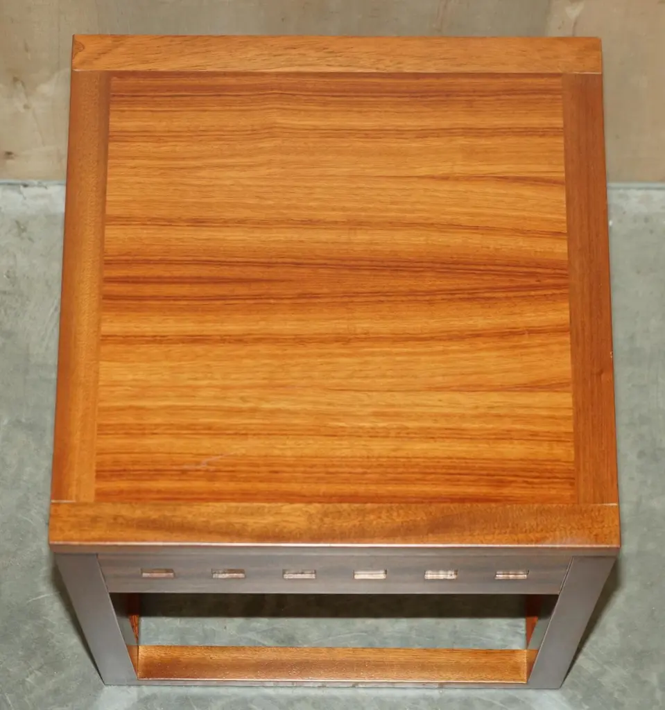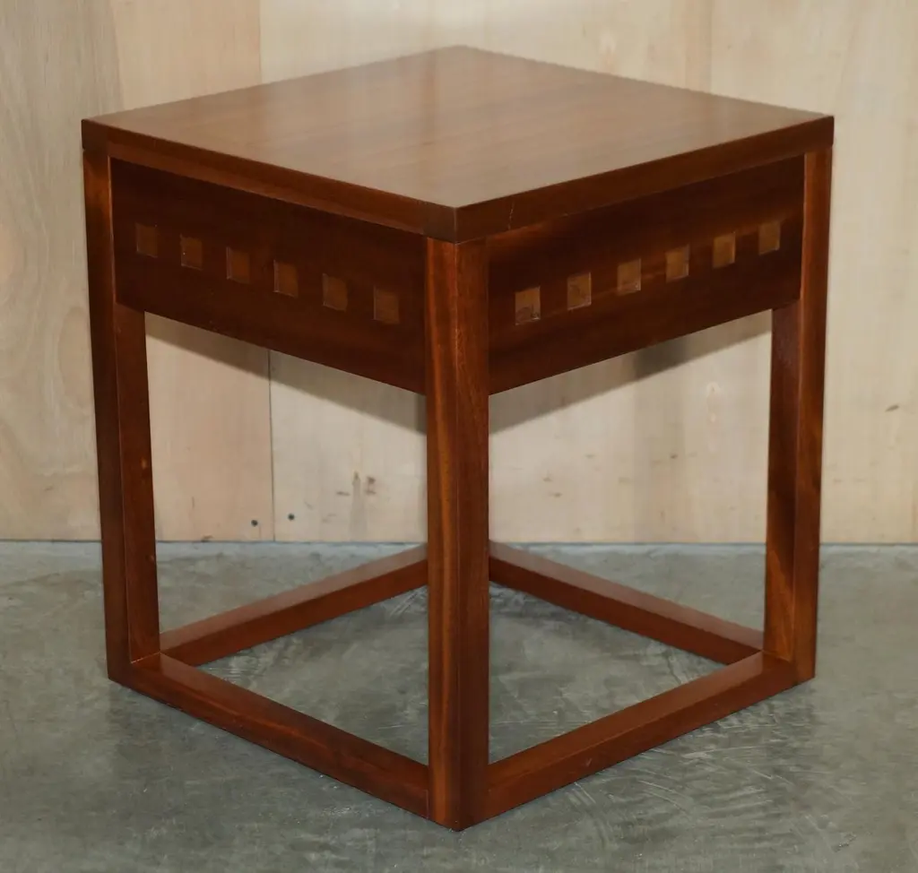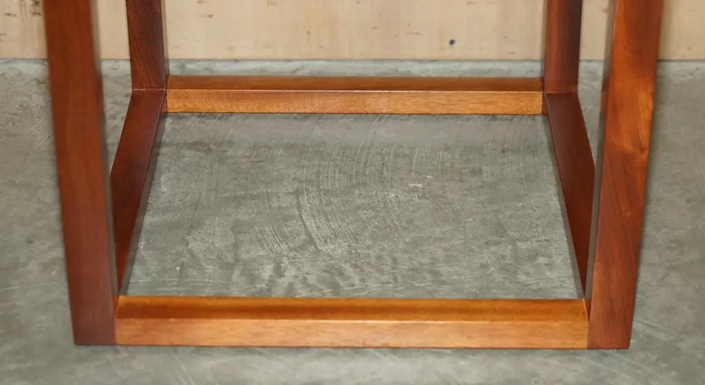 We are delighted to offer for sale this lovely pair of Cherry wood and teak side tables which are part of a setThese are very well made and good-looking,the teak and cherry give them a nice natural feelThe condition is very good, we have lightly cleaned waxed and polished them from top to bottomDimensionsHeight:- 58.5cmWidth:- 51cmDepth:- 51cmPlease note all measurements are taken at the widest point.ConditionPlease view the very detailed pictures as they form part of the description pertaining to the condition. Please note vintage period and original items such as leather seating will always have natural patina in the form of creasing and wear, we recommend annual waxing to ensure no moisture is lost, also hand dyed leather is not recommended to sit in direct sunlight for prolonged periods of time as it will dry out and fade.