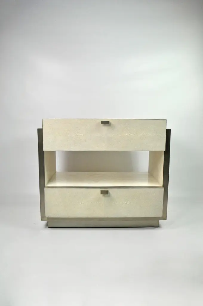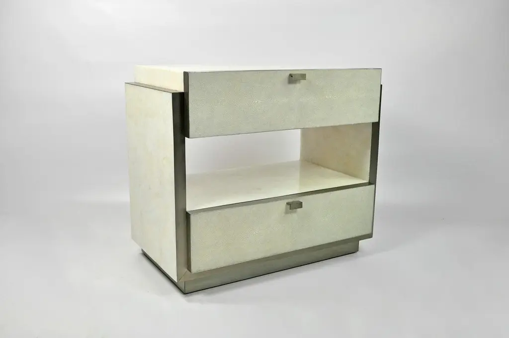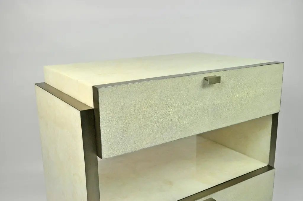 This rectangular bedside table has two drawers and it is made of white rock crystal marquetry with shagreen drawers.The edges and the base have brushed stainless steel trims.The handles are in stainless steel.The dimensions of this piece are W23.6" x D15.35" x H23.6" (60x39x60cm). Care instructions:Keep the materials dry and protected from direct sunlight and heat surfacesTo clean, simply wipe with a dry clean clothDo not use any cleaning agent on the surfaceThis piece is handmade by our talented master craftsmen. The price is for the pair.Ginger Brown is a family-owned company based in Normandy, France that has been creating collections of furniture and decorative accessories since 2001. Referring to the great period of early 20th century furniture makers, Ginger Brown strives to make each piece unique. Each piece of furniture, entirely handcrafted, is unique and created in collaboration with specialized artisans who use ancestral techniques to transform and sublimate raw materials. Mainly based on leather sheathing (shagreen, parchment) or marquetry (mother-of-pearl, fibers, stones), the collections are constantly evolving and can be adapted to the personalized demands of the clients.Whether futuristic, organic or classic, Ginger Brown’s creations are inspired by nature and architecture, and appeal as well names in international interior design. Ginger Brown also offers custom-made products to its clients.
