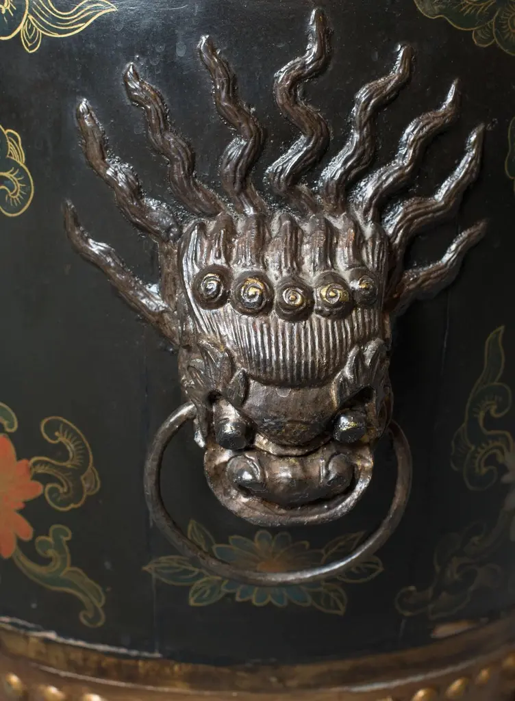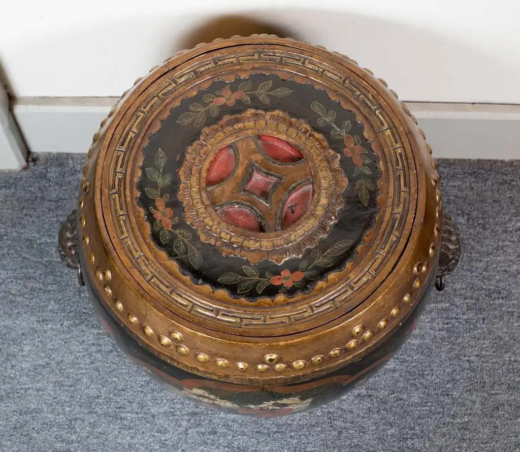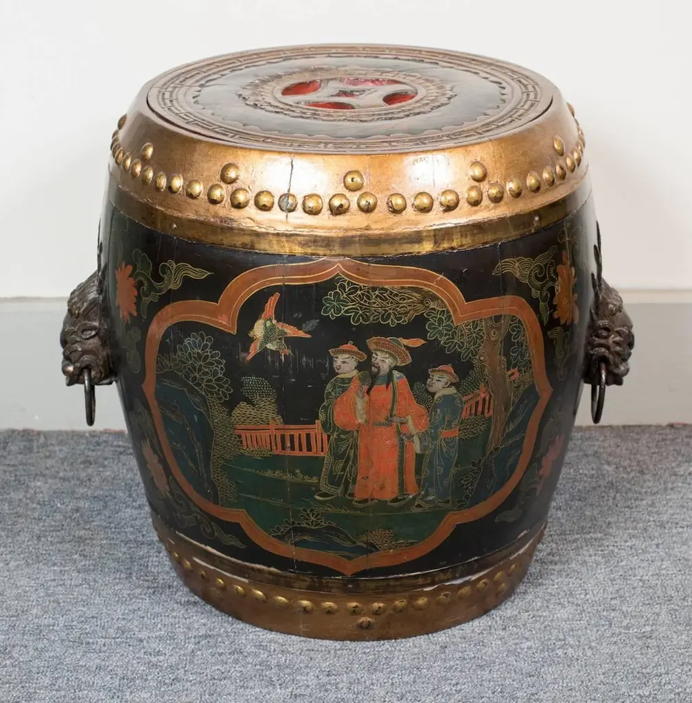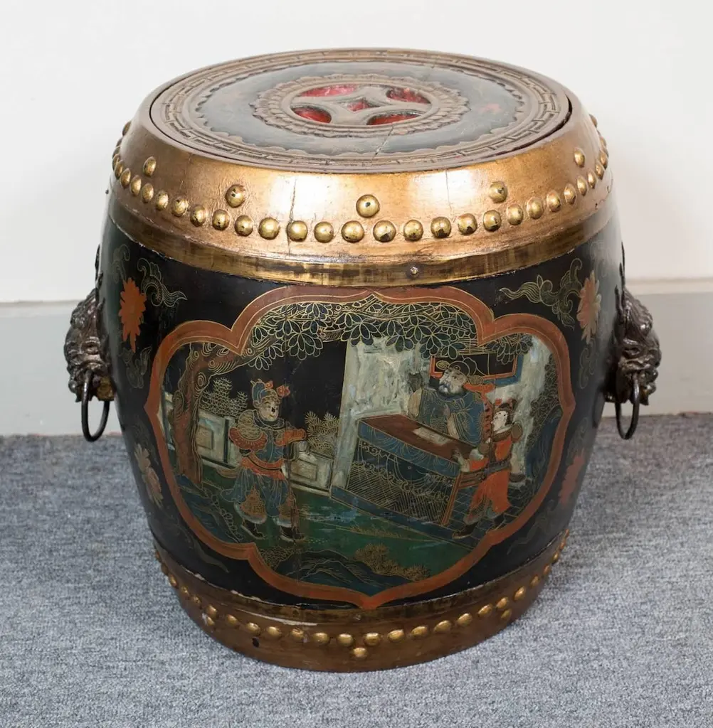 Pair of lacquered and painted wood Asian style barrel shape side tables fitted with decorative metal handles.