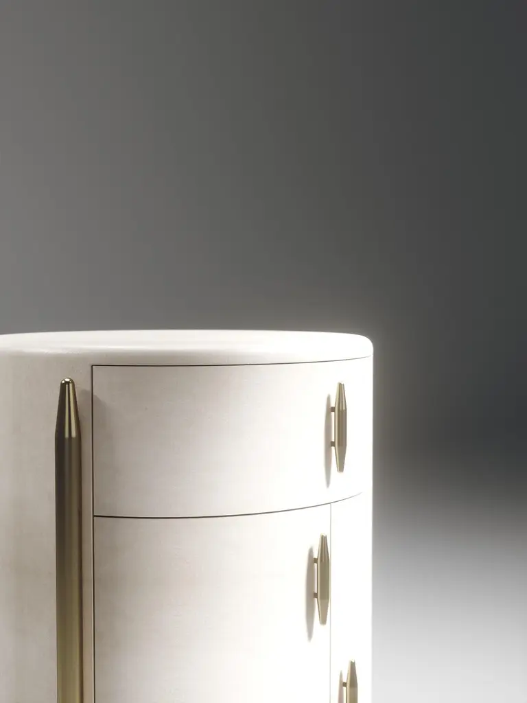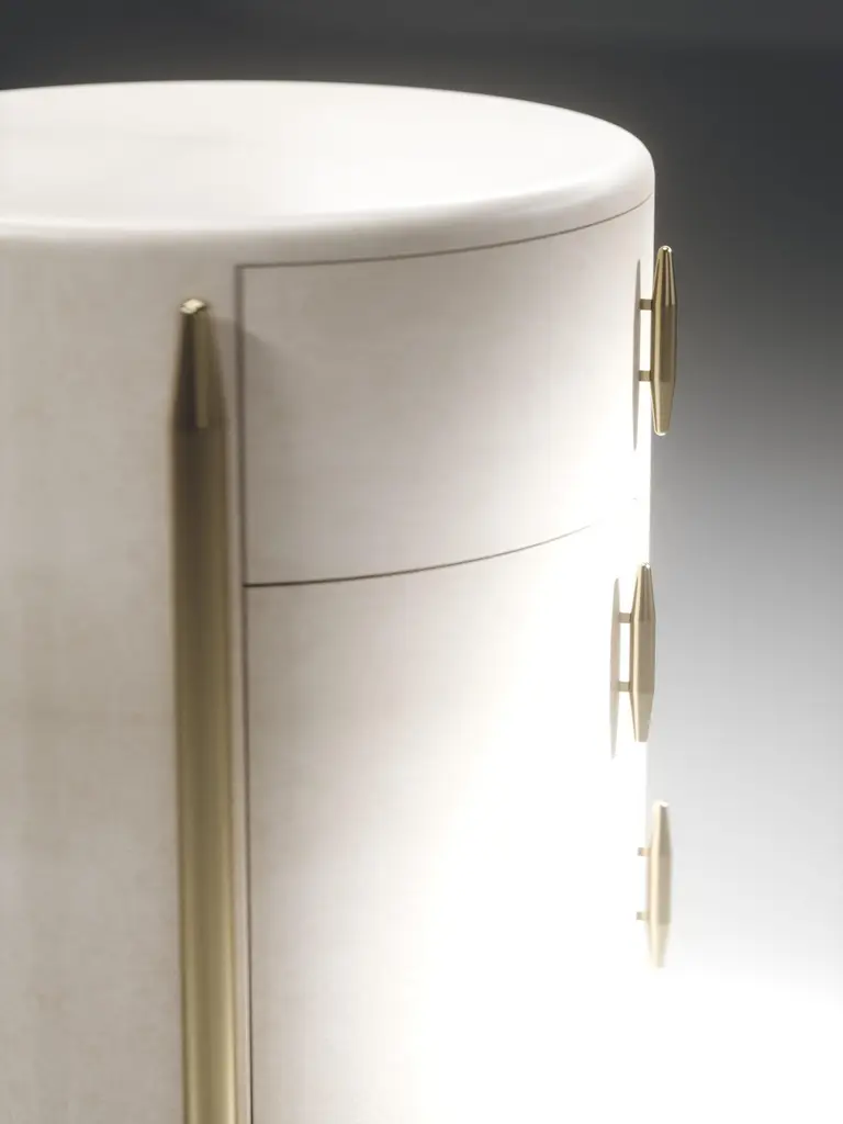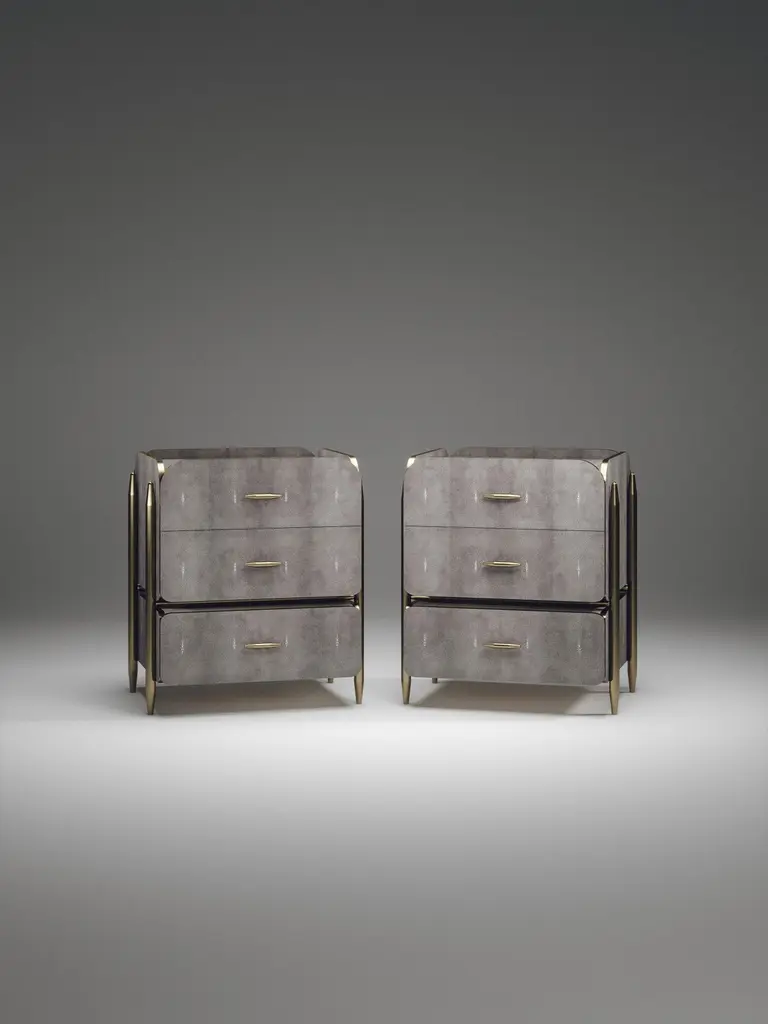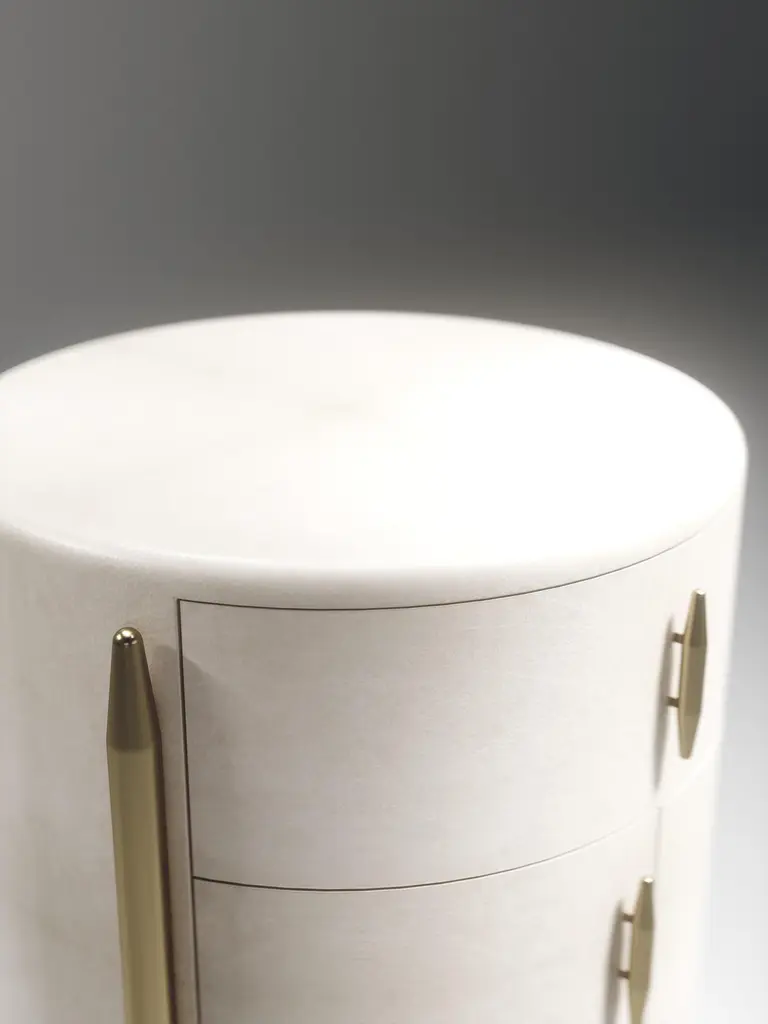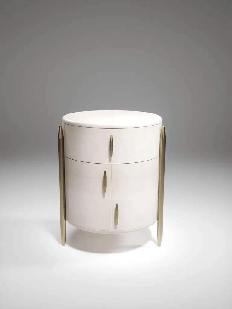 The Paris based label has distinguished themselves since their launch, with their iconic use of shagreen mixed with brass and other exotic materials. All furniture is handcrafted by skilled artisans, ultimately making each piece unique, designed in Paris and produced in the Philippines.The pair of Dandy round bedside table by Kifu Paris is an elegant and a luxurious home accent, inlaid in cream parchment with bronze-patina brass details. This piece includes 1 drawer total and a cabinet below; the interiors are inlaid in gemelina wood veneer. Available in shagreen and as a square version see images at end of slide. This piece is designed by Kifu Augousti, the daughter of Ria and Yiouri Augousti. Custom sizing/finishing available on request.All shagreen pieces are hand-dyed by artisans.The dimensions of this piece are 45 diameter x 60 cmAll Kifu Paris pieces are handmade by artisans, ultimately making each piece unique. Custom color or sizing available on request. Wipe clean with soft dry cloth.Although inspired by her parents, her collection of home accessories and furniture is a distinct identity of its own. Kifu uses handmade techniques of elaborate inlay patterns of shagreen, shells, semi-precious stones, materials she experienced as a child growing up in her parent’s studio, but interpreted in a younger quirkier way reflecting her youth. From her "jewelry inspired knobs" on decorative boxes, gold bar boxes and an extravagant inlay pattern mix of shagreen and shell inspired by galactic constellations, as seen on her enormous round mirror is refreshing to see. Kifu embodies whimsical elements throughout her collection and is not afraid to be daring and unexpected in her approach to design.All shagreen-covered items should be kept out of direct sunlight, color variants may occur on the stingray and other exotic finishes, but this showcases the Parisian label's commitment to creating authentic luxurious products using natural components.For all pieces inlaid with stone and semi-precious stones, due to the natural quality of the material color tonality and pattern placement may differ slightly per piece.