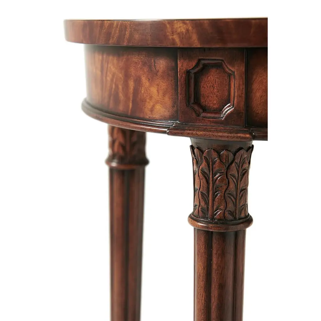 A Regency style flame veneered and mahogany lamp table, the oval top on gently splayed acanthus capital and reeded tapering legs joined by an under tier.Dimensions: 20" W x 17" D x 29.25" H.