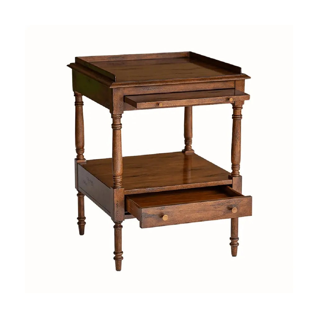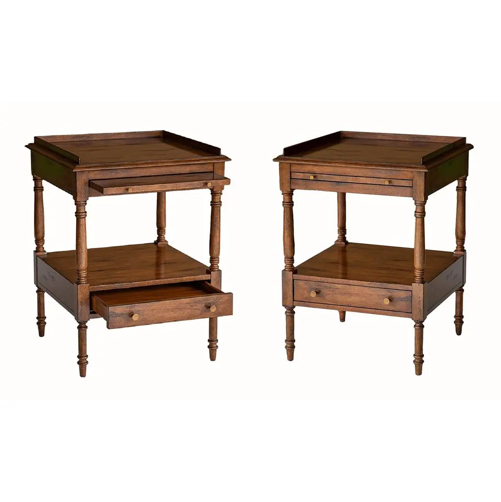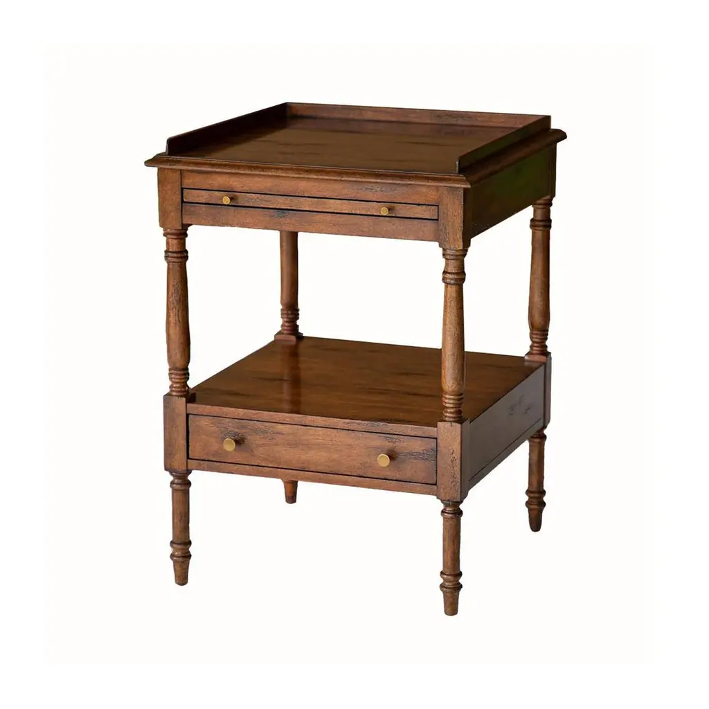 Regency style side table with a wooden gallery top, molded edge, with a pull-out slide about a lower shelf with drawer and turned legs all in a warm country wood tone and hand rubbed finish.Dimensions: 20" W x 20" D x 27" H.