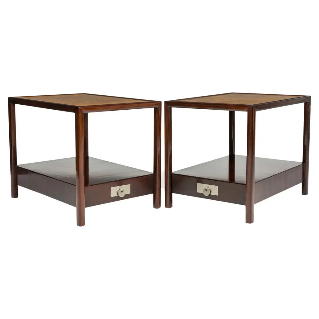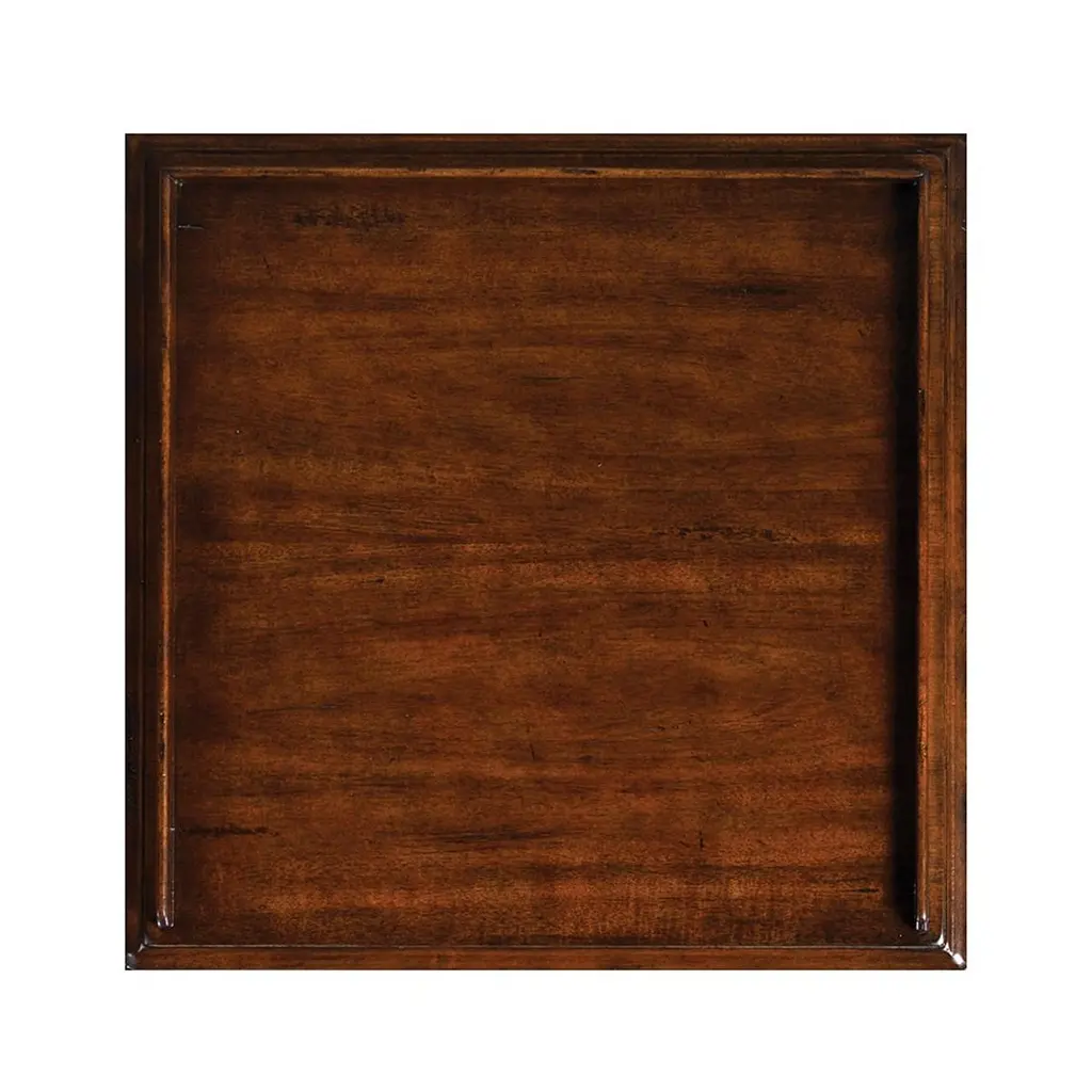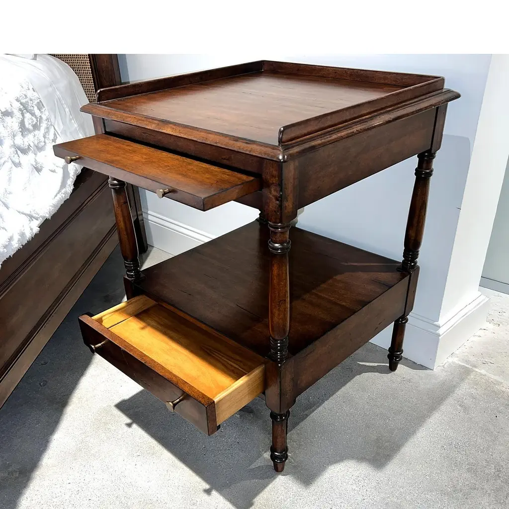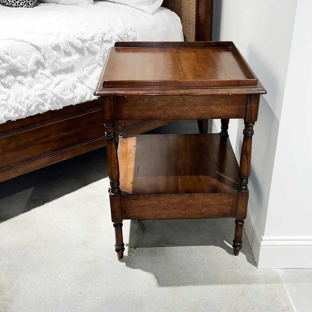 Regency style side table with a wooden gallery top, molded edge, with a pull-out slide about a lower shelf with drawer and turned legs all in a warm country wood tone and hand rubbed finish.Dimensions: 20" W x 20" D x 27" H.