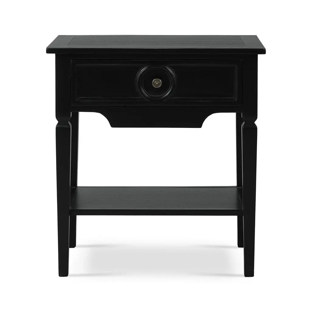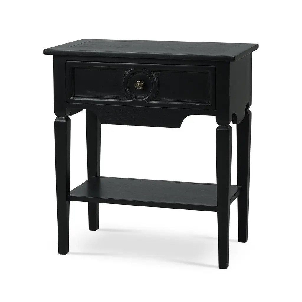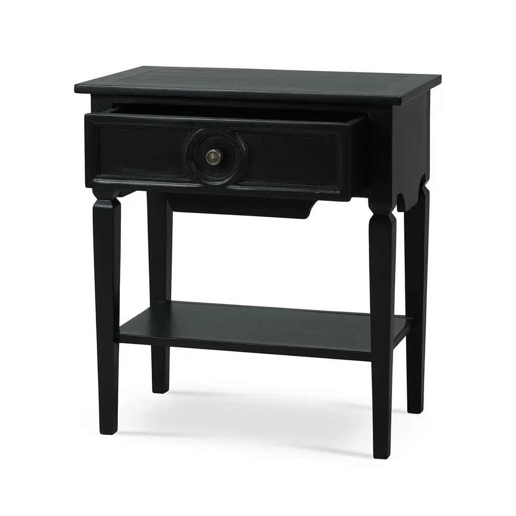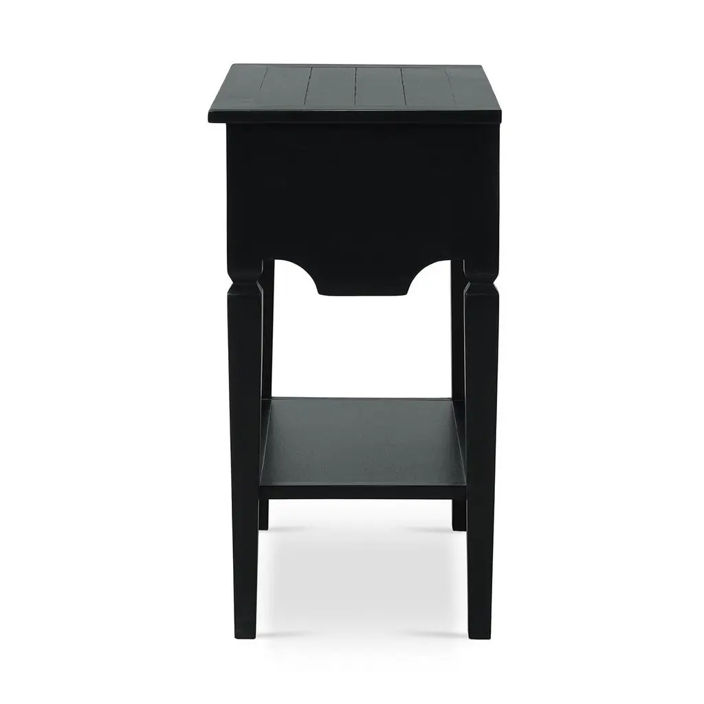 This stunning piece combines rustic European appeal with practical functionality, making it the perfect addition to any space. The Batavia Black finish and classic design elements create a cozy and inviting atmosphere in any home.Featuring a spacious drawer, this table provides ample storage for keeping your space organized and clutter-free. The open lower shelf offers additional space for displaying books, magazines, or decorative items. Crafted from solid mahogany, this end table is built to last, ensuring it will be a cherished part of your home for years to come.Dimensions: 27" W x 16" D x 30" HCustom finish options are also available. Contact us to learn more.