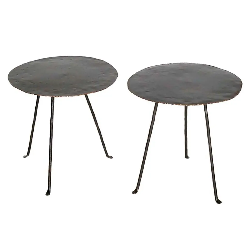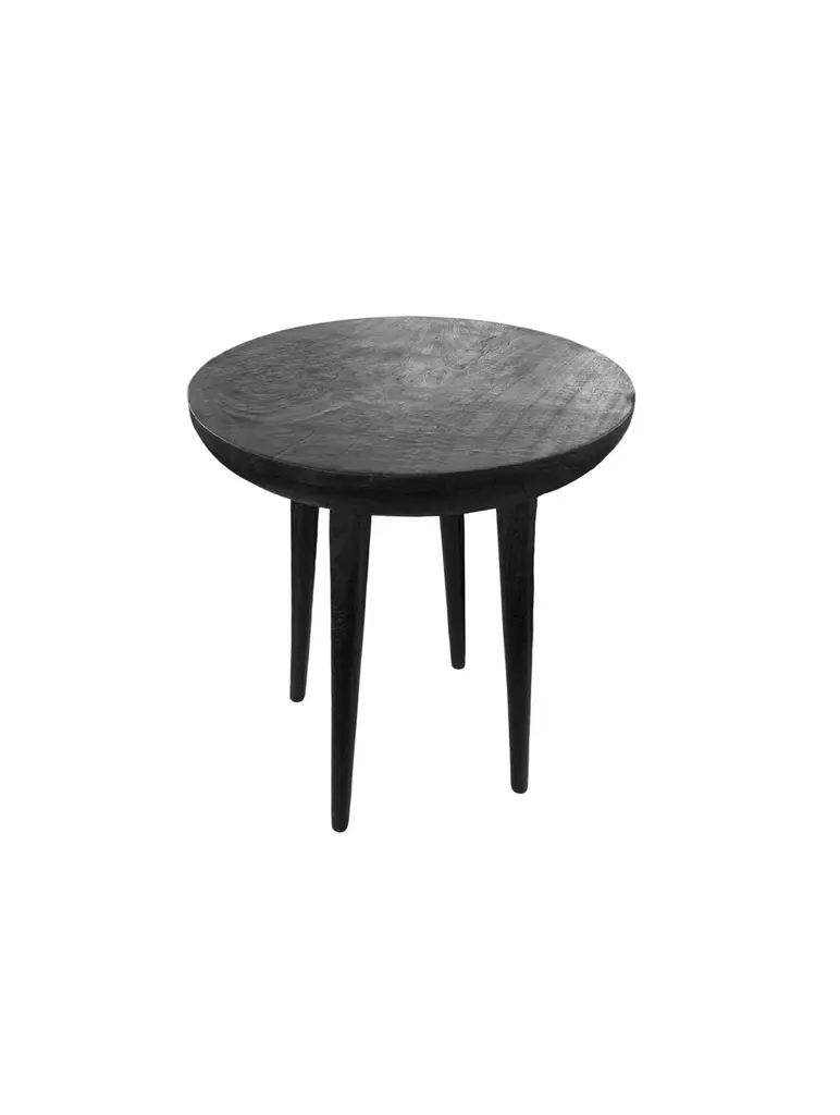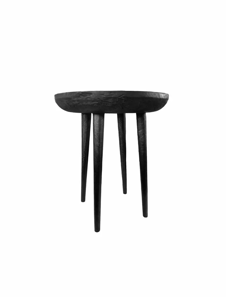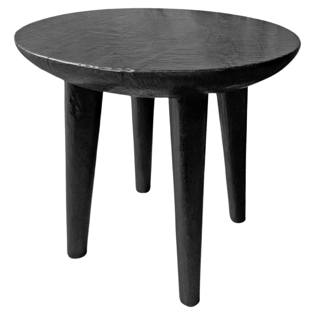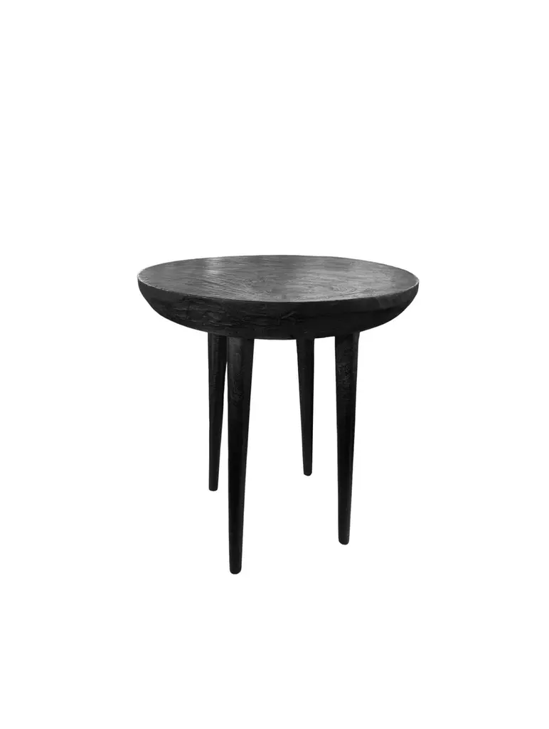A pair of wonderfully sculptural round side tables with narrowly proportioned legs. Their stark black pigment was achieved through burning the wood several times. Their neutral pigment and subtle wood textures make them perfect for any space. Uniquely sculptural and versatile pieces certain to invoke conversation. The tables are crafted from mango wood and have a smooth texture.