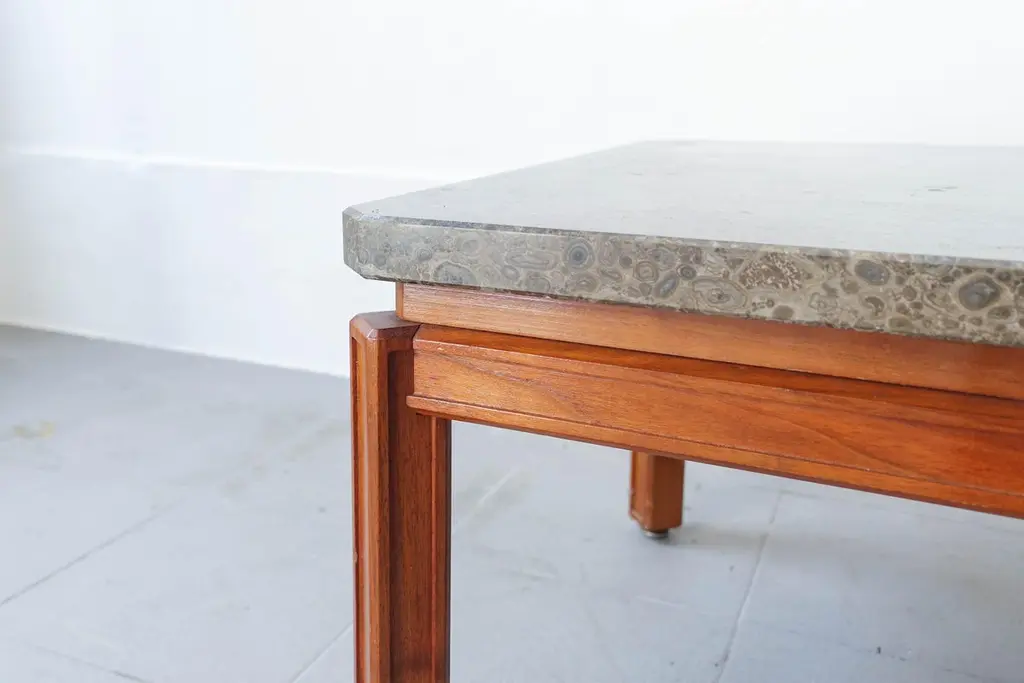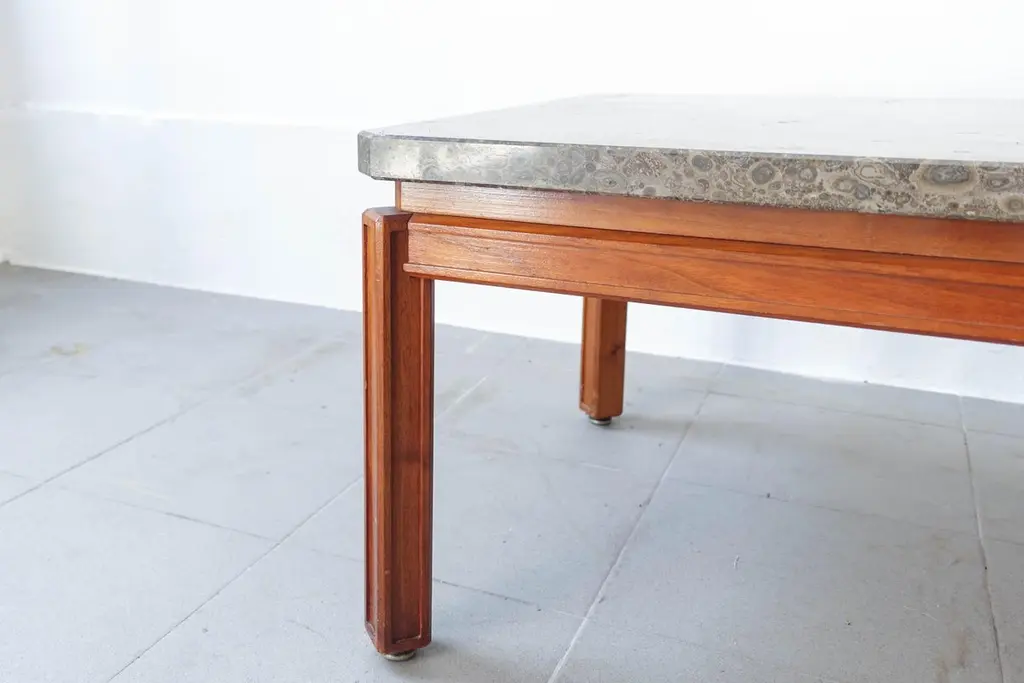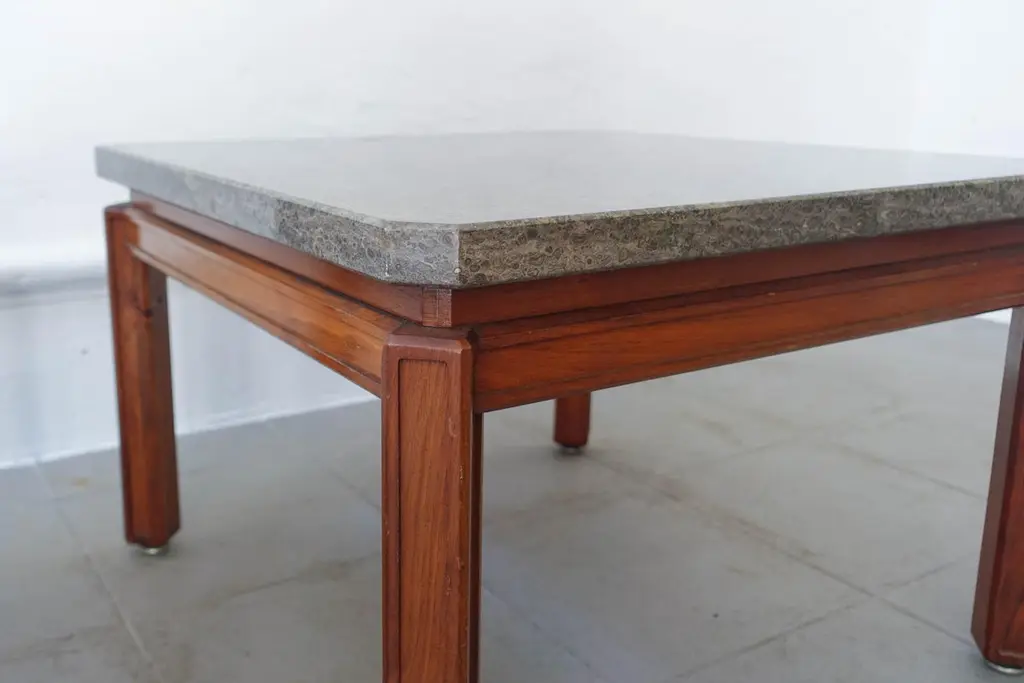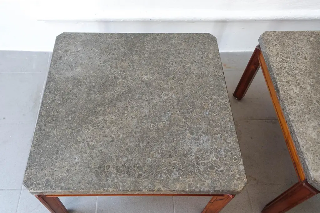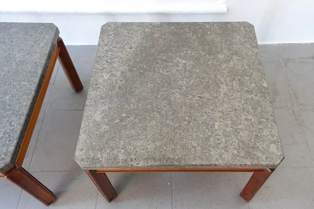 This stunning side table, designed by José Espinho and produced by Móveis Sousa Braga and Móveis Olaio in Portugal, is an exceptional example of 1970s Portuguese design. The "Model Export" was specifically created for the prestigious Estoril Sol Hotel, near Lisbon, during the 1970s, blending functionality with the elegance of modernist design.The table's structure is crafted from a combination of mutenye and kiaat wood, showcasing the beautiful grain and warmth of these premium materials. The top features a unique Portuguese marble known as "Pedra-azul de Cascais", adding a touch of luxury and distinction to the piece. The marble retains its original condition, while the wood structure has been fully restored, ensuring the table is in very good condition overall.With its sleek design and luxurious materials, this side table is not only a functional piece but also a statement of mid-century modern style. It would be a perfect addition to any living space, whether used as a side table, accent piece, or nightstand.Two tables are available, and the price is for one piece. Don't miss this rare opportunity to own a beautifully restored piece of Portuguese design history from one of the most iconic hotel commissions of the 1970s.