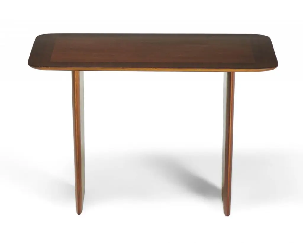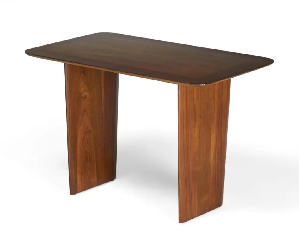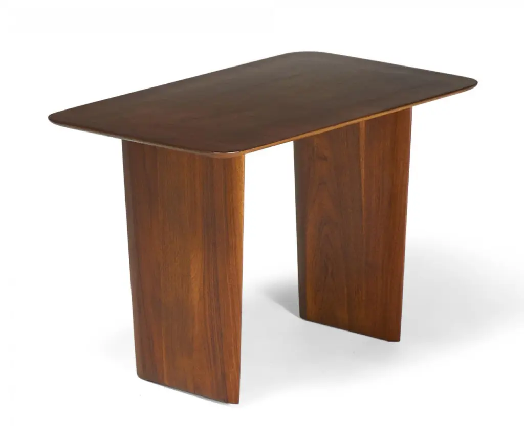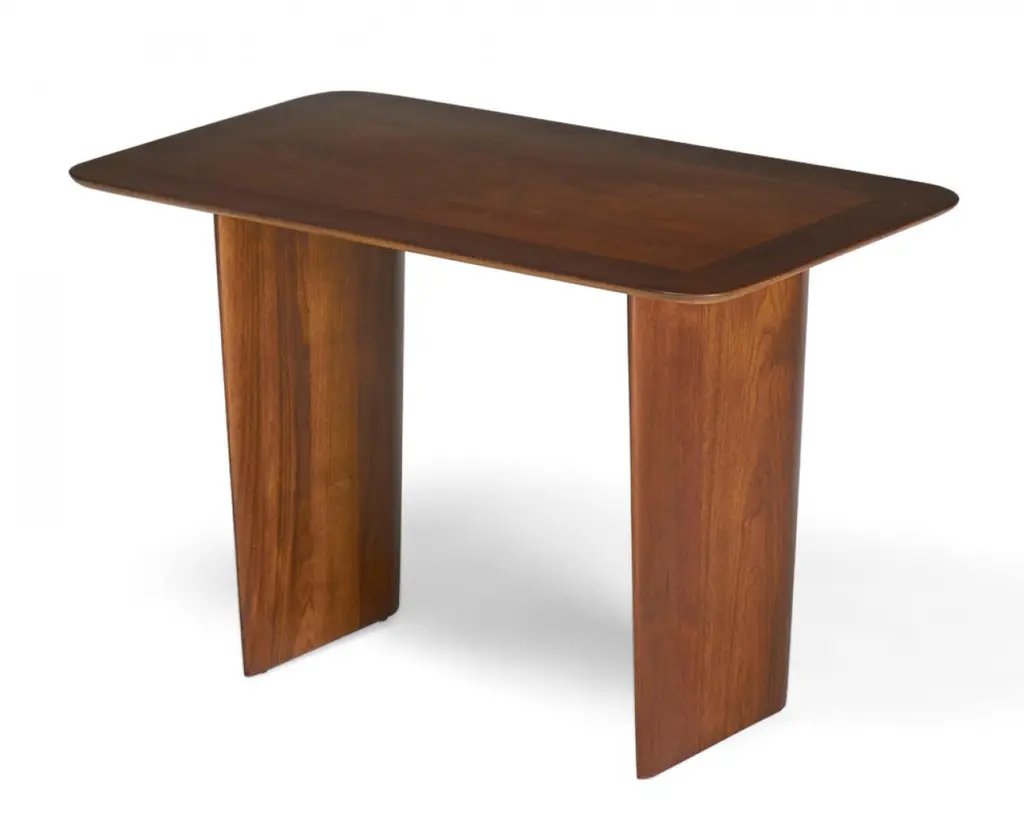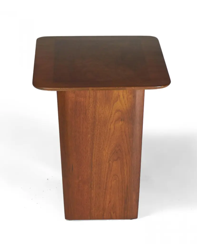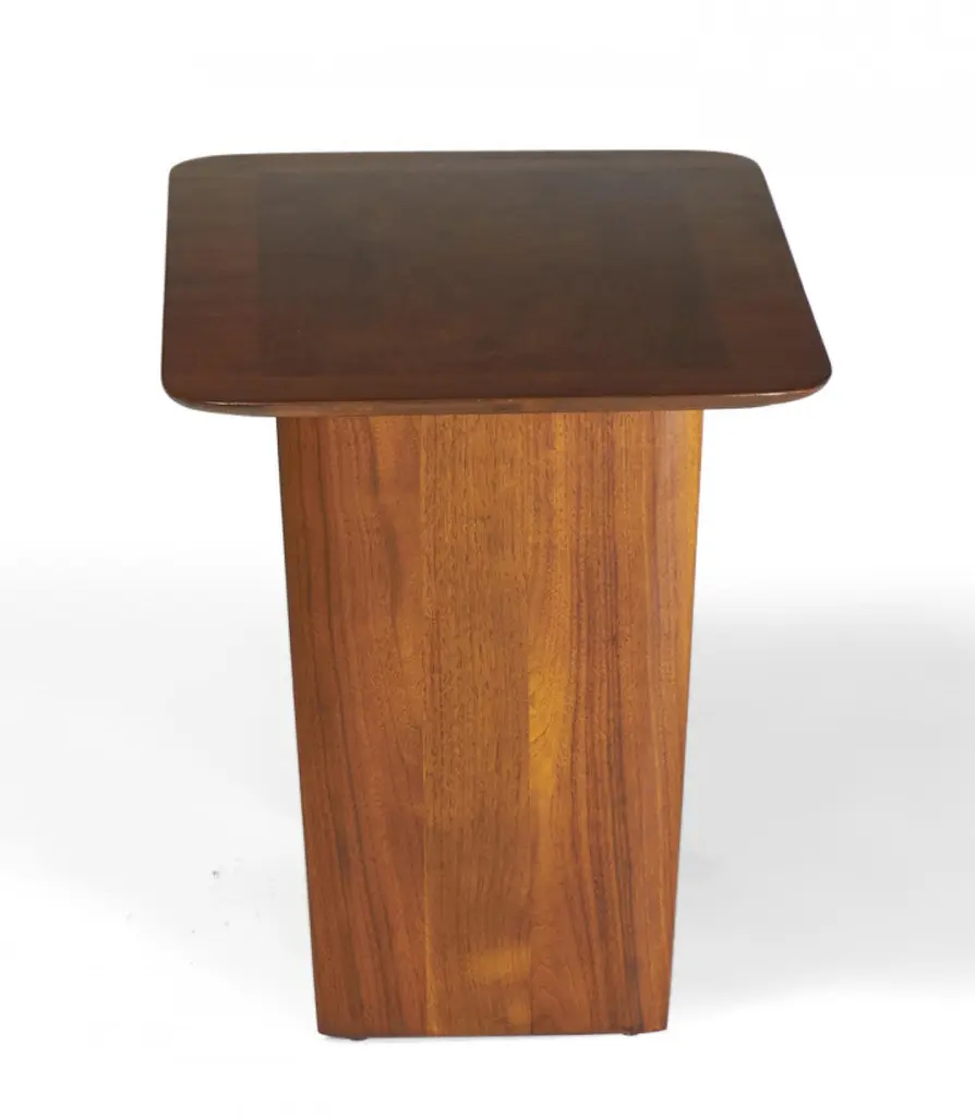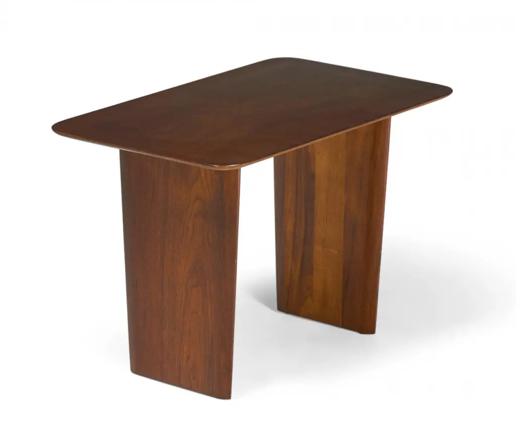 American Mid-Century (circa 1955) walnut occasional / end tables with rectangular tops with rounded corners supported by two wide solid wood legs. (T.H. ROBSJOHN-GIBBINGS FOR WIDDICOMB FURNITURE)(PRICED AS PAIR)