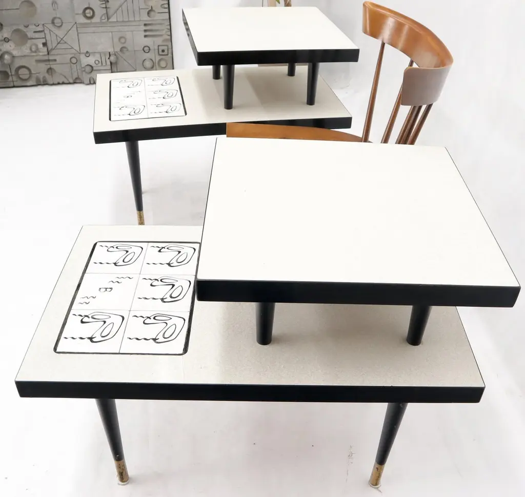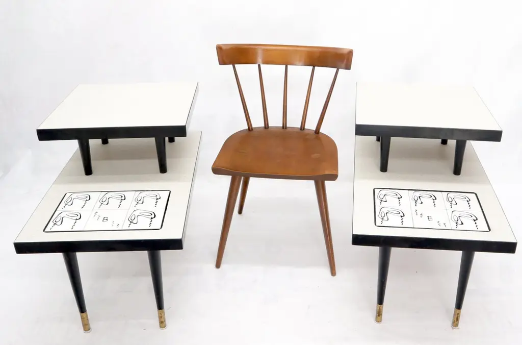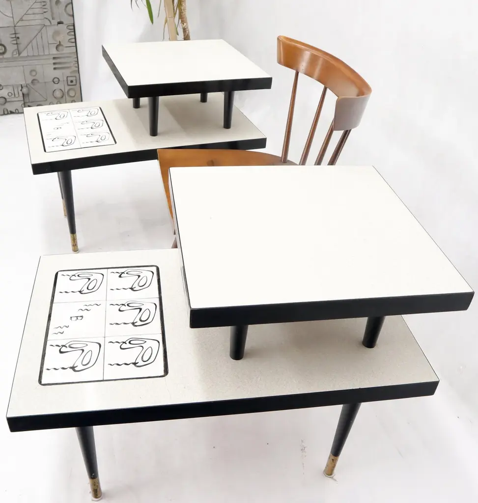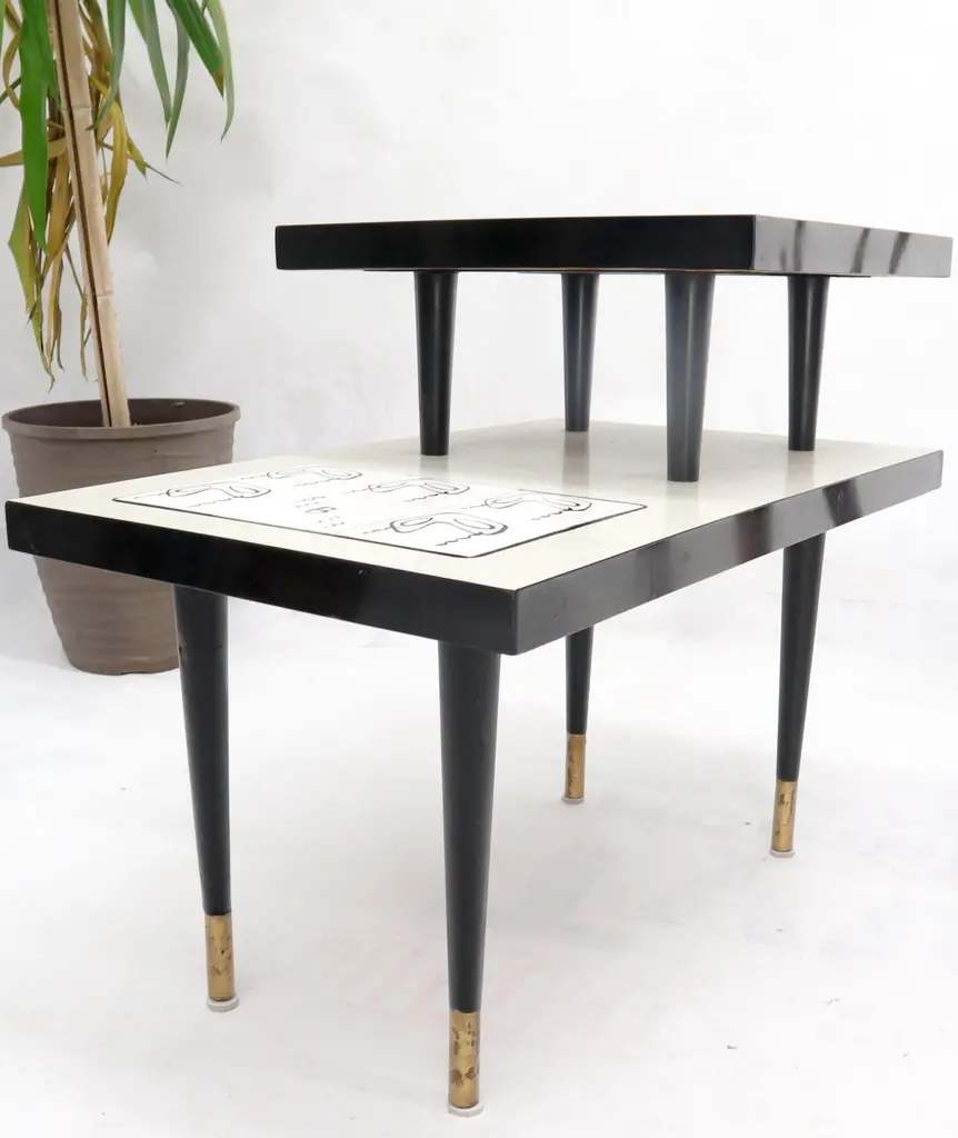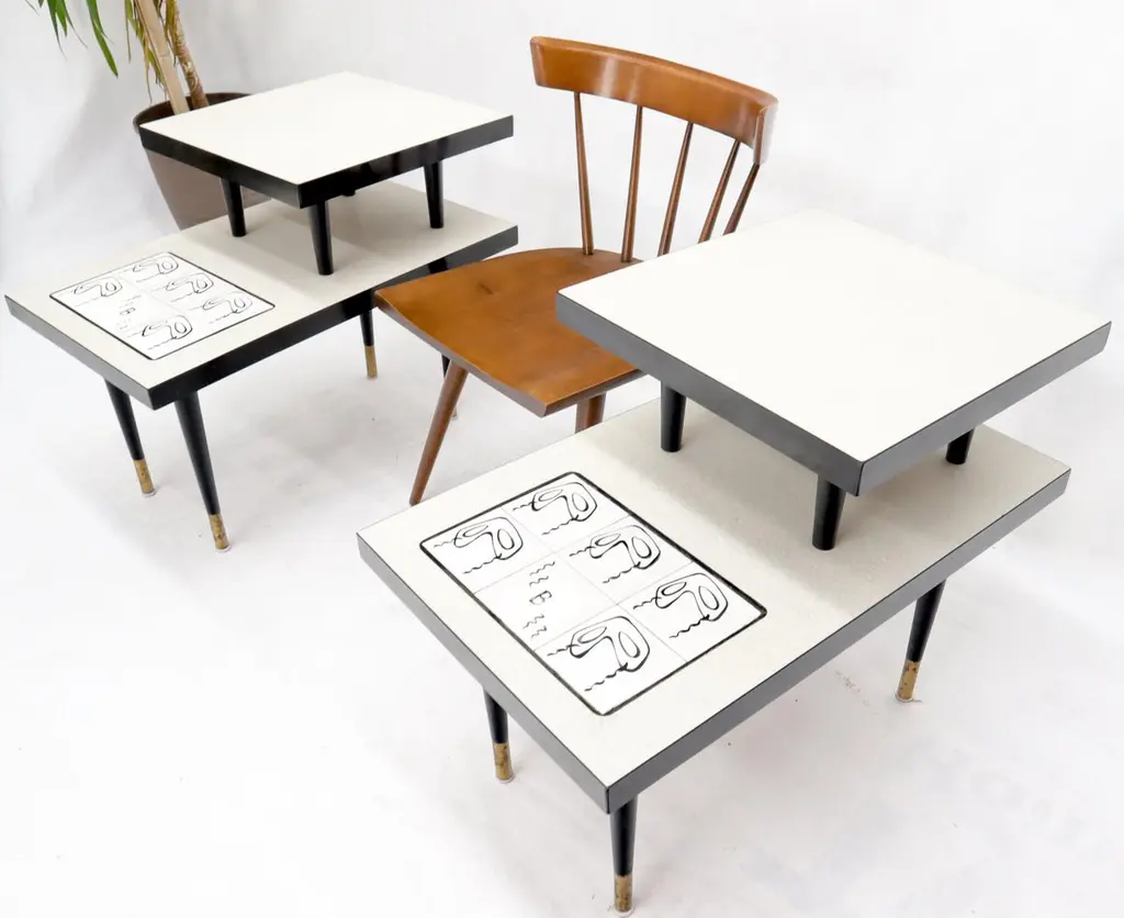Pair Of Tile Top Step End Side Table On Tapered Dowel Shape Leg