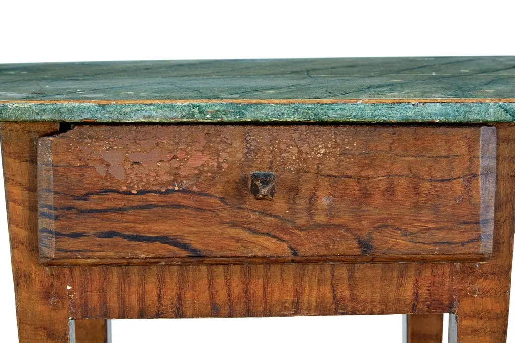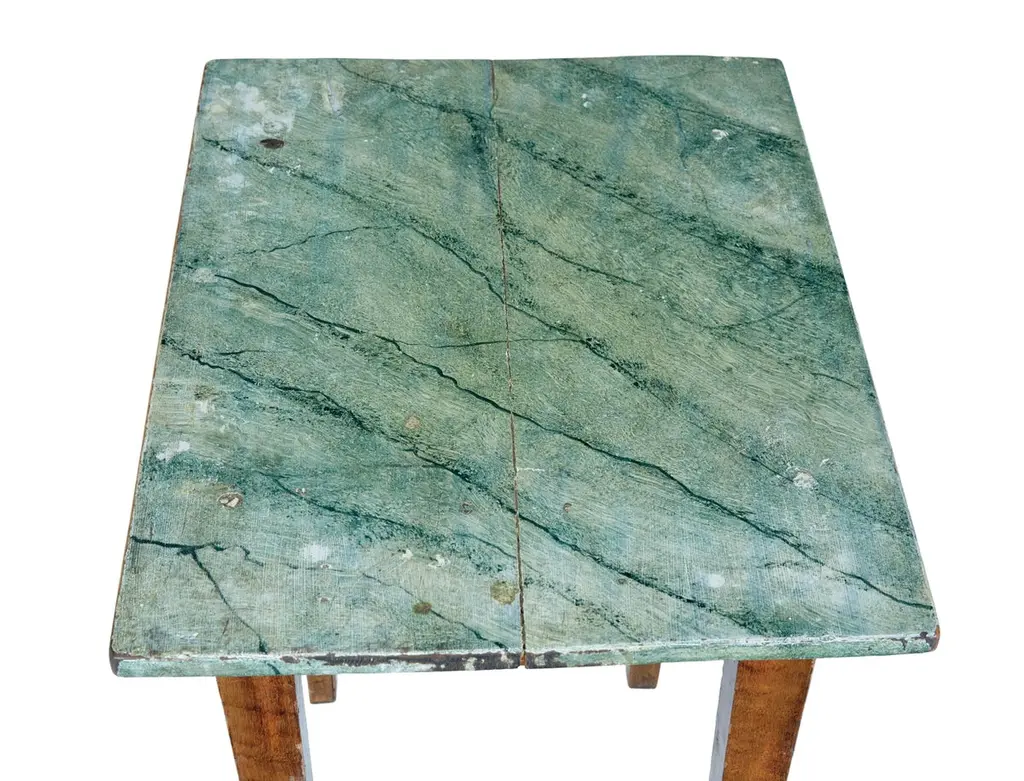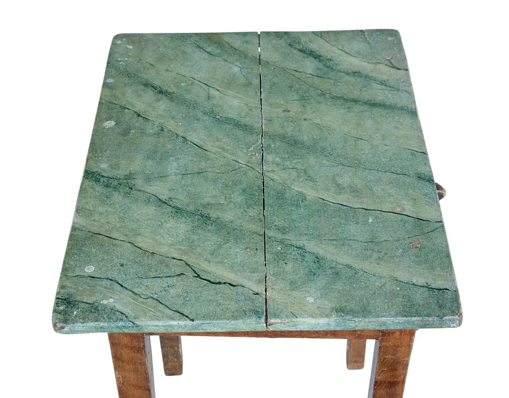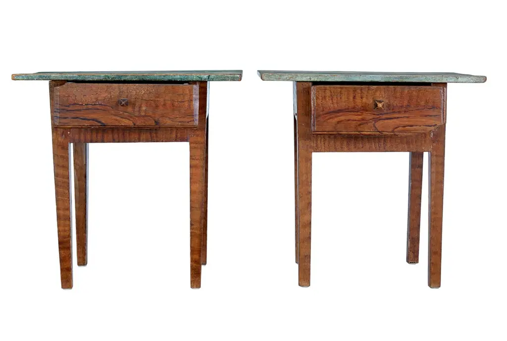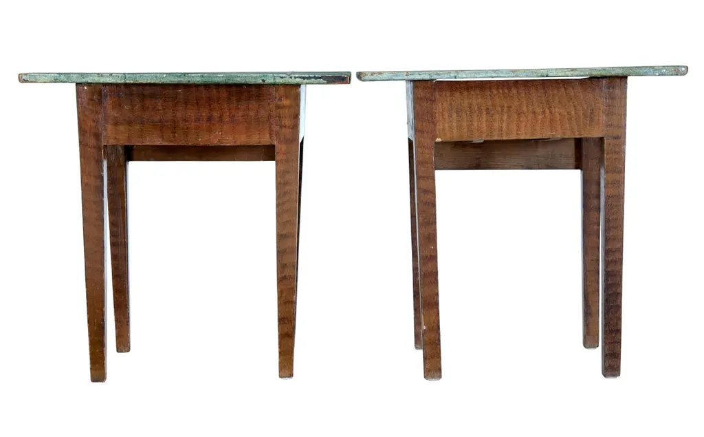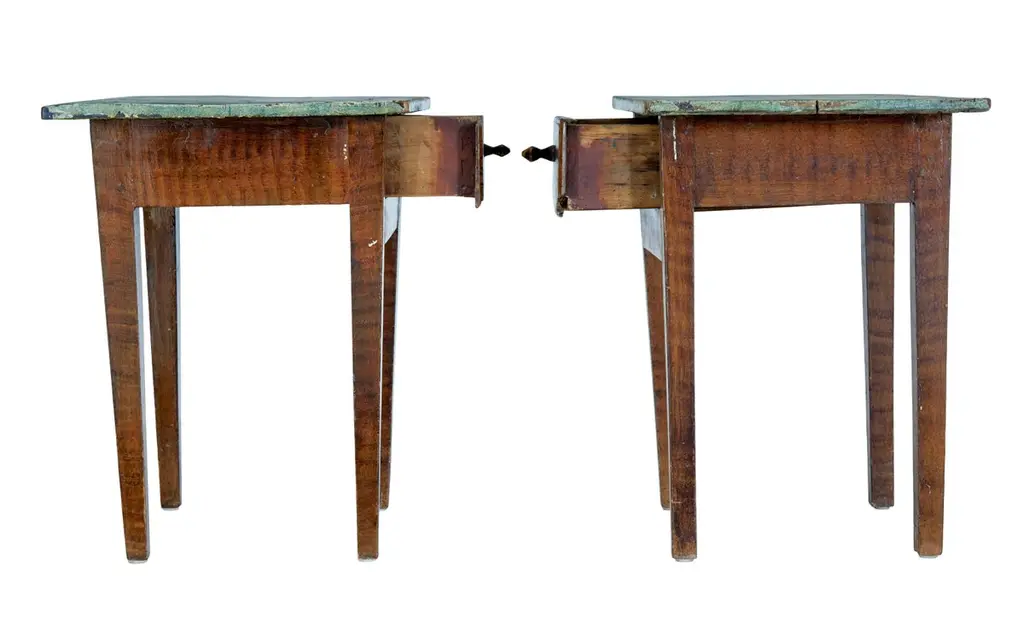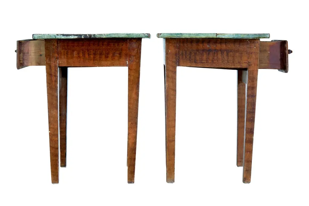 Pair of traditional painted Swedish side tables, circa 1870.Rare pair of rural Swedish side tables, which we found on our travels around Sweden. Hand painted in traditional colours using traditional methods of hand applied rag work design.Over sailing rectangular 2 plank pine tops, in a green base paint with hand painted veining and tone. Below which each table has a single drawer with carved knob handle, standing on straight legs. These have been hand painted to simulate wood grain.Ideal for use as a pair of lamp tables or even as bedside tables.Expected minor shrinkage and losses to paintwork. There is some losses to the corner of the drawer fronts, but this doesn't effect their function and its important to keep them in their original condition.